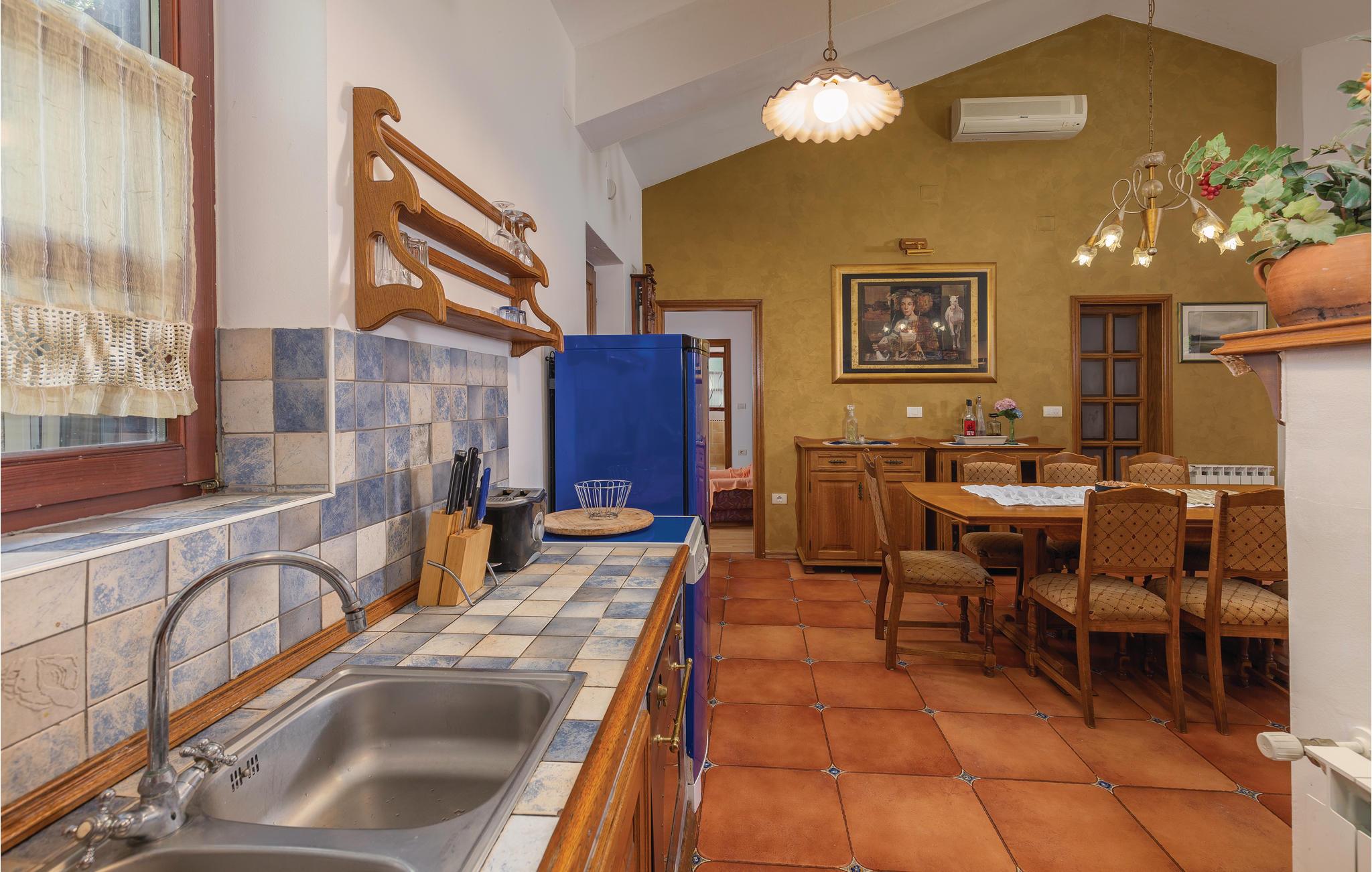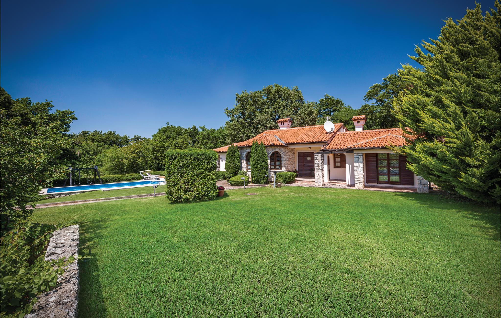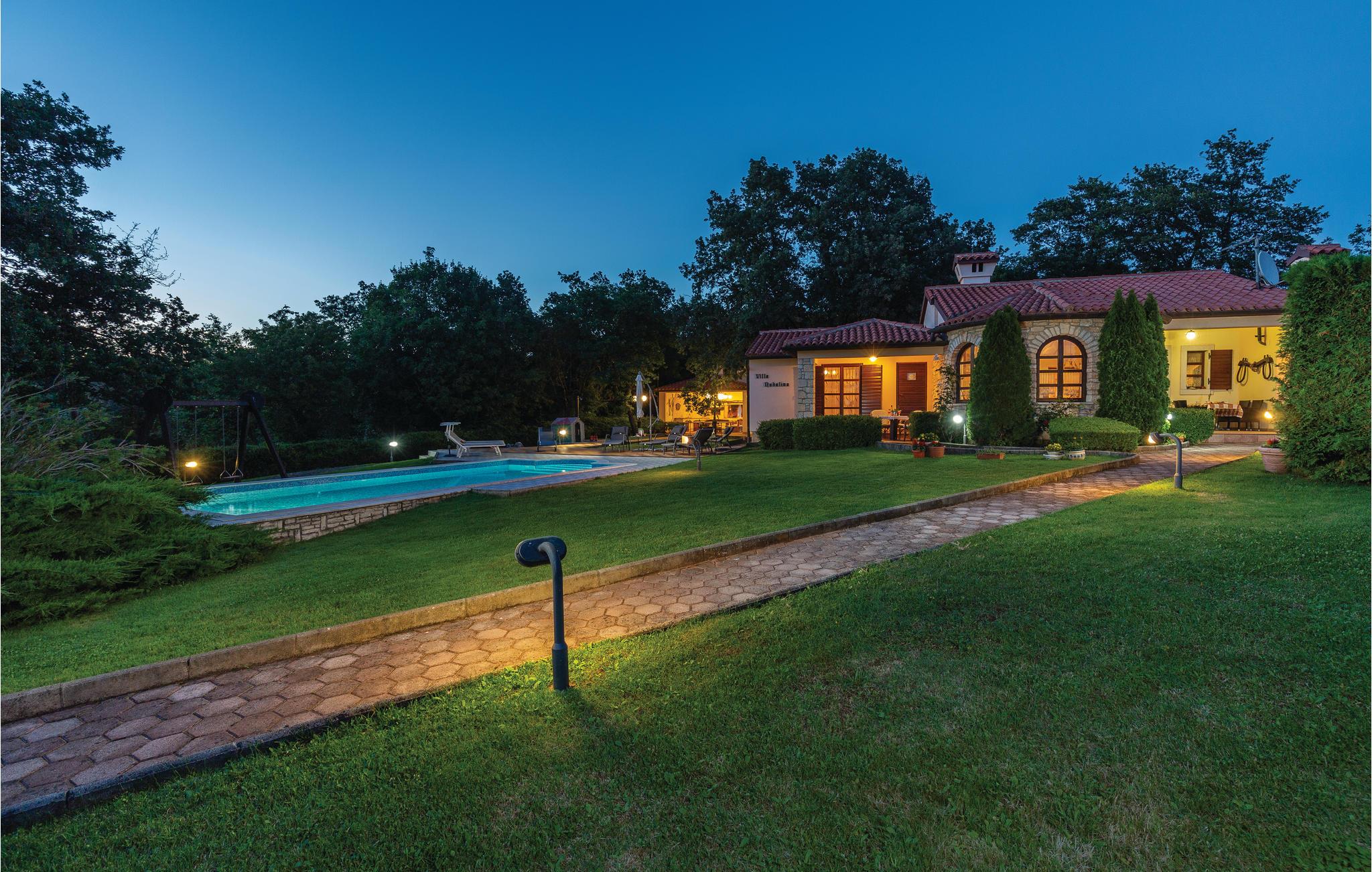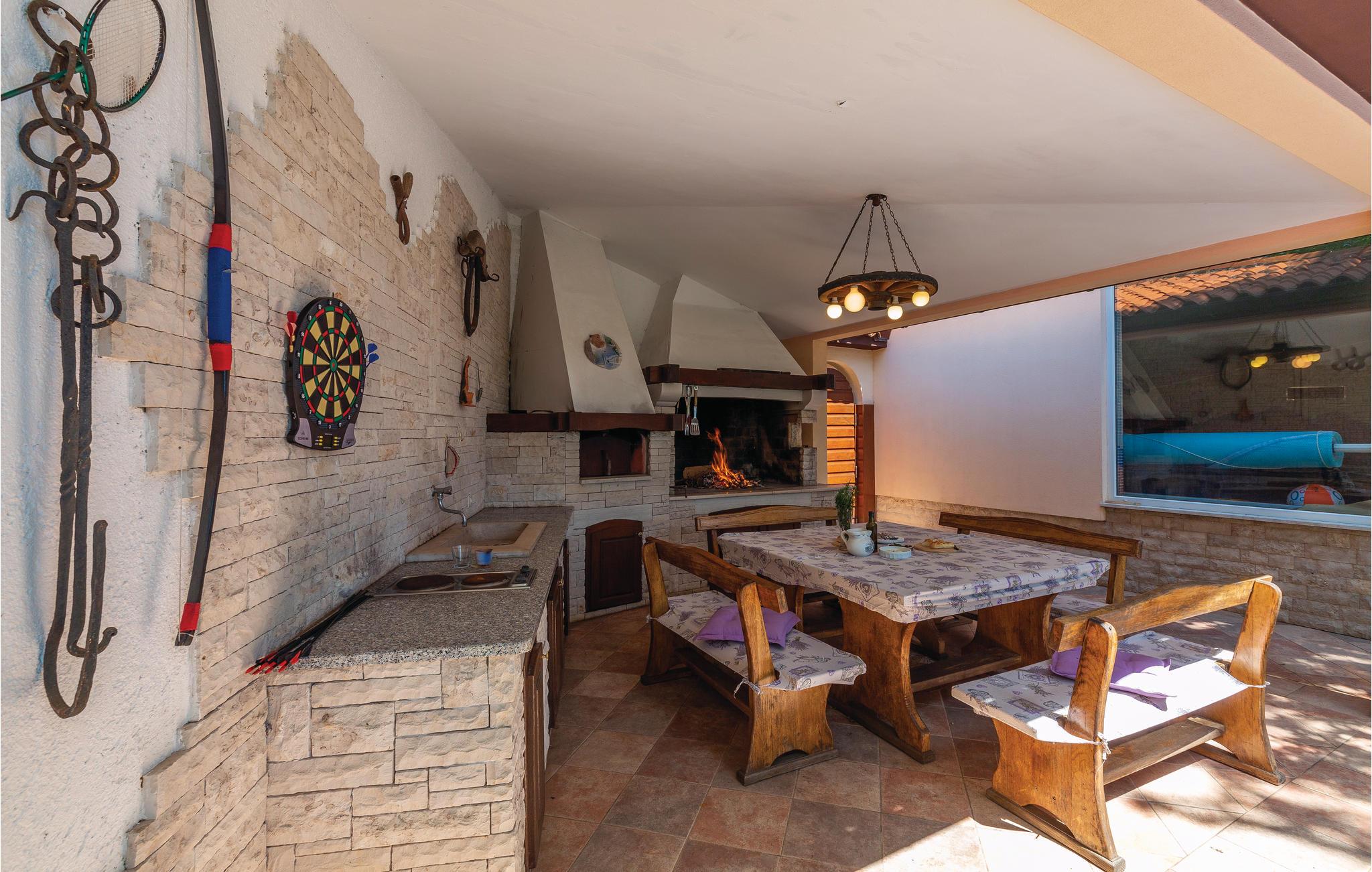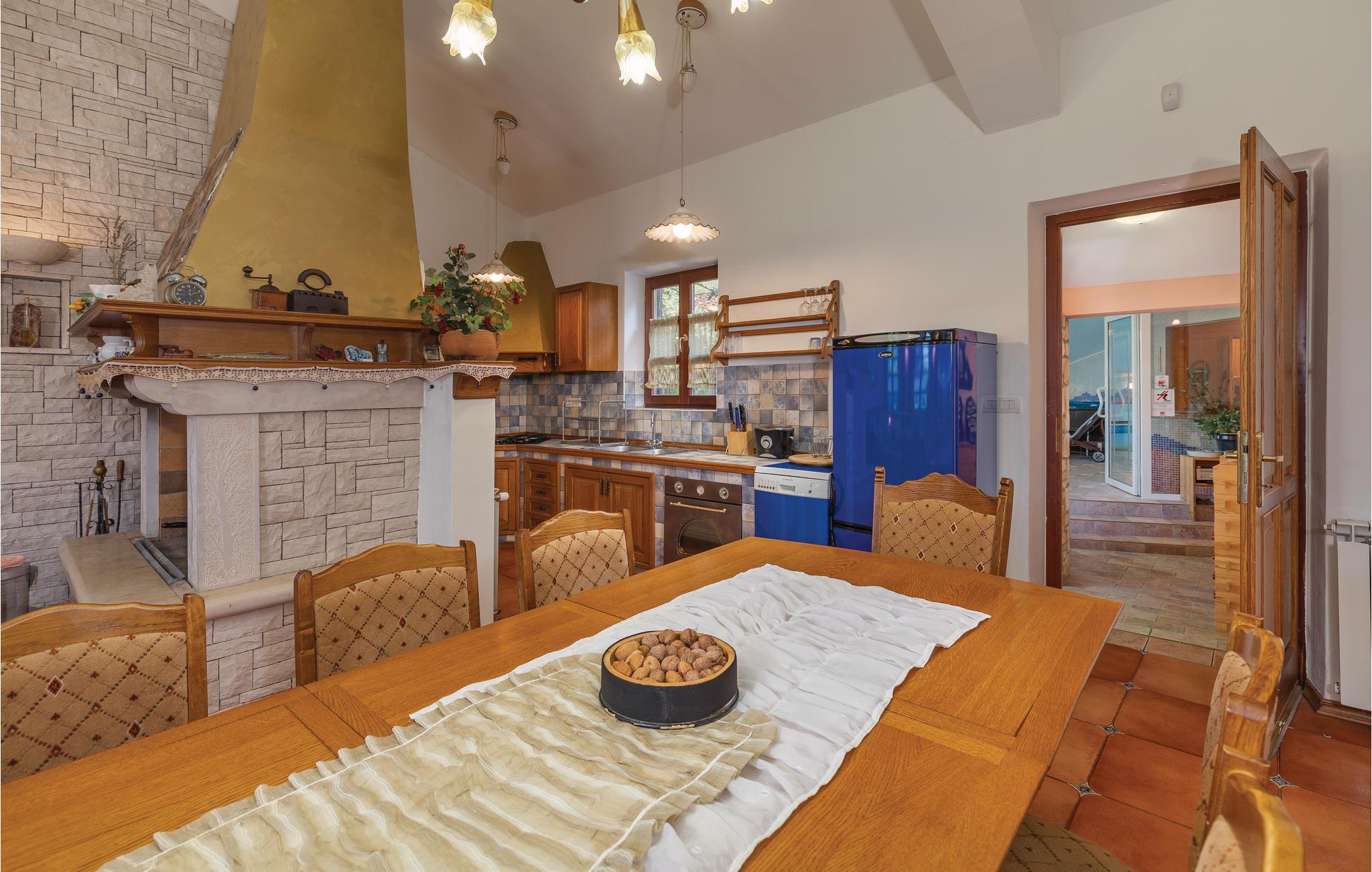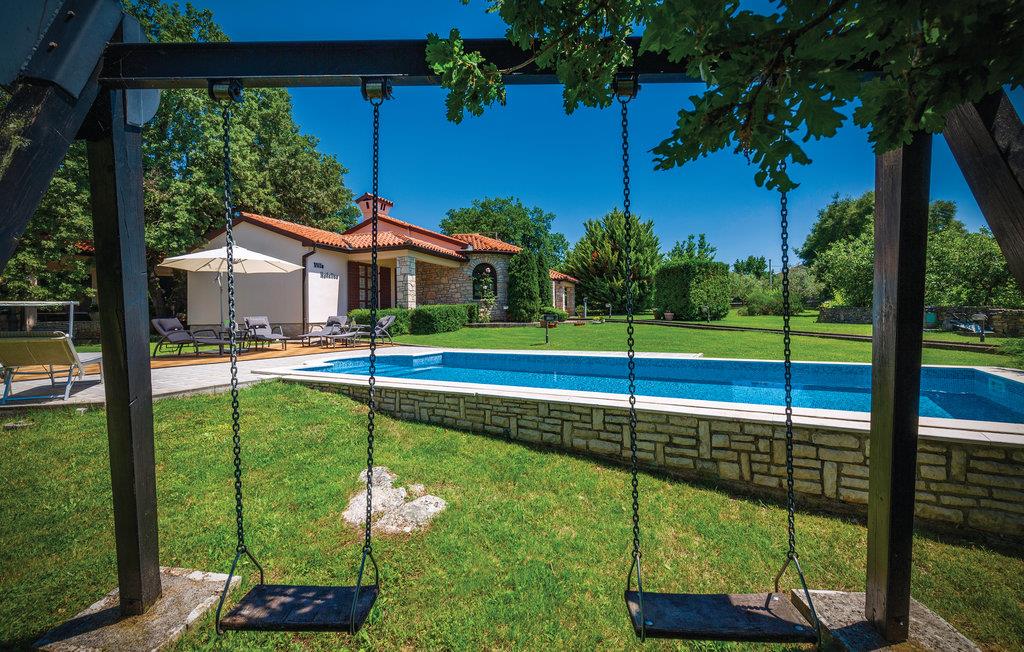Moderne feriehus omgivet af herlig natur og en stor have i hvilken der er en dejlig pool. Det hyggeligt indrettede hus har meget at byde på både inde og ude. I huset er der tre soveværelser med hver sit tilhørende badeværelse, et veludstyret køkken med stenovn og et stort spisebord. Skal I slappe af, så prøv den opvarmede indendørs pool, spa med massagefunktion til 5 personer og saunaen med ekstra badeværelse. Er det en varm sommerdag er det nok den store pool udenfor der er mest tillokkende, her kan I køle jer af i det klare vand. Mens I nyder det afslappede liv, kan børnene gynge eller more sig i legehuset. Der er mulighed for at få trådløs internetopkobling, så I kan holde jer ajour med hvad der sker i verden og holde kontakt med familien og vennerne. På den overdækkede terrasse kan I nyde en god bog og udsigten over den smukke natur, eller I kan forsøge jer med det istriske køkken i det overdækkede sommerkøkken med muret grill. I en radius på bare 10 km er der mange muligheder for spændende aktiviteter i ferien. Hvad med at lære Istrien at kende fra firhjulet crosser eller fra hesteryg? Der er også mulighed for at tage en kajaktur og således opleve omgivelserne fra en anden vinkel. Huset er et godt udgangspunkt for cykel-og vandreture. Besøg nærliggende strande og bugter, og Labin med mange kunstgallerier og smuk venetiansk arkitektur. Her ligger også Rabac med de pragtfulde sandstrande og det krystalklare adriaterhav. Snup en kop kaffe og en velsmagende kage på promenaden. Nyd også husets dejlige udendørs pool. I S3 er der et lille tekøkken.