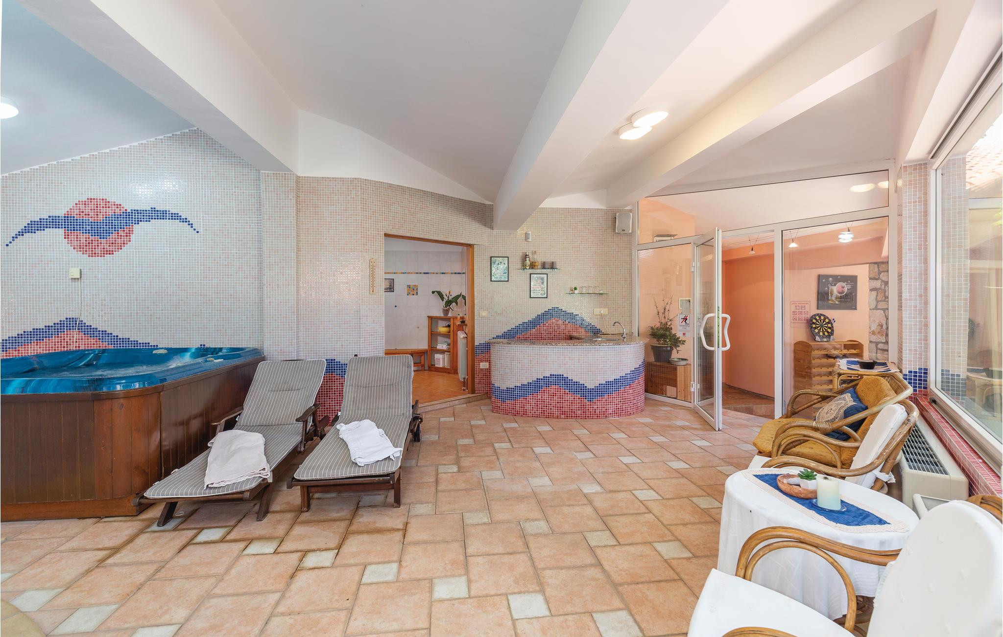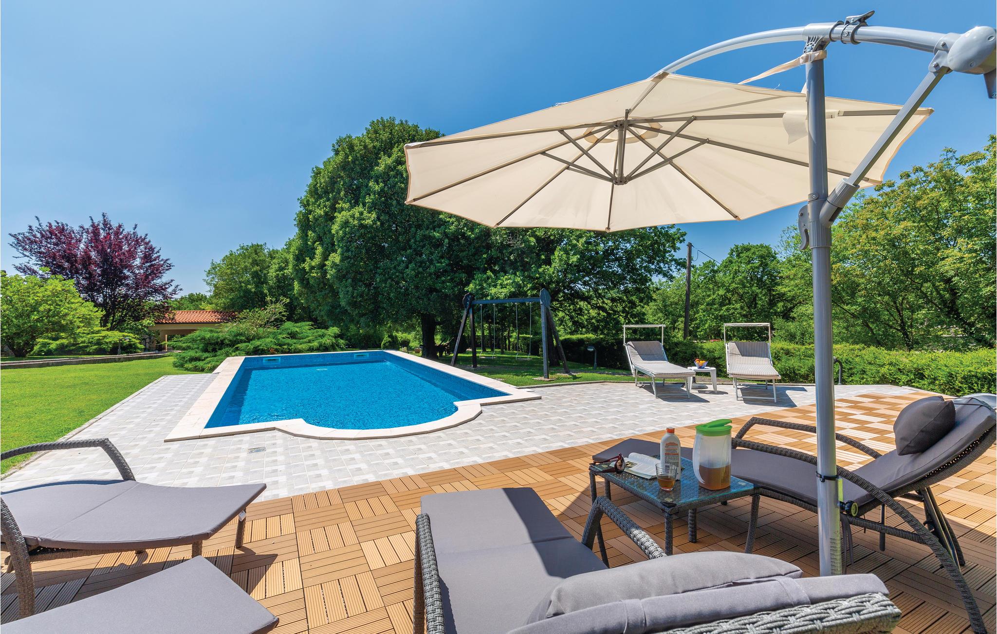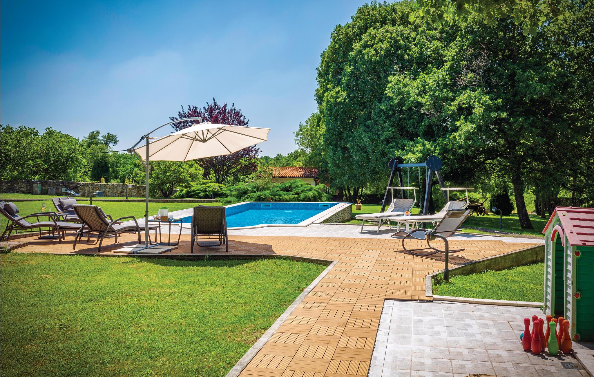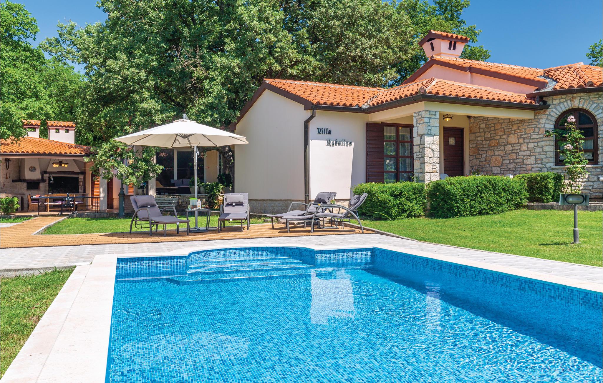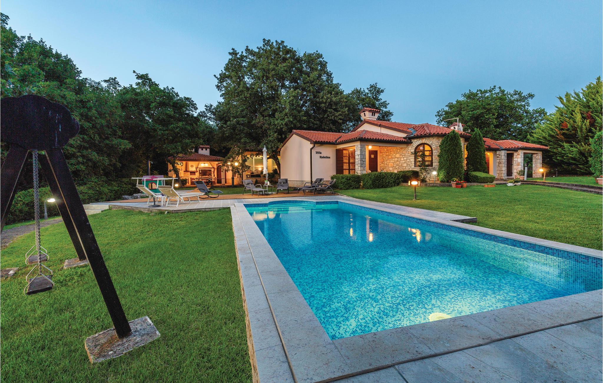 Moderne feriehus omgivet af herlig natur og en stor have i hvilken der er en dejlig pool. Det hyggeligt indrettede hus har meget at byde på både inde og ude. I huset er der tre soveværelser med hver sit tilhørende badeværelse, et veludstyret køkken med stenovn og et stort spisebord. Skal I slappe af, så prøv den opvarmede indendørs pool, spa med massagefunktion til 5 personer og saunaen med ekstra badeværelse. Er det en varm sommerdag er det nok den store pool udenfor der er mest tillokkende, her kan I køle jer af i det klare vand. Mens I nyder det afslappede liv, kan børnene gynge eller more sig i legehuset. Der er mulighed for at få trådløs internetopkobling, så I kan holde jer ajour med hvad der sker i verden og holde kontakt med familien og vennerne. På den overdækkede terrasse kan I nyde en god bog og udsigten over den smukke natur, eller I kan forsøge jer med det istriske køkken i det overdækkede sommerkøkken med muret grill. I en radius på bare 10 km er der mange muligheder for spændende aktiviteter i ferien. Hvad med at lære Istrien at kende fra firhjulet crosser eller fra hesteryg? Der er også mulighed for at tage en kajaktur og således opleve omgivelserne fra en anden vinkel. Huset er et godt udgangspunkt for cykel-og vandreture. Besøg nærliggende strande og bugter, og Labin med mange kunstgallerier og smuk venetiansk arkitektur. Her ligger også Rabac med de pragtfulde sandstrande og det krystalklare adriaterhav. Snup en kop kaffe og en velsmagende kage på promenaden. Nyd også husets dejlige udendørs pool. I S3 er der et lille tekøkken.