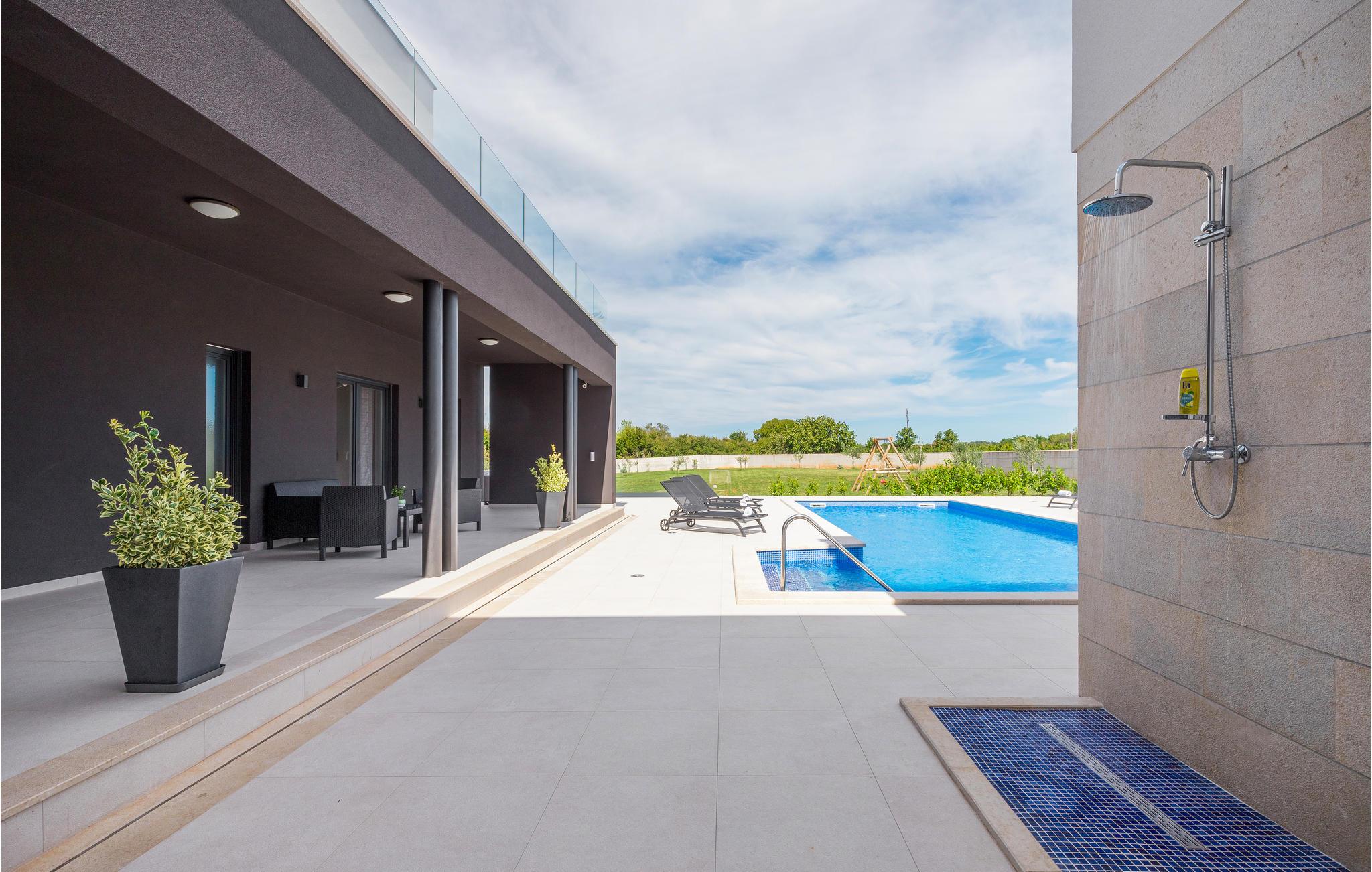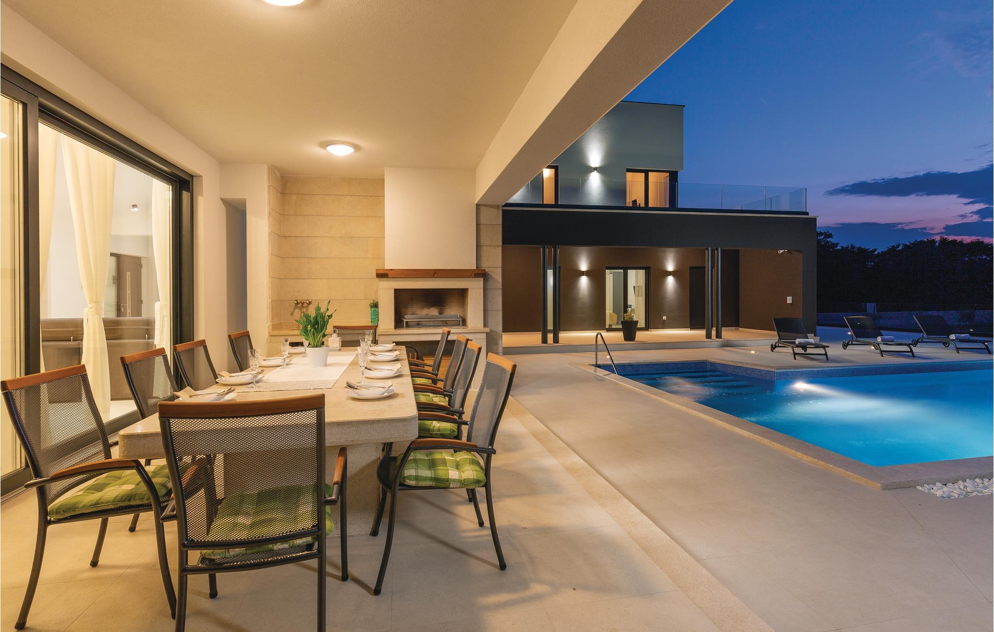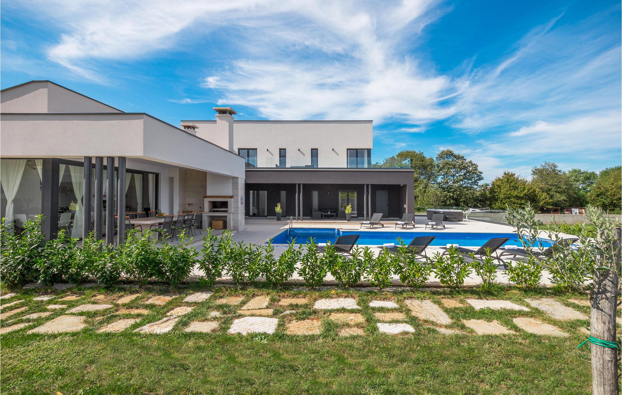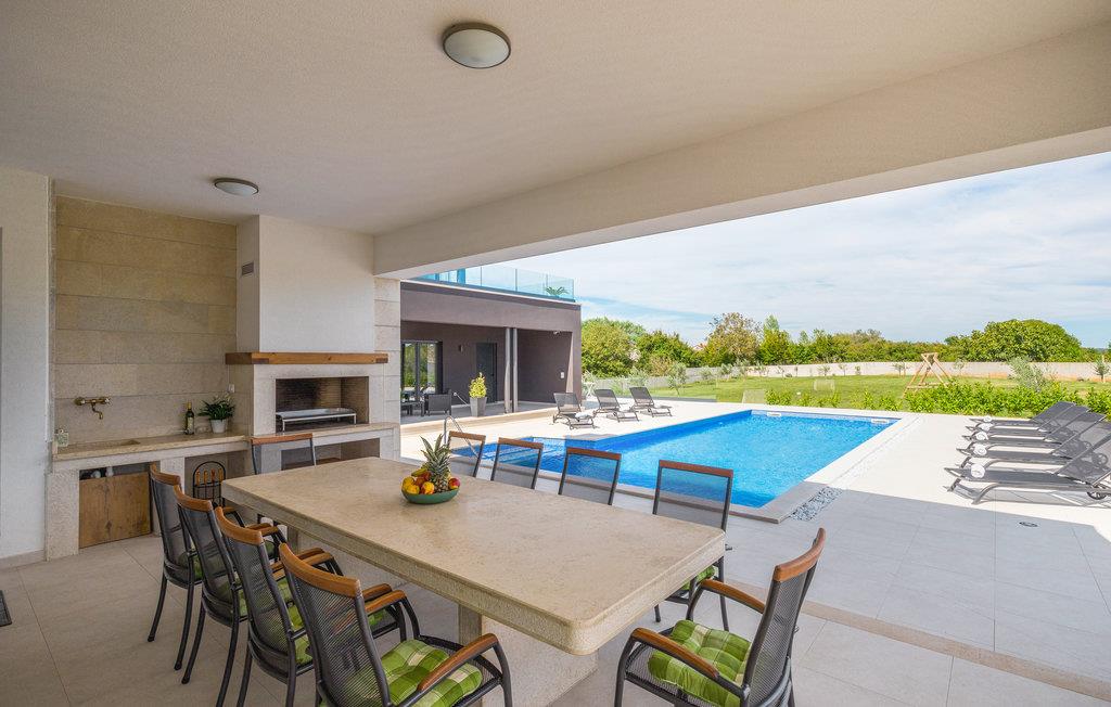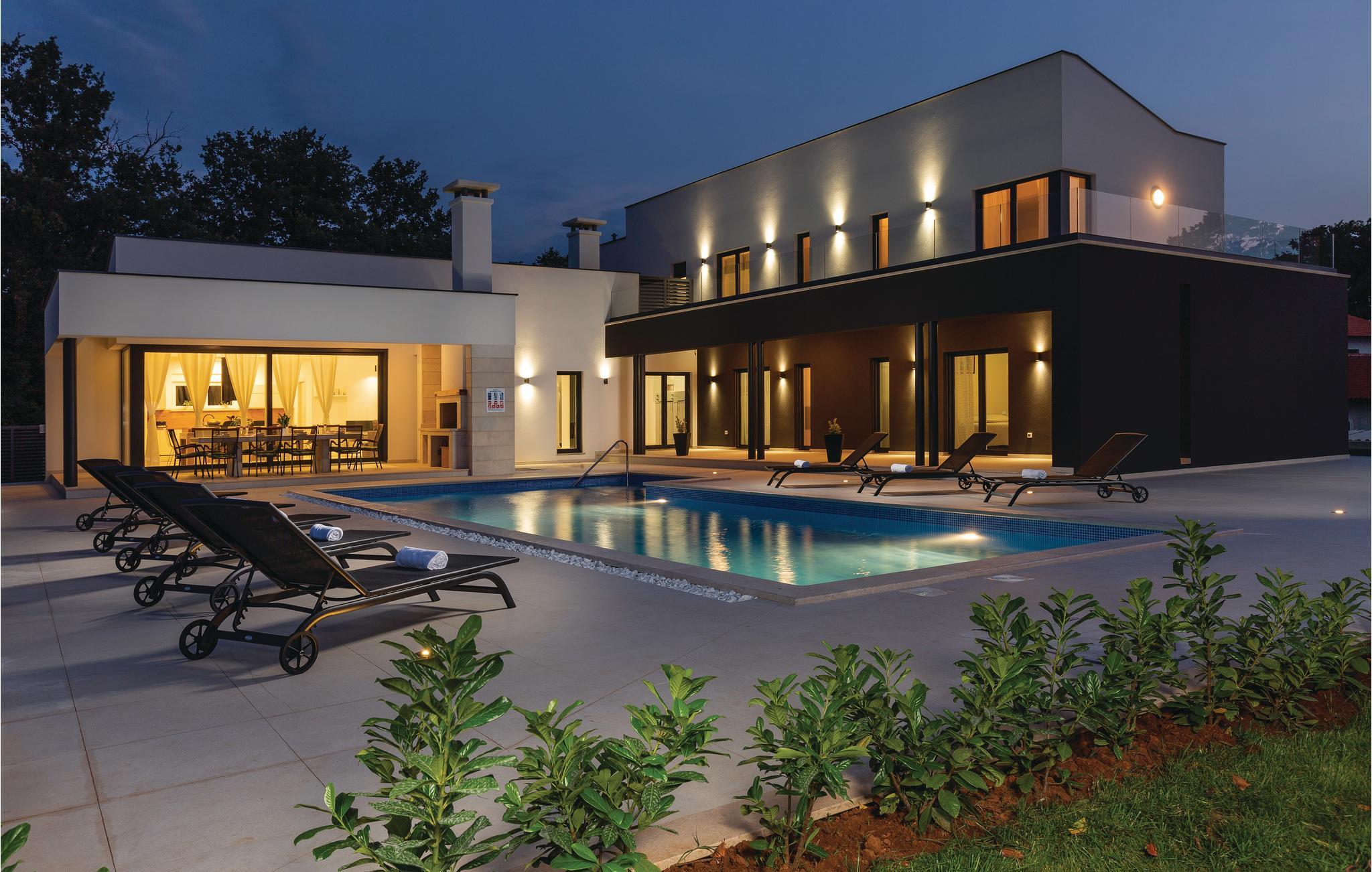 Dette moderne feriehus er beliggende i den lille landsby Kujici. Den spændende moderne arkitektur som bygningen er udført i komplementeres af den elegante indretning og byder på maksimal komfort i jeres ferie. I stueetagen findes en rummelig opholdsstue med egen skøn terrasse med grill, hvor I om aftenen kan nyde et glas vin. Der er to soveværelser med en suite badeværelse, en sauna og et fitnessrum. Terrassen ligger ned til en dejlig stor swimmingpool, hvor I kan tage en forfriskende dukkert midt i sommerdagenes hede. Børnene vil sætte pris på den indhegnede gruind hvor de kan lege uforstyret med de legeredskaber der findes her. På første etage er der yderligere tre soveværelser ed egne badeværelser samt en dejligt stor balkon.