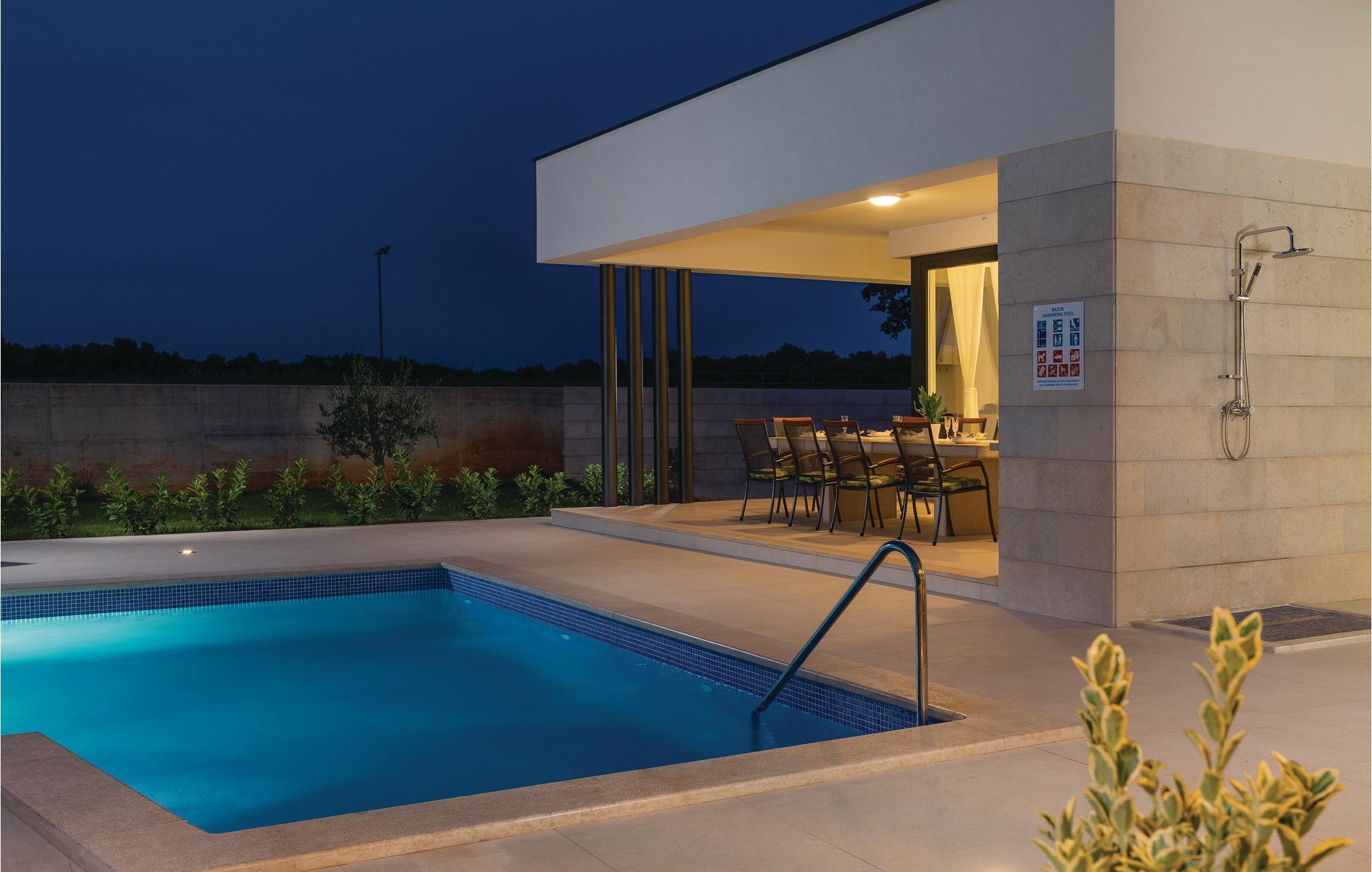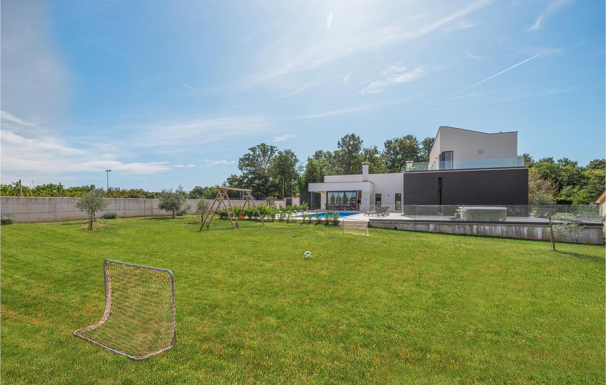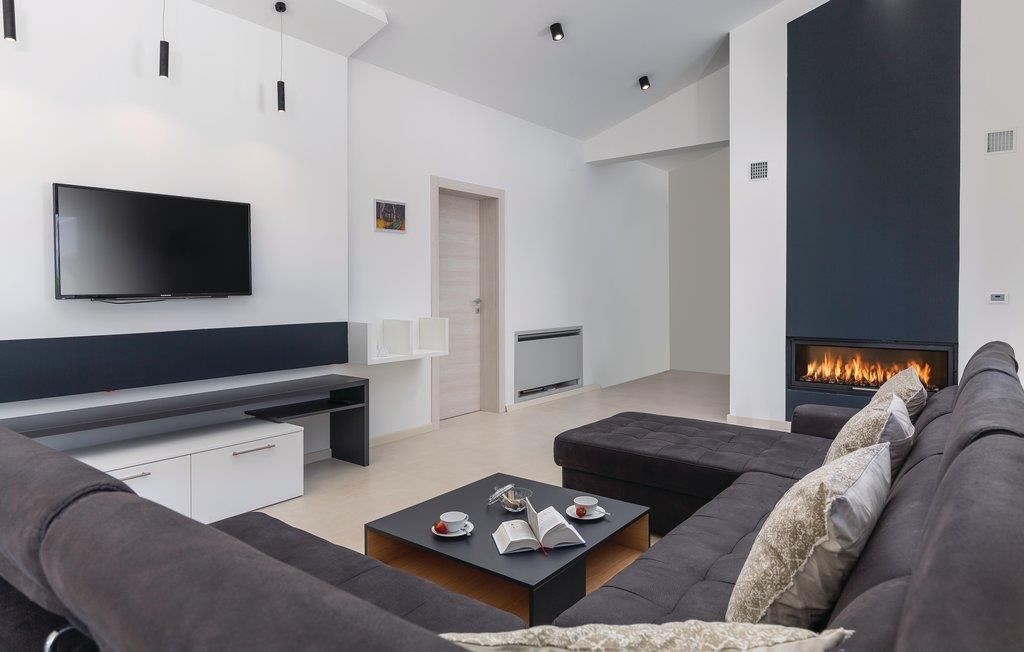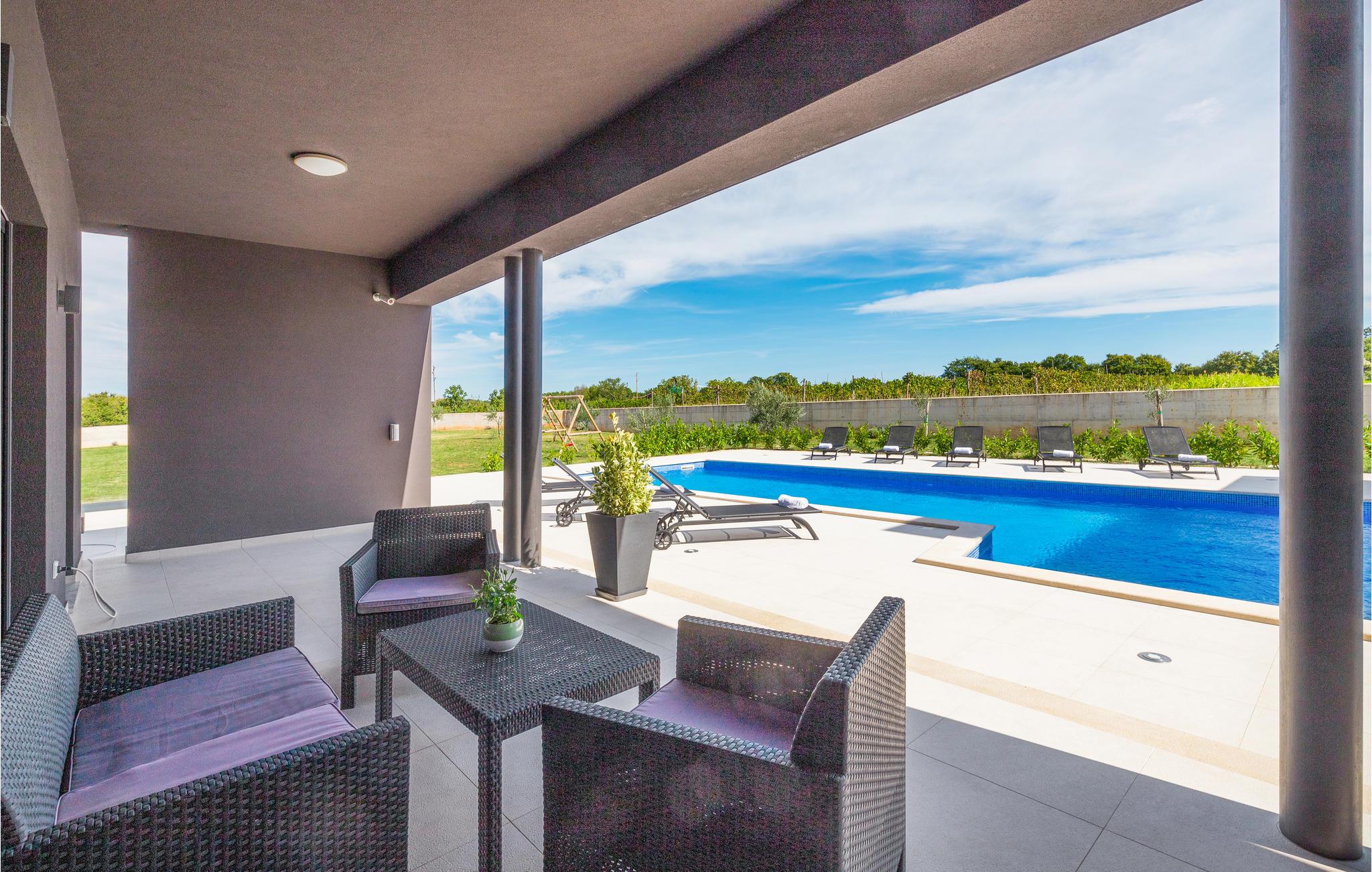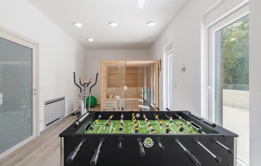 Dette moderne feriehus er beliggende i den lille landsby Kujici. Den spændende moderne arkitektur som bygningen er udført i komplementeres af den elegante indretning og byder på maksimal komfort i jeres ferie. I stueetagen findes en rummelig opholdsstue med egen skøn terrasse med grill, hvor I om aftenen kan nyde et glas vin. Der er to soveværelser med en suite badeværelse, en sauna og et fitnessrum. Terrassen ligger ned til en dejlig stor swimmingpool, hvor I kan tage en forfriskende dukkert midt i sommerdagenes hede. Børnene vil sætte pris på den indhegnede gruind hvor de kan lege uforstyret med de legeredskaber der findes her. På første etage er der yderligere tre soveværelser ed egne badeværelser samt en dejligt stor balkon.
