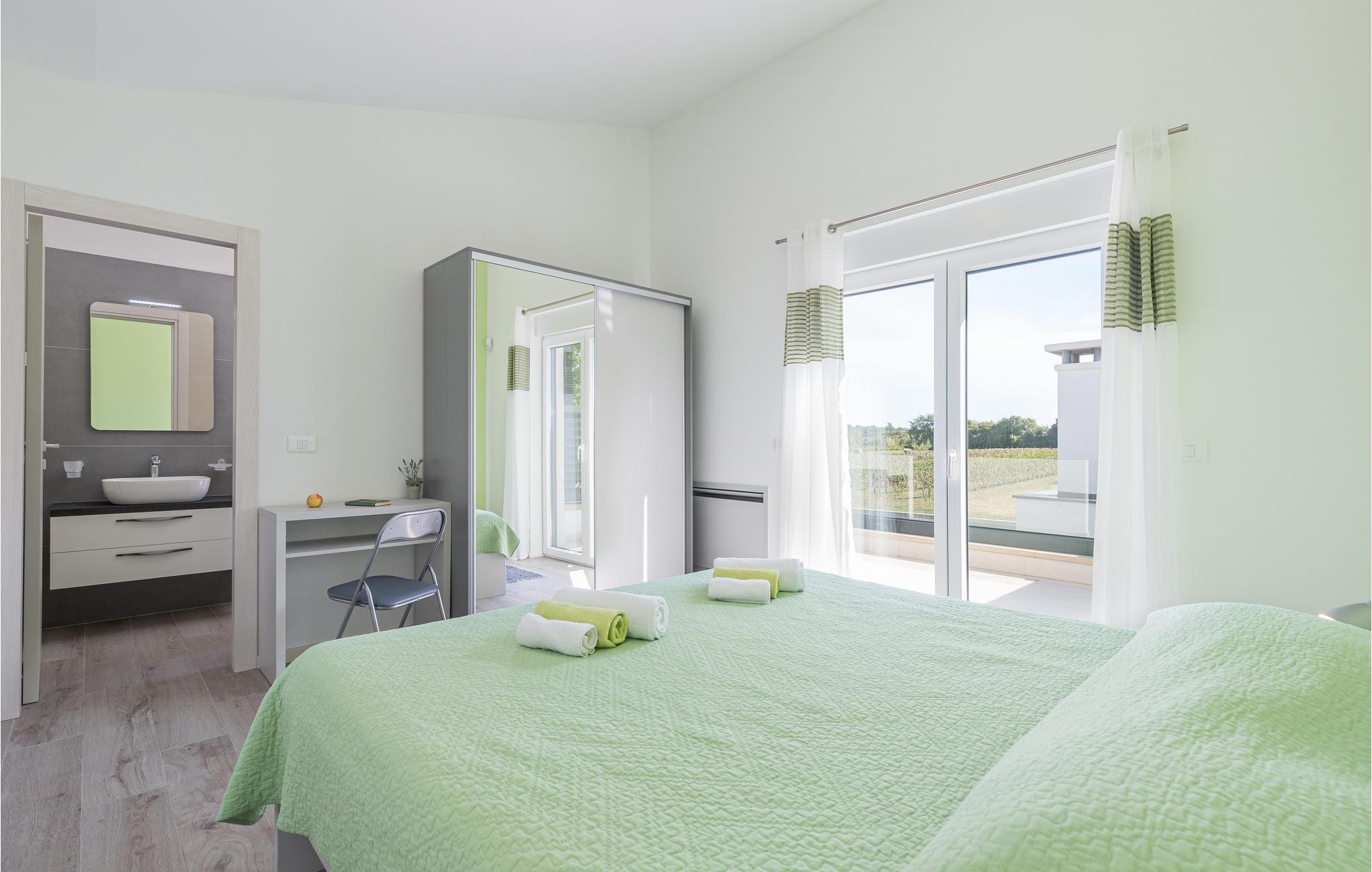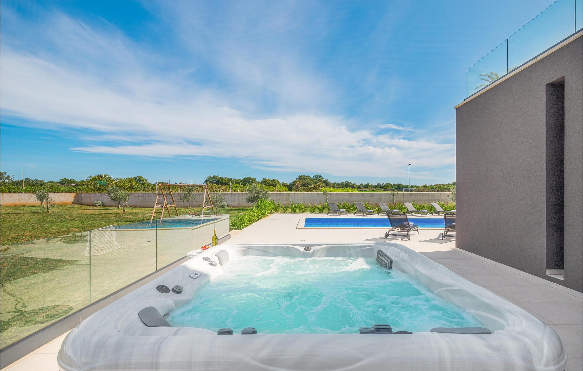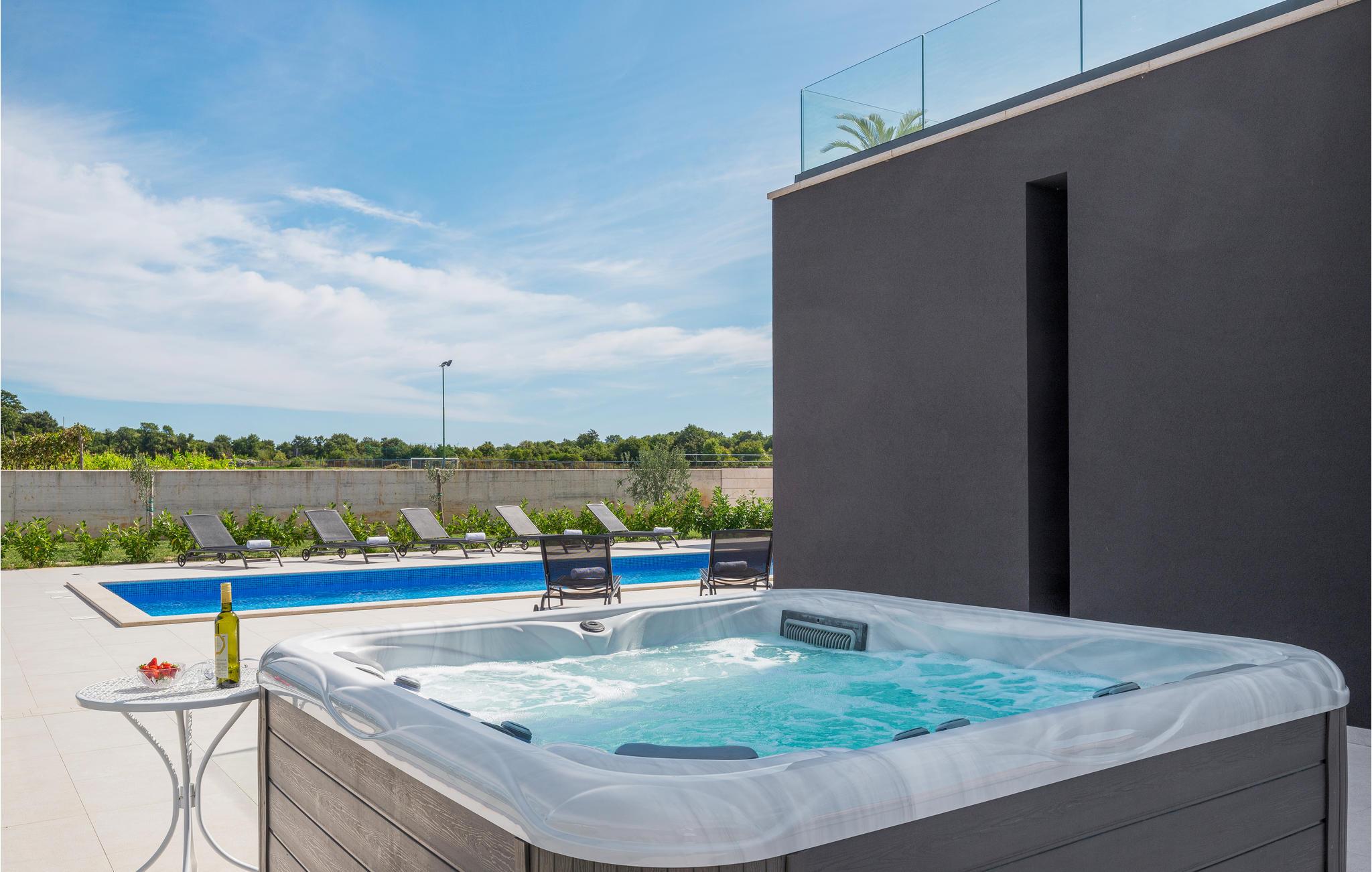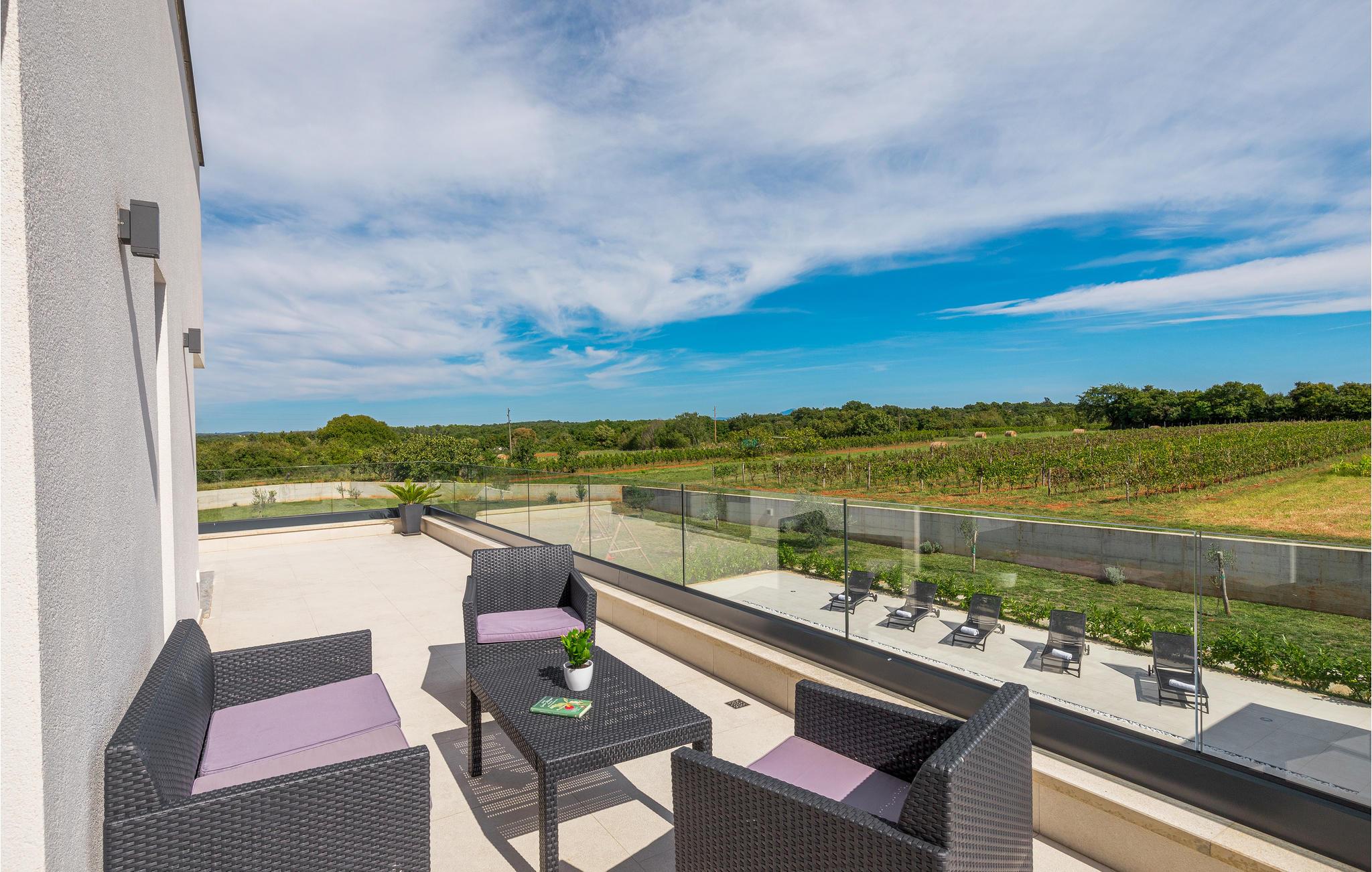 Dette moderne feriehus er beliggende i den lille landsby Kujici. Den spændende moderne arkitektur som bygningen er udført i komplementeres af den elegante indretning og byder på maksimal komfort i jeres ferie. I stueetagen findes en rummelig opholdsstue med egen skøn terrasse med grill, hvor I om aftenen kan nyde et glas vin. Der er to soveværelser med en suite badeværelse, en sauna og et fitnessrum. Terrassen ligger ned til en dejlig stor swimmingpool, hvor I kan tage en forfriskende dukkert midt i sommerdagenes hede. Børnene vil sætte pris på den indhegnede gruind hvor de kan lege uforstyret med de legeredskaber der findes her. På første etage er der yderligere tre soveværelser ed egne badeværelser samt en dejligt stor balkon.