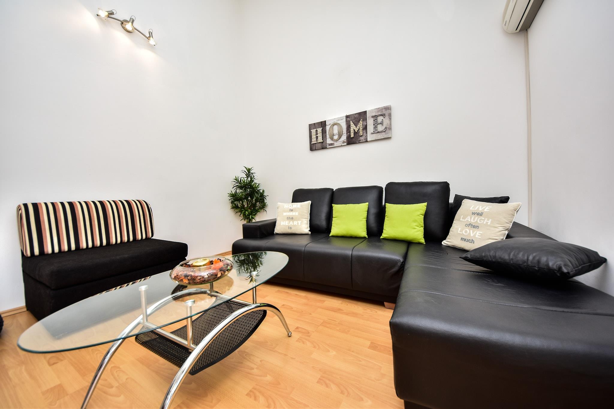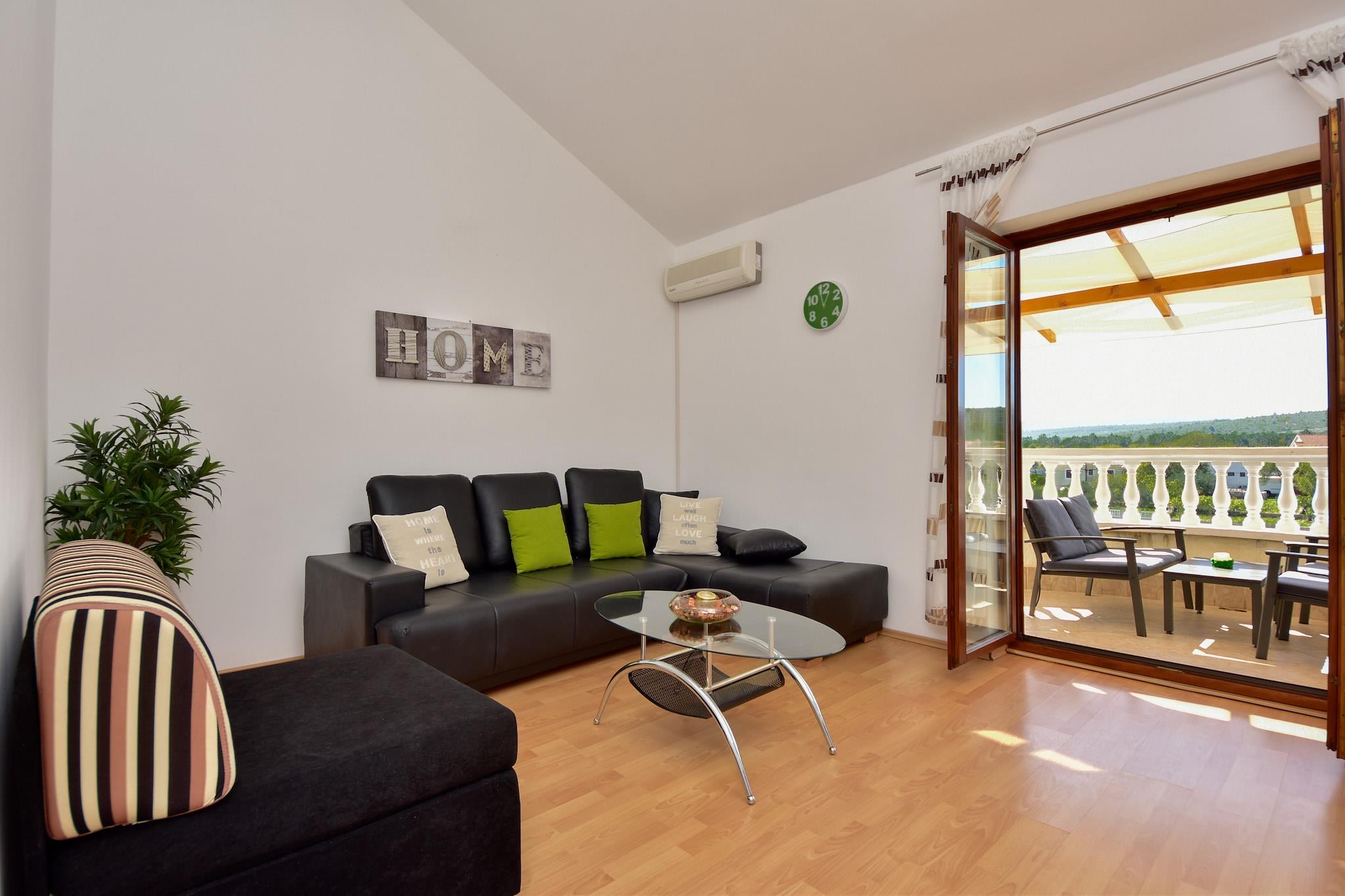 På 1. etage: (åbent køkken(elkedel, komfur(Komfur med fire kogeplader, gas, elektrisk), kaffemaskine, ovn, køleskab, fryser), stue / spisestue(dobbeltsovesofa, Fjernsyn(fladskærm, parabol), spisebord, klimaanlæg), soveværelse(dobbeltseng), badeværelse(bruser, håndvask, toilet, føntørrer), balkon eller terrasse) vaskemaskine(deles med andre gæster), have(deles med andre gæster, oplyst, 1000 m2), havemøbler, grill, parkering, trampolin, rutsjebane, bordtennisbord, dart, cykler til rådighed, Gyngestativ