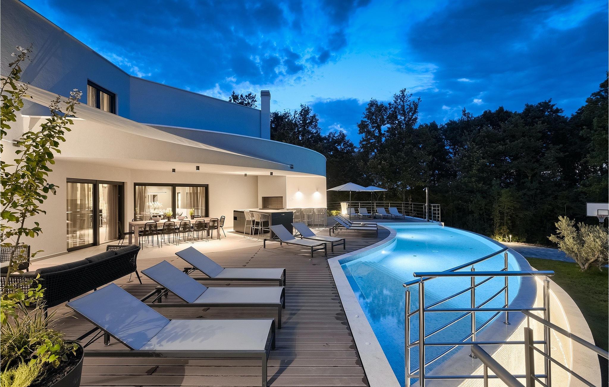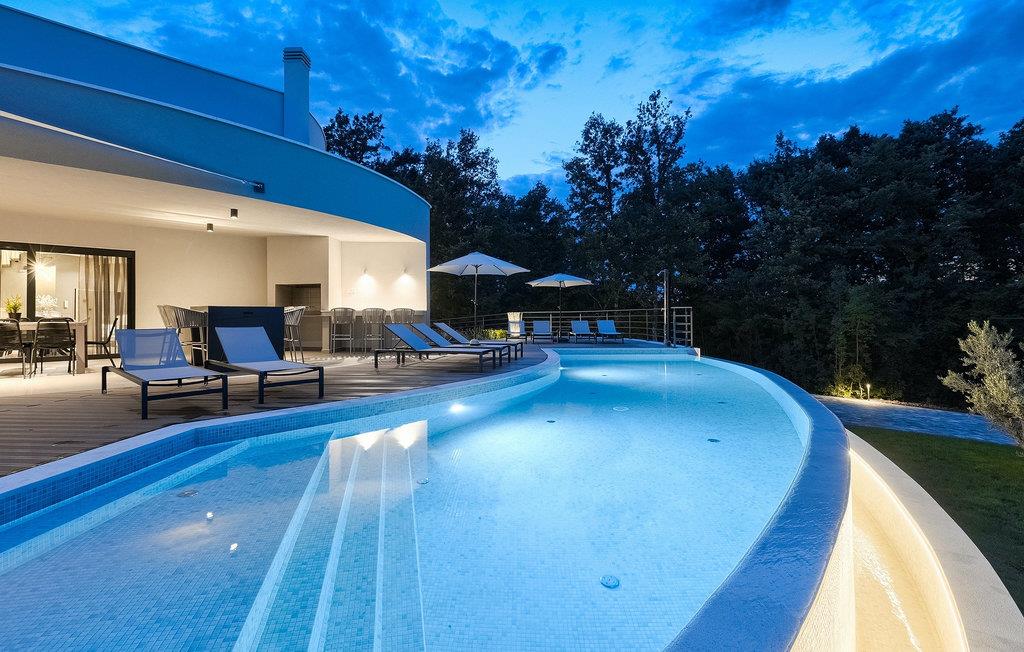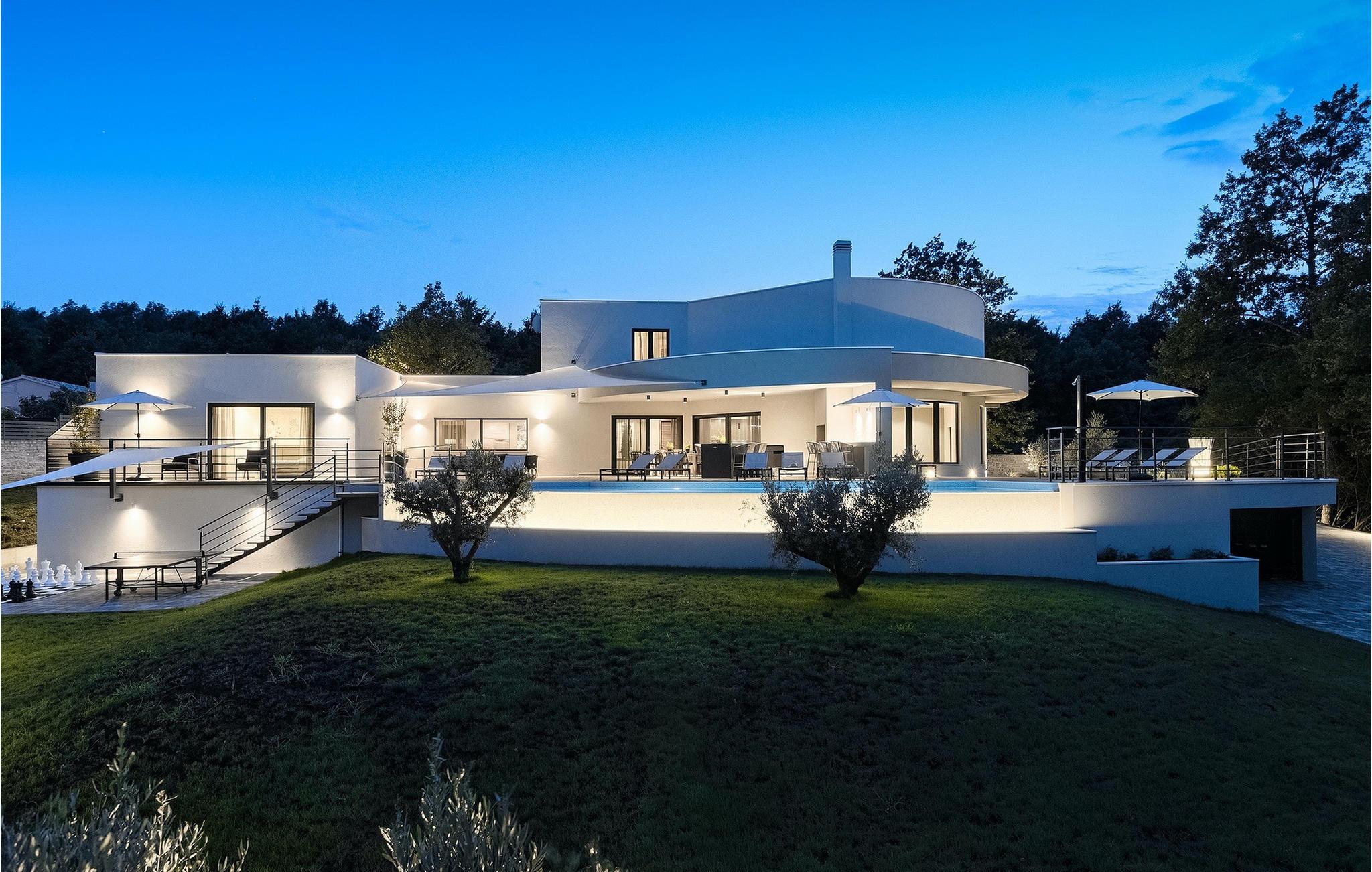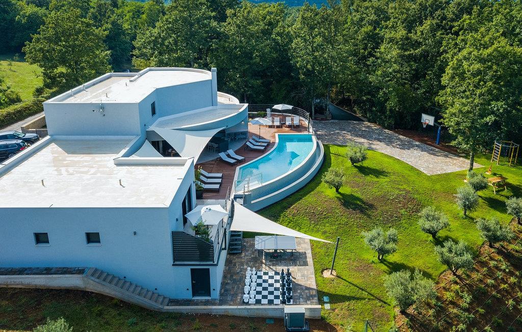 Die fantastische Luxusvilla Viktor Tireli liegt in dem kleinen Ort Krsan, in der Nähe der Stadt Labin. Die Villa ist von einem Wald umgeben, in dem Sie spazieren gehen und die Vorteile dieser ruhigen Lage genießen können. Der Außenbereich ist komplett eingezäunt und bietet Ihnen absolute Privatsphäre. Alles ist in einem sehr familienfreundlichen Stil gehalten, so dass jeder seine eigene Entspannungszone hat. Vor der Villa befindet sich ein 60 m2 großer Pool, in dem Sie sich an warmen Sommertagen erfrischen oder einfach auf den bequemen Sonnenliegen entspannen und die Aussicht auf die Natur genießen können. Für die Jüngsten gibt es einen Kinderspielplatz mit Rutsche, Schaukel, Kletterturm und vielen anderen Einrichtungen. Außerdem stehen Ihnen Fahrräder zur Verfügung, um die weitere Umgebung zu erkunden. Die Terrasse ist der perfekte Ort für ein Familientreffen, wo Sie köstliche Mahlzeiten auf dem Holzkohlegrill zubereiten und im Freien genießen können. Mit einer Gesamtwohnfläche von 526 Quadratmetern bietet die Villa Platz für bis zu 14 Personen und eine liebevolle Inneneinrichtung. Das Erdgeschoss besteht aus einem Wohnbereich, einer modernen und voll ausgestatteten Küche, einem Essbereich, einem Gäste-WC und 5 Schlafzimmern. Im Obergeschoss befinden sich neben dem Wohnbereich mit TV und Playstation 4 auch zwei weitere Schlafzimmer. Alle Schlafzimmer verfügen über ein Doppelbett, Klimaanlage, TV und ein eigenes Bad mit Dusche. Diese einzigartige Villa ist für Familien und Gruppen geeignet, also verpassen Sie diese Gelegenheit nicht und buchen Sie Ihren Traumurlaub gleich jetzt!Dieses Anwesen befindet sich in einem kleinen Weiler im östlichen Teil Istriens. Die ganze Regon Istrien ist leicht erreichbar und verfügt über ein ausgezeichnetes, verkehrsarmes Straßennetz. Sie werden zweifellos von der Tatsache, dass der nächste Strand nur 5 km entfernt ist, begeistert sein, da die istrische Halbinsel „Terra Magic” an der warmen Adria liegt. Die Küste mit den großen Touristenzentren Labin und Rabac, sowie der Flughafen Pula sind nur wenige Autominuten entfernt. Auf seinem Hügel oberhalb der magischen Kvarner-Küste thronend, ist Labin das historische und administrative Zentrum Ostistriens. Das Gebiet ist ein Paradies für Kunst- und Geschichtsfreunde mit seinem reichen kulturellen und architektonischen Erbe. Die steilen, gewundenen Gässchen der Altstadt bieten gut erhaltene historische Paläste, zahlreiche Kunstgalerien und –studios, sowie verschiedene Festivals der Jazz- und klassischen Musik in den Sommermonaten. Die Stadt verfügt über einige hervorragende Fischrestaurants, mit köstlichen lokalen Produkten, sowie gemütliche Cafés, wo Sie die entspannte Atmosphäre genießen können. Der Küstenort von Labin ist Rabac, ehemaliges Fischerdorf, heute ein beliebtes Touristenziel, umgeben von einer Vielfalt an traumhaften Kiesstränden.
