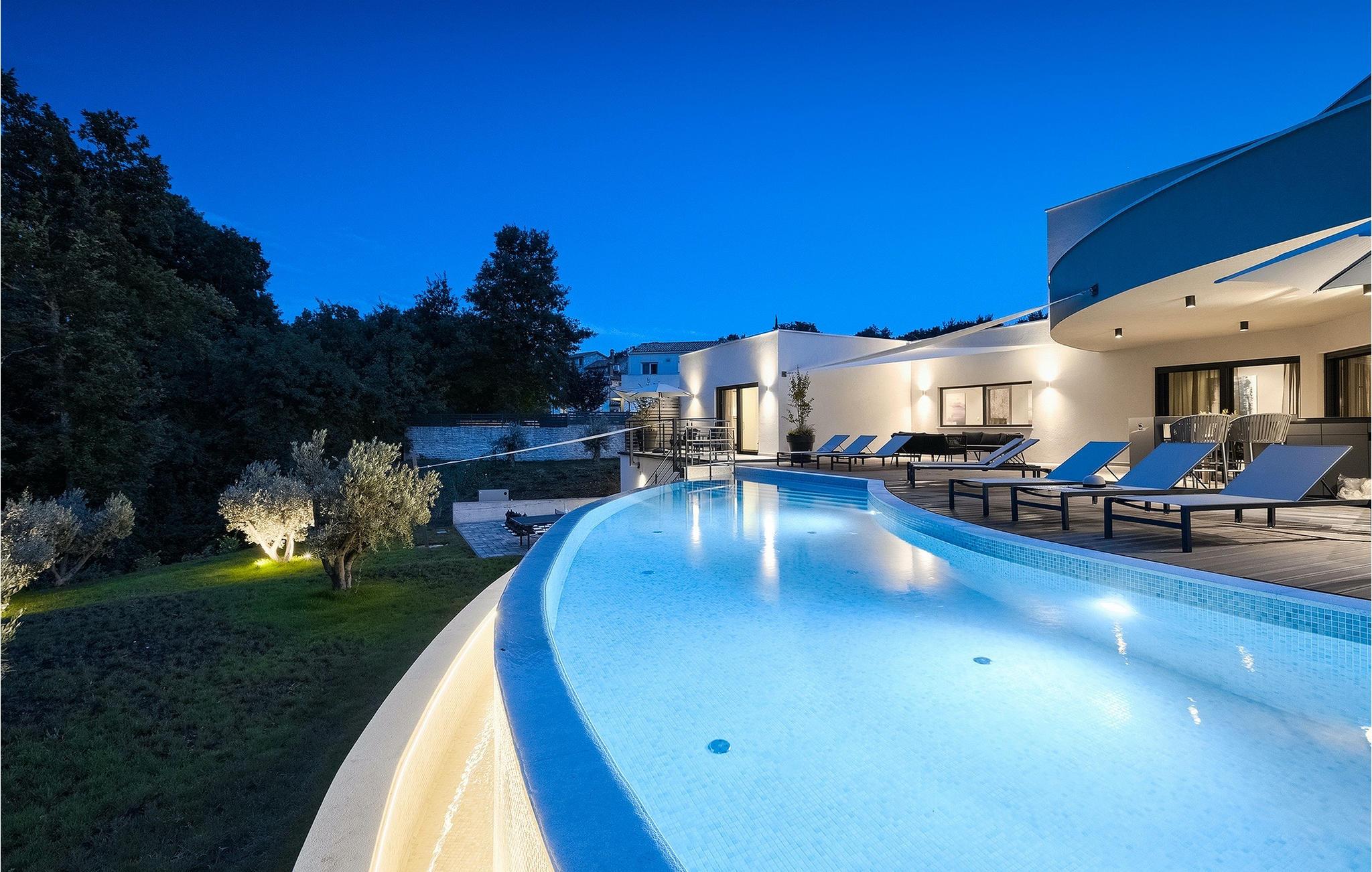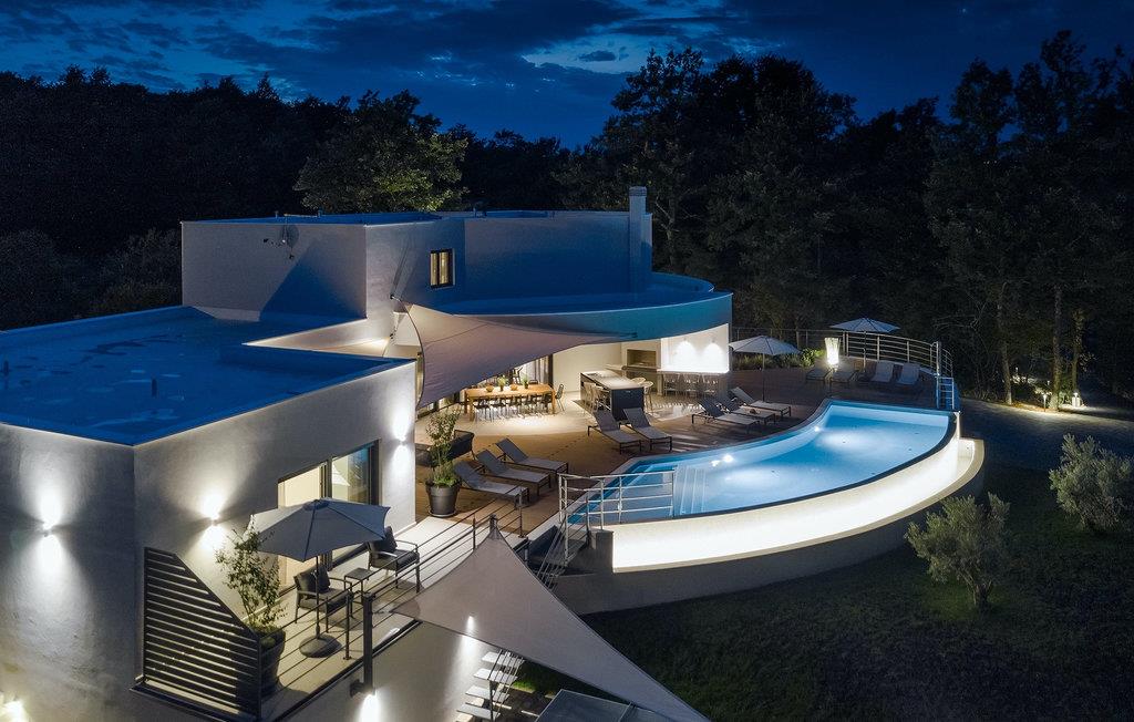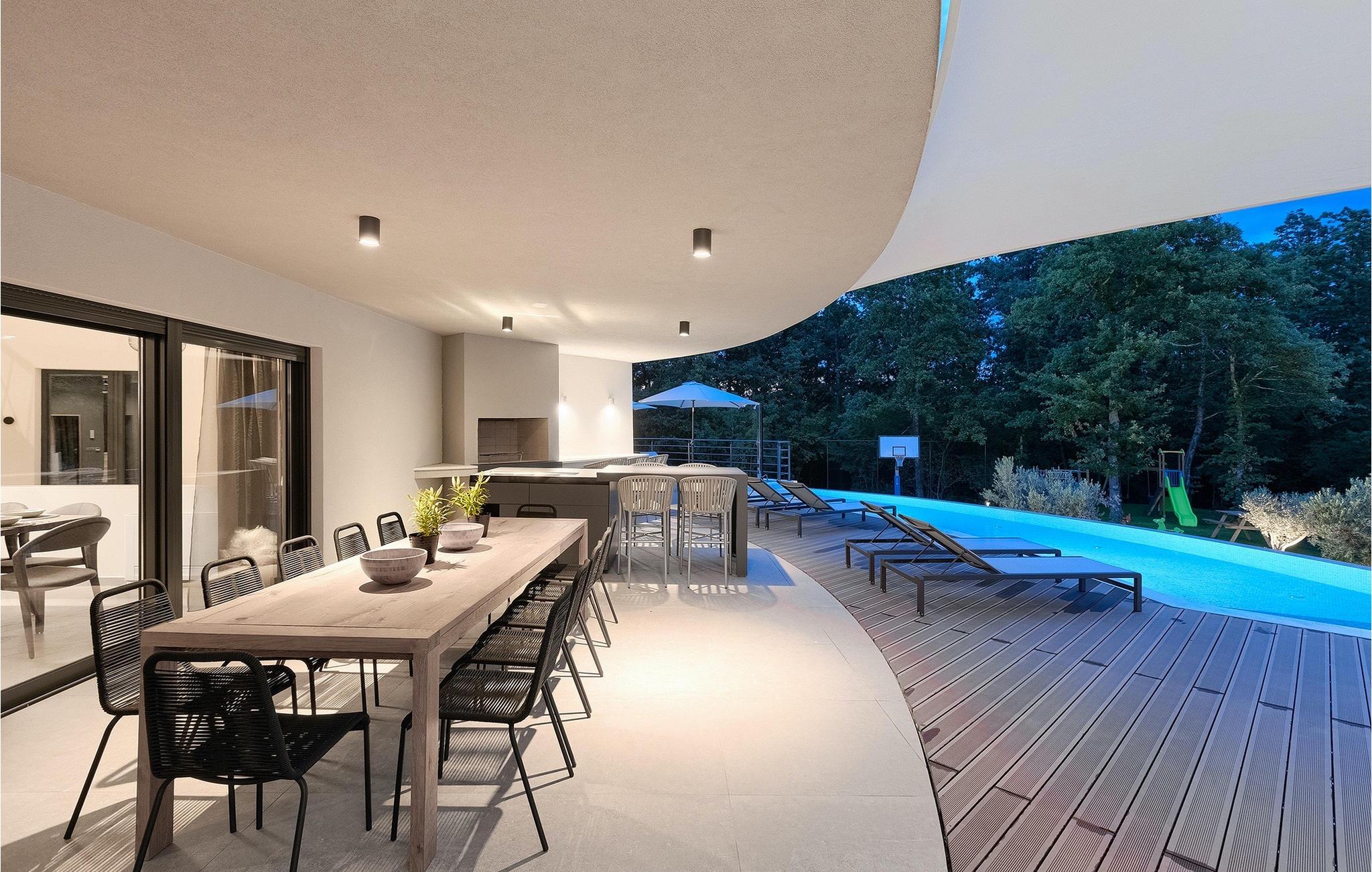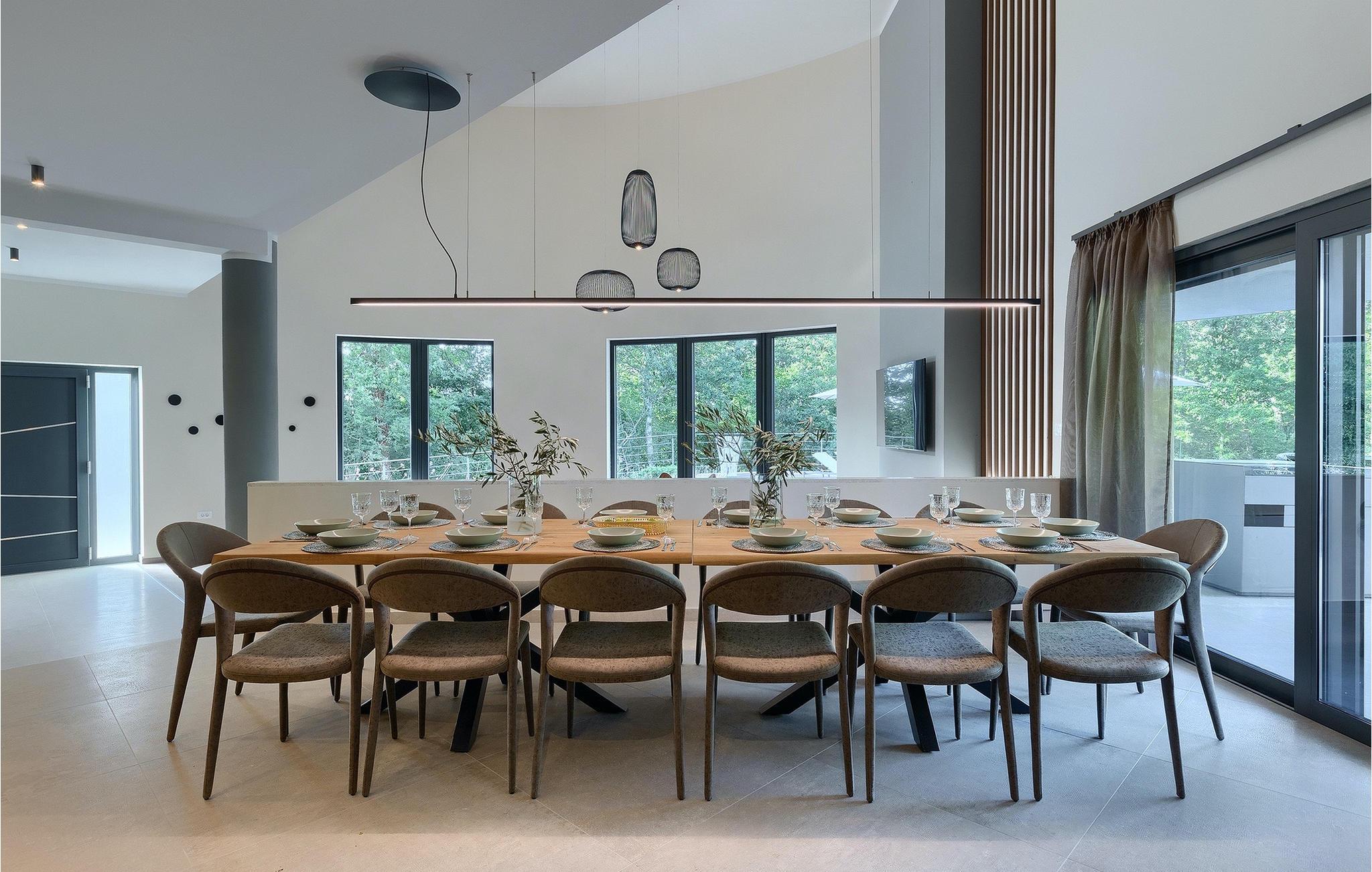 Die fantastische Luxusvilla Viktor Tireli liegt in dem kleinen Ort Krsan, in der Nähe der Stadt Labin. Die Villa ist von einem Wald umgeben, in dem Sie spazieren gehen und die Vorteile dieser ruhigen Lage genießen können. Der Außenbereich ist komplett eingezäunt und bietet Ihnen absolute Privatsphäre. Alles ist in einem sehr familienfreundlichen Stil gehalten, so dass jeder seine eigene Entspannungszone hat. Vor der Villa befindet sich ein 60 m2 großer Pool, in dem Sie sich an warmen Sommertagen erfrischen oder einfach auf den bequemen Sonnenliegen entspannen und die Aussicht auf die Natur genießen können. Für die Jüngsten gibt es einen Kinderspielplatz mit Rutsche, Schaukel, Kletterturm und vielen anderen Einrichtungen. Außerdem stehen Ihnen Fahrräder zur Verfügung, um die weitere Umgebung zu erkunden. Die Terrasse ist der perfekte Ort für ein Familientreffen, wo Sie köstliche Mahlzeiten auf dem Holzkohlegrill zubereiten und im Freien genießen können. Mit einer Gesamtwohnfläche von 526 Quadratmetern bietet die Villa Platz für bis zu 14 Personen und eine liebevolle Inneneinrichtung. Das Erdgeschoss besteht aus einem Wohnbereich, einer modernen und voll ausgestatteten Küche, einem Essbereich, einem Gäste-WC und 5 Schlafzimmern. Im Obergeschoss befinden sich neben dem Wohnbereich mit TV und Playstation 4 auch zwei weitere Schlafzimmer. Alle Schlafzimmer verfügen über ein Doppelbett, Klimaanlage, TV und ein eigenes Bad mit Dusche. Diese einzigartige Villa ist für Familien und Gruppen geeignet, also verpassen Sie diese Gelegenheit nicht und buchen Sie Ihren Traumurlaub gleich jetzt!Dieses Anwesen befindet sich in einem kleinen Weiler im östlichen Teil Istriens. Die ganze Regon Istrien ist leicht erreichbar und verfügt über ein ausgezeichnetes, verkehrsarmes Straßennetz. Sie werden zweifellos von der Tatsache, dass der nächste Strand nur 5 km entfernt ist, begeistert sein, da die istrische Halbinsel „Terra Magic” an der warmen Adria liegt. Die Küste mit den großen Touristenzentren Labin und Rabac, sowie der Flughafen Pula sind nur wenige Autominuten entfernt. Auf seinem Hügel oberhalb der magischen Kvarner-Küste thronend, ist Labin das historische und administrative Zentrum Ostistriens. Das Gebiet ist ein Paradies für Kunst- und Geschichtsfreunde mit seinem reichen kulturellen und architektonischen Erbe. Die steilen, gewundenen Gässchen der Altstadt bieten gut erhaltene historische Paläste, zahlreiche Kunstgalerien und –studios, sowie verschiedene Festivals der Jazz- und klassischen Musik in den Sommermonaten. Die Stadt verfügt über einige hervorragende Fischrestaurants, mit köstlichen lokalen Produkten, sowie gemütliche Cafés, wo Sie die entspannte Atmosphäre genießen können. Der Küstenort von Labin ist Rabac, ehemaliges Fischerdorf, heute ein beliebtes Touristenziel, umgeben von einer Vielfalt an traumhaften Kiesstränden.