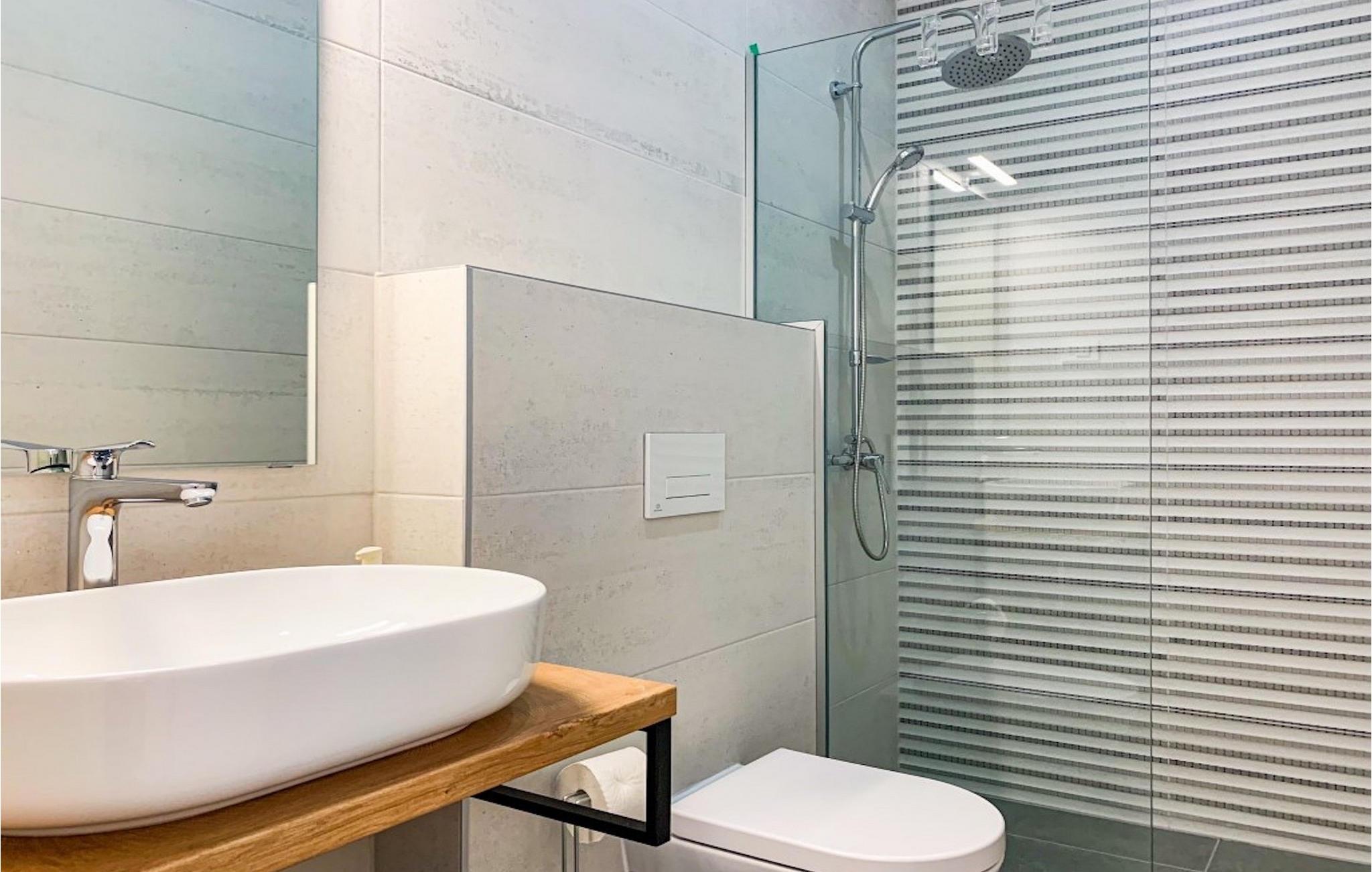 I stueetagen af villaen finder du et fuldt udstyret køkken med spisestue til 8 gæster. Dette er et perfekt sted at nyde lækre familiemåltider. En stor stue med en stor sofa venter dig også i stueetagen. Der kan du læne dig tilbage og slappe af efter et dejligt familiemåltid. Et badeværelse med bruseniche er også placeret på denne etage.