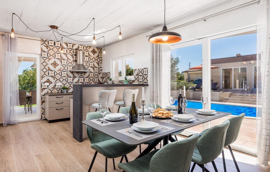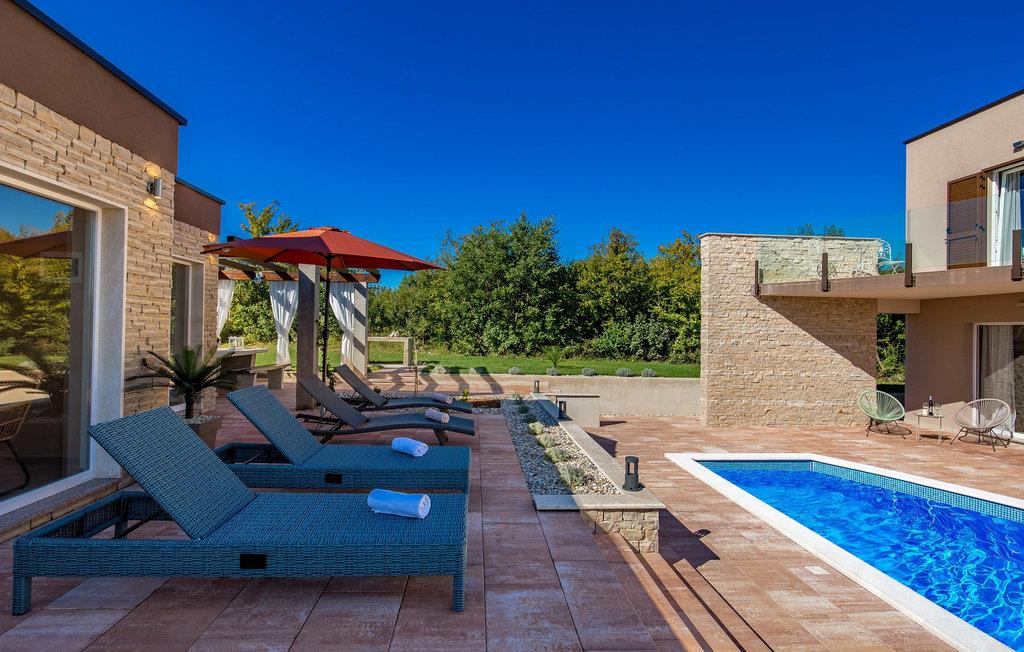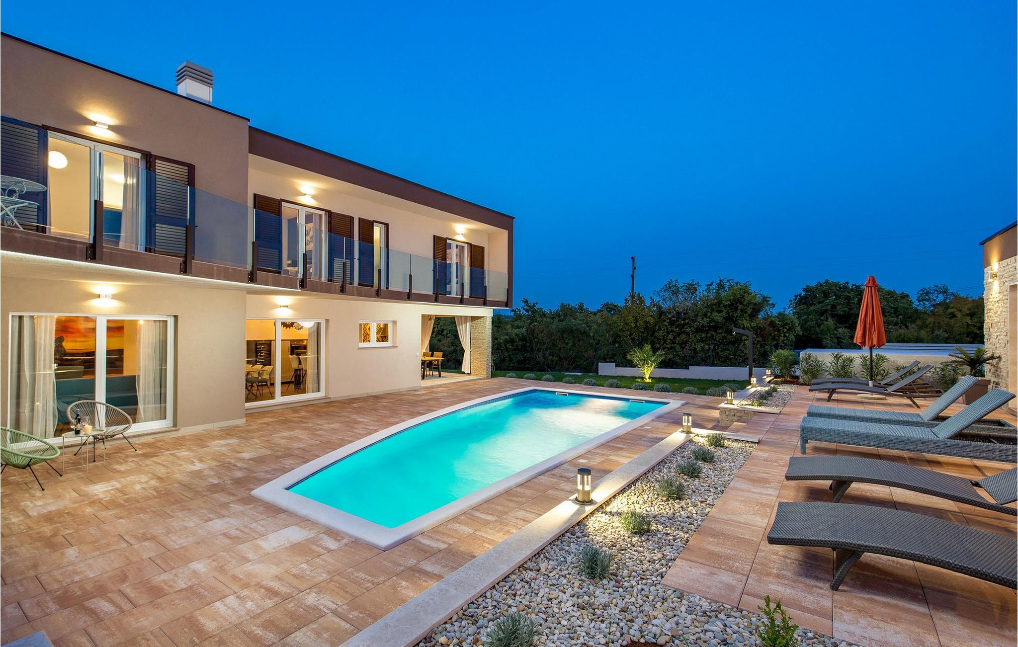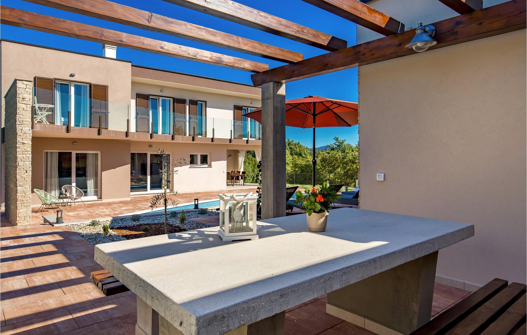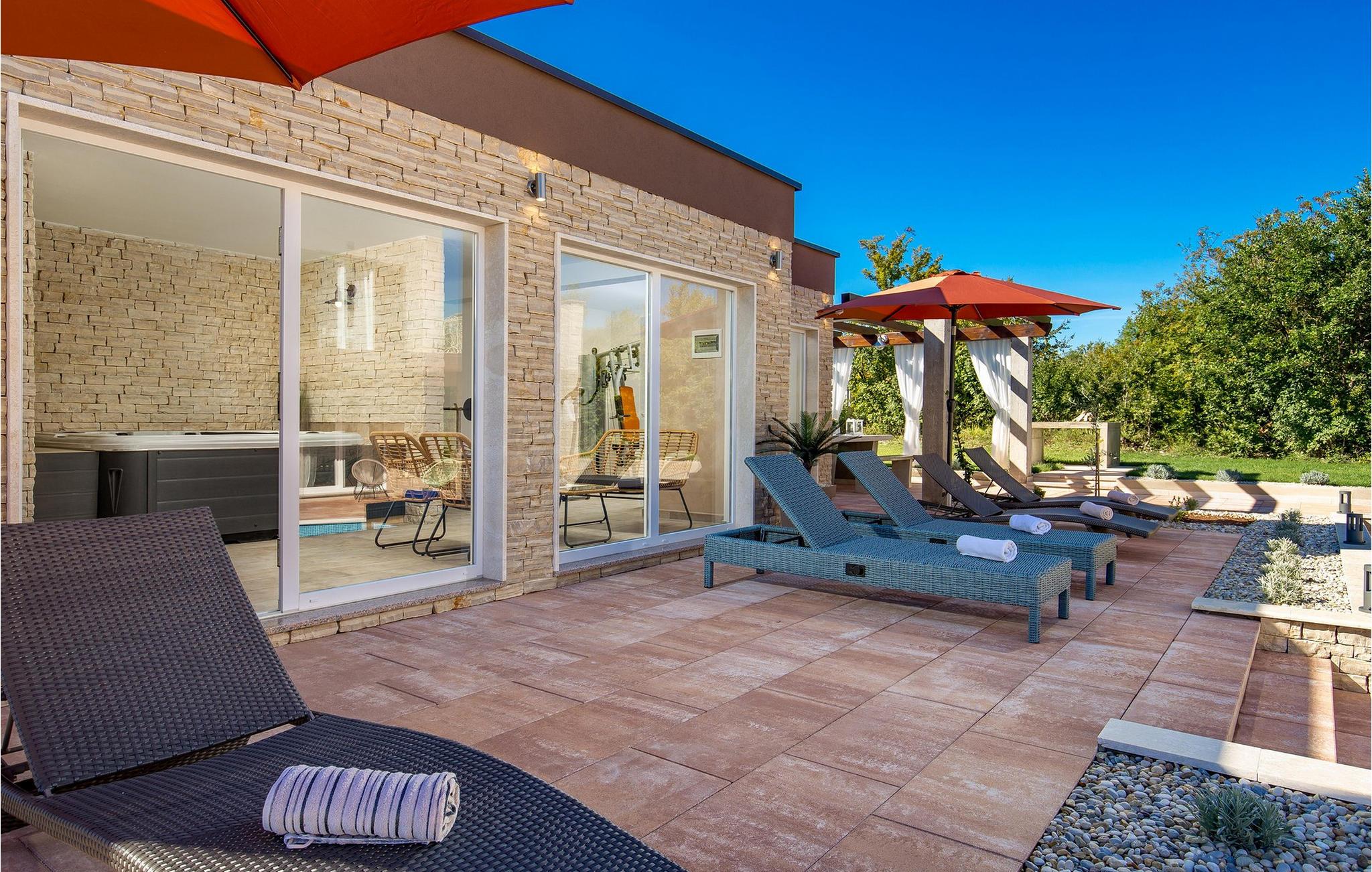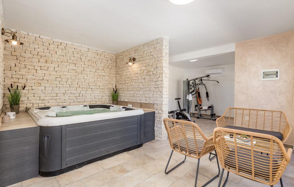 Luxury Villa Kunj ligger i landsbyen Kunj i Istrien. Villa Kunj er det rigtige valg for alle, der ønsker at tilbringe deres ferie i fred og afslapning, mens de nyder det fuldstændige privatliv og luksus i denne smukke villa. Indkvarteringskapacitet for maksimalt 6 personer, den fuldt klimatiserede Villa Kunj har i alt 208 m2 og er indrettet i rustik-moderne stil. Omgivet af uberørt natur og fortryllende grønne områder, tilbyder denne villa dig alt, hvad du nogensinde har drømt om. Ovenpå er der 3 soveværelser med tre dobbeltsenge (180x200) og 3 badeværelser med bruser. I villaens stueetage er der opholdsstue med sofa, kærlighedsstol, lænestol og tv. Det smukt indrettede køkken har alt hvad du behøver for at tilberede dine foretrukne og lækreste måltider, såsom køkkenredskaber, ovn, brødrister, kaffemaskine og vinkøleskab. Køkkenet indeholder også en lille bar med 2 siddepladser. Nær køkkenet er der en spisestue med et bord med plads til 6 og ved siden af er der udgang til den udendørs terrasse. Som ekstraudstyr er der vaskemaskine, tørretumbler og strygejern og villaen har separat toilet. For en ægte følelse af luksus vil du blive overrasket over saunaen, fitnesscentret og jacuzzien, der ligger overfor villaen i en separat bygning og deles ved poolen. Rejser du med børn, kan du bruge foderautomaten og barnesengen. Poolen er på 38 m², og du kan køle af i fuldstændig fred om dagen og om natten. Der er også 6 liggestole omgivet af en åben have og plads nok til, at børn kan lege, og børn kan også more sig på gyngerne. Kul- eller træudendørsgrillen er placeret ved siden af det overdækkede udendørs spisebord med 6 sæder. Du kan benytte 4 private parkeringspladser i gården. Kunj er et lille sted ikke langt fra byen Labin og den istriske kyst med smukke strande og klart hav. Halvøen Istrien byder på mange attraktioner og faciliteter, der er værd at besøge og prøve. Smukke landskaber og solrigt middelhavsklima vil tilbyde dig sjove og interessante dagsture med din familie eller vennegruppe. I byen Labin skal du sørge for at besøge Labin-minen, som tidligere var en vigtig gren af Labin-regionen. Sjov og luksusferie er garanteret! Velkommen til Villa Kunj! Bemærk venligst, at denne ejendom ikke accepterer ungdomsgrupper eller polterabends. En ungdomsgruppe i denne ejendom består af personer under 30 år. Book ikke denne ejendom, hvis du er en ungdomsgruppe eller polterabend, da din reservation vil blive afvist efter reservationen, hvilket også kan være tilfældet ved ankomst til overnatningsstedet eller under dit ophold, og du vil ikke modtage en refusion.