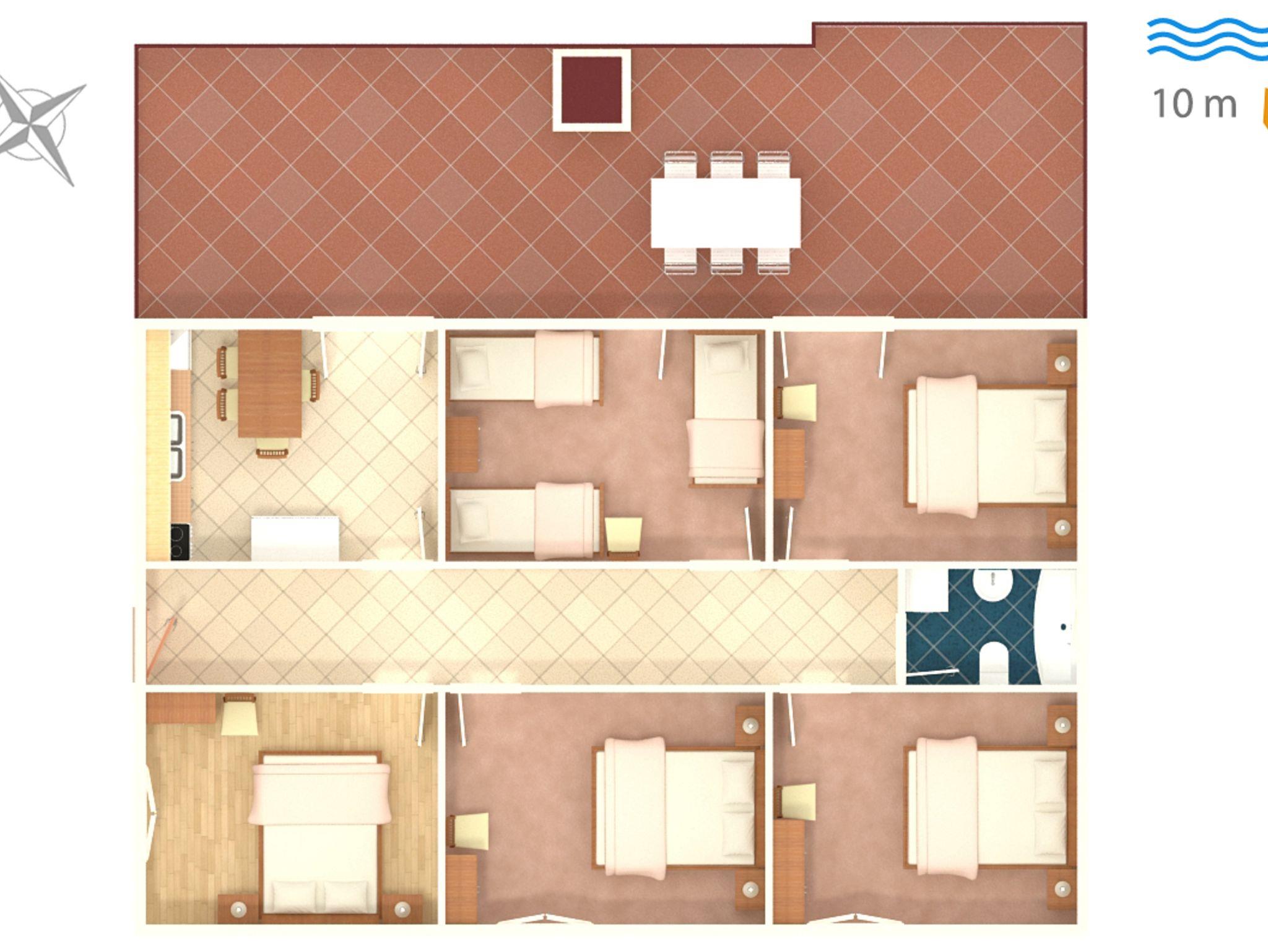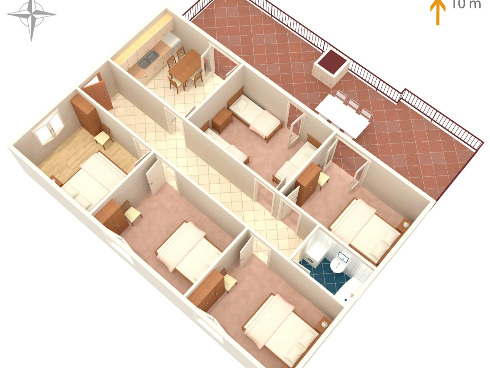 Ferienwohnung bietet Platz für 10 Gäste. Die Betten sind in Schlafzimmern, die es 5 gibt, innerhalb einer Gesamtfläche von 78m2, angeordnet. Die Gäste haben eine eigene Terrasse zur Verfügung, auf der sie in warmen Sommernächten genießen können. Das Apartment bietet Meerblick. Es ist erlaubt, Speisen auf dem Gemeinschafts-Grill vorzubereiten. IM PREIS INBEGRIFFEN: Kurtaxe, Endreinigung, Parkplatz, Internet. VERBINDLICHE ZUSÄTZLICHE KOSTEN: Aufzahlung für Kurzaufenthalte (prozentualer Zuschlag pro Nächtigungsanzahl: 30% - 1, 20% - 2, 10% - 3). UNVERBINDLICHE ZUSÄTZLICHE KOSTEN: Klimatisierung (5,00 € pro Nacht). Die Verfügbarkeit zusätzlicher Dienstleistungen in Ihrem reservierten Termin und die Preise derselben (falls nicht aufgeführt) müssen im Voraus überprüft werden. Zusätzliche Dienstleistungen die in der Zahlungsaufforderung nicht aufgeführt sind werden direkt beim Vermieter bezahlt, angenommen der Gast nutzt auch diese. Ermäßigung auf den Grundpreis: Aktion (erzielen Sie während der Buchung zusätzliche Ermäßigung von 10%).