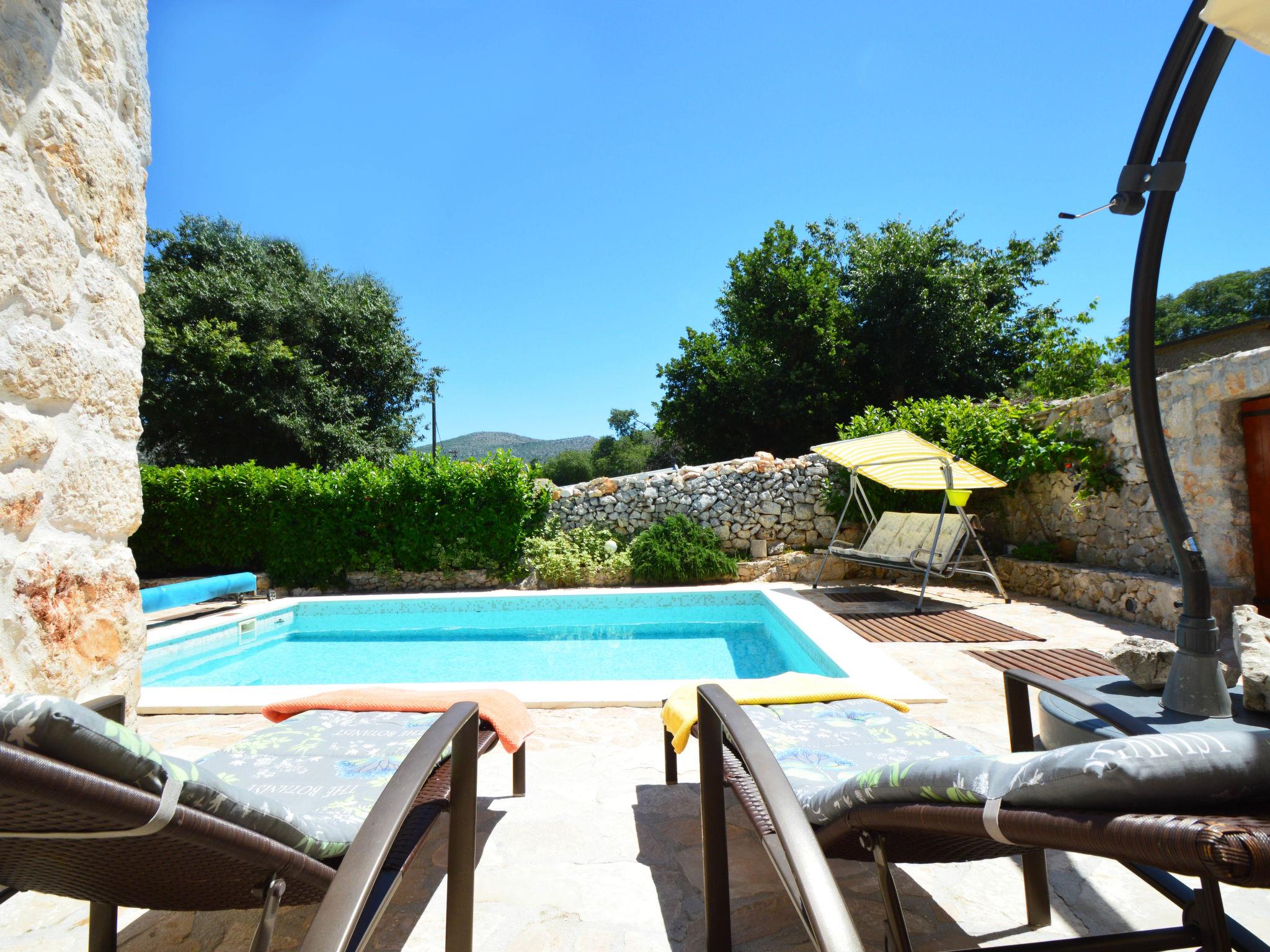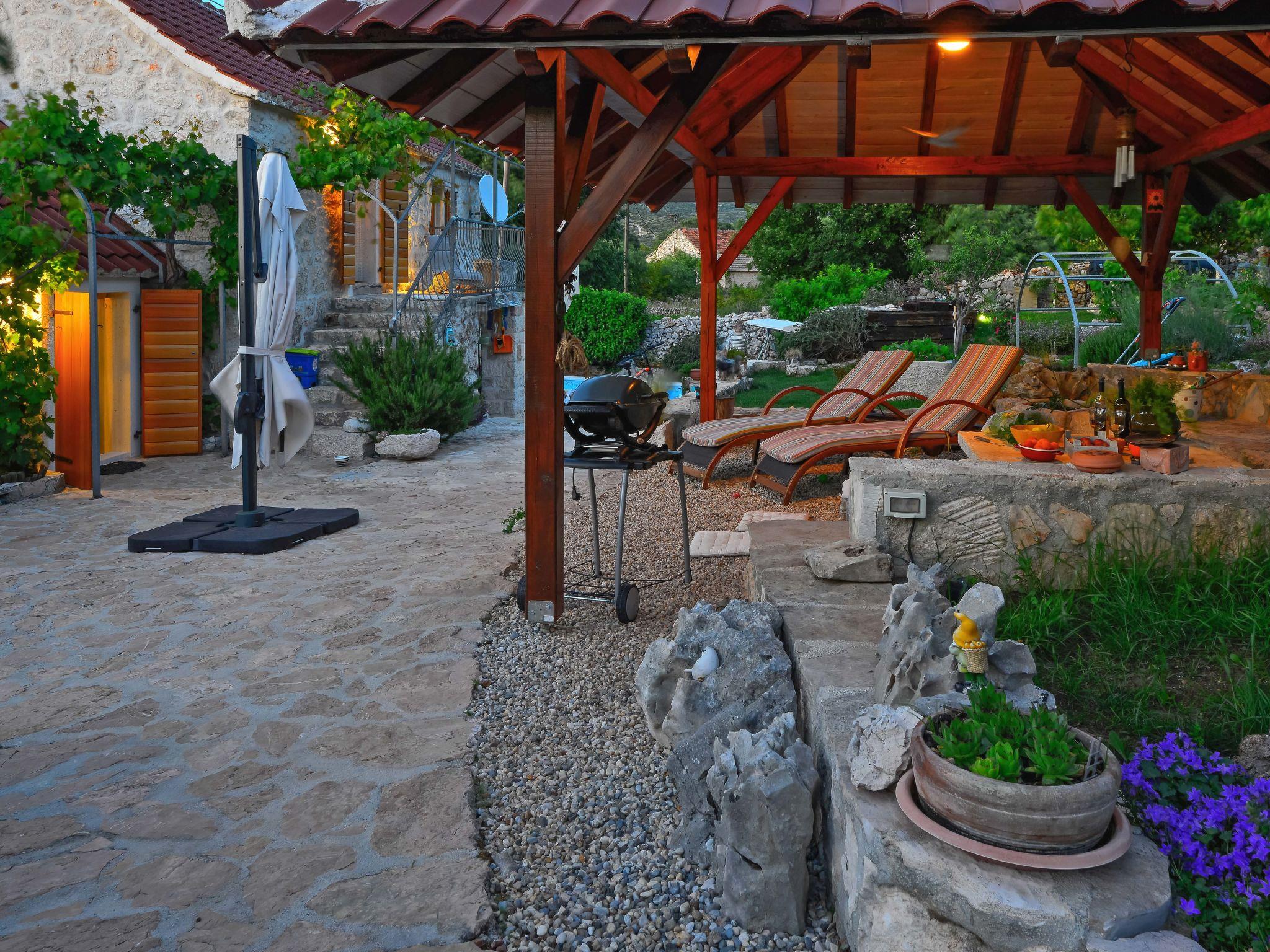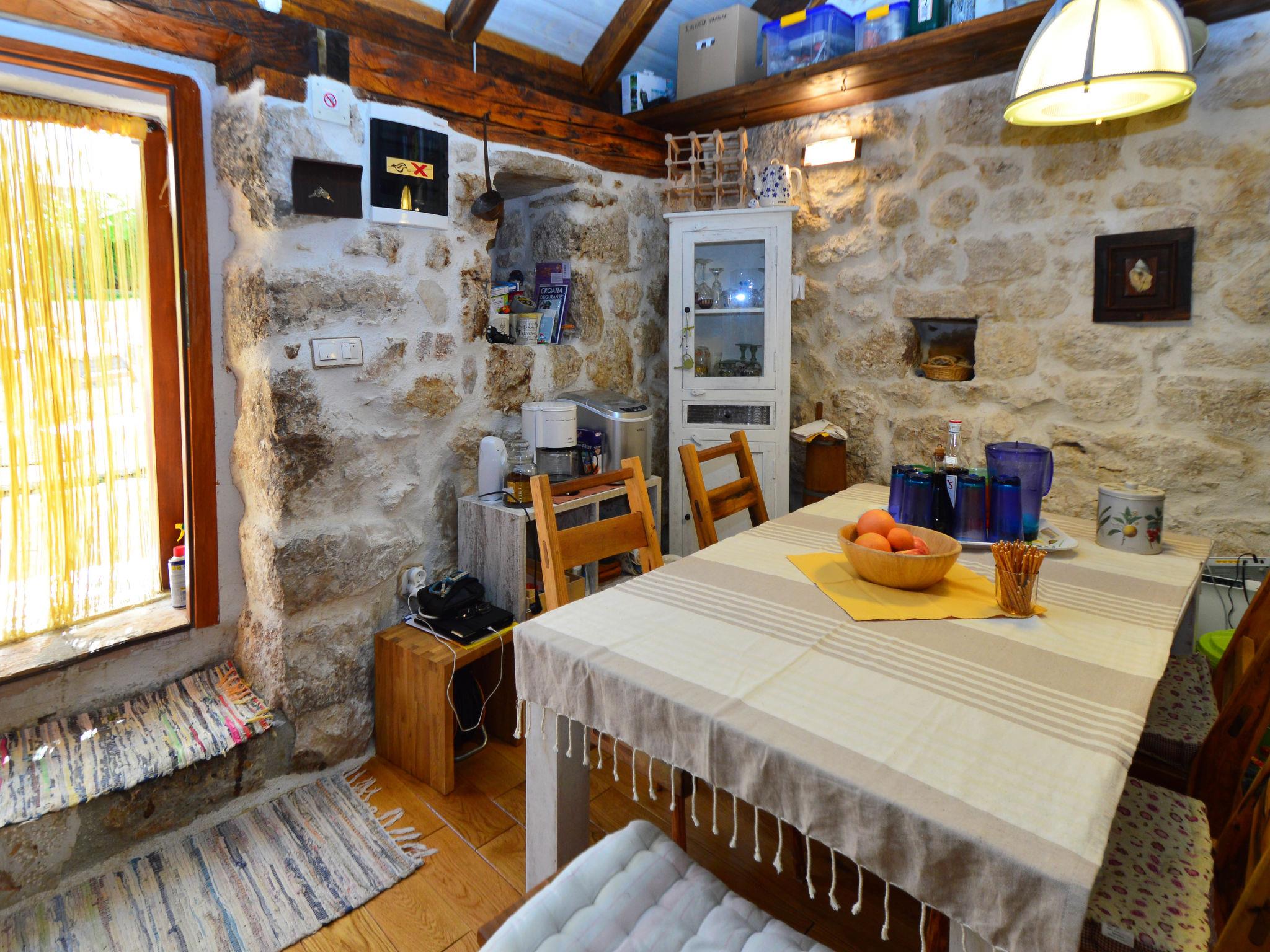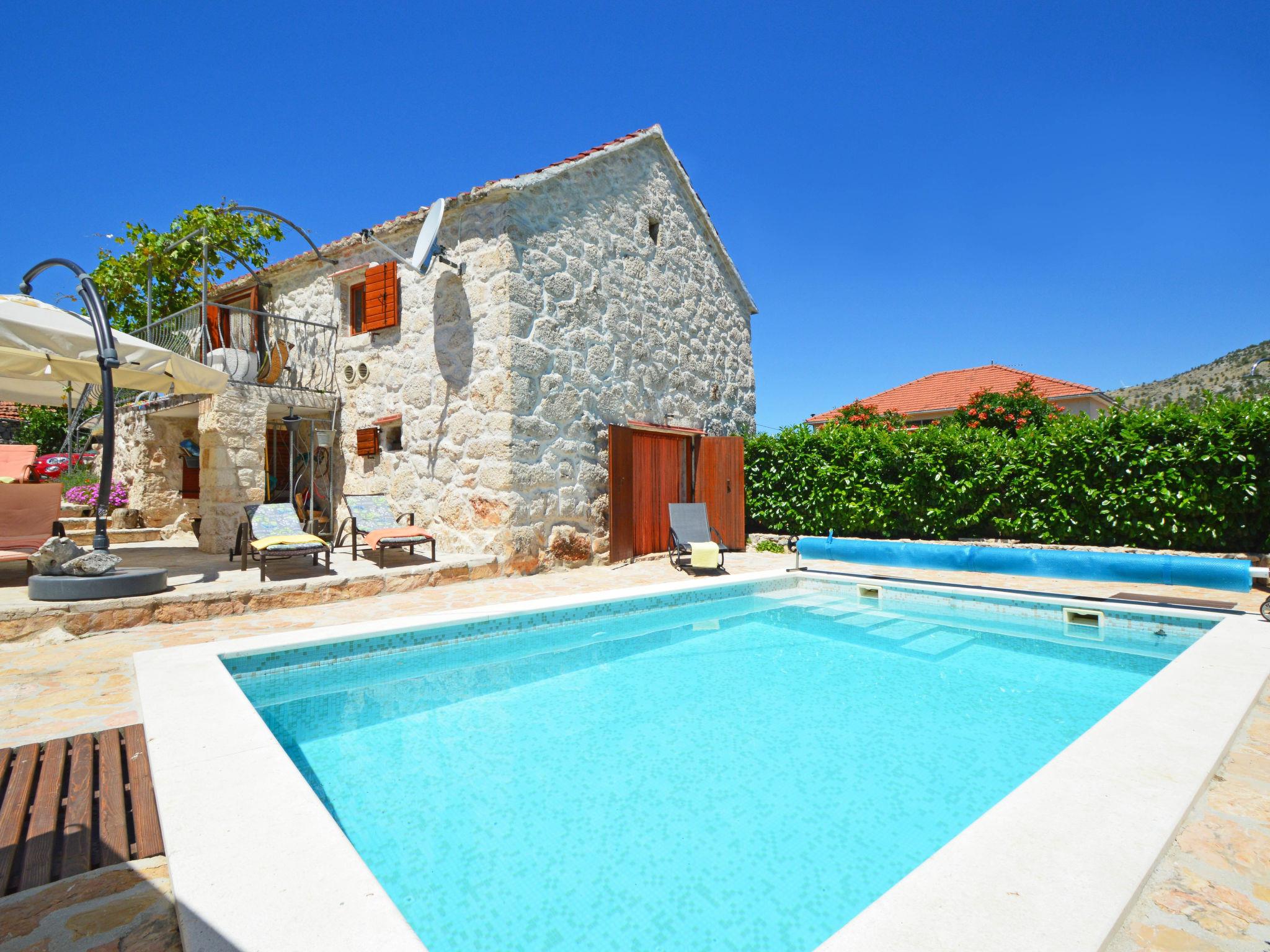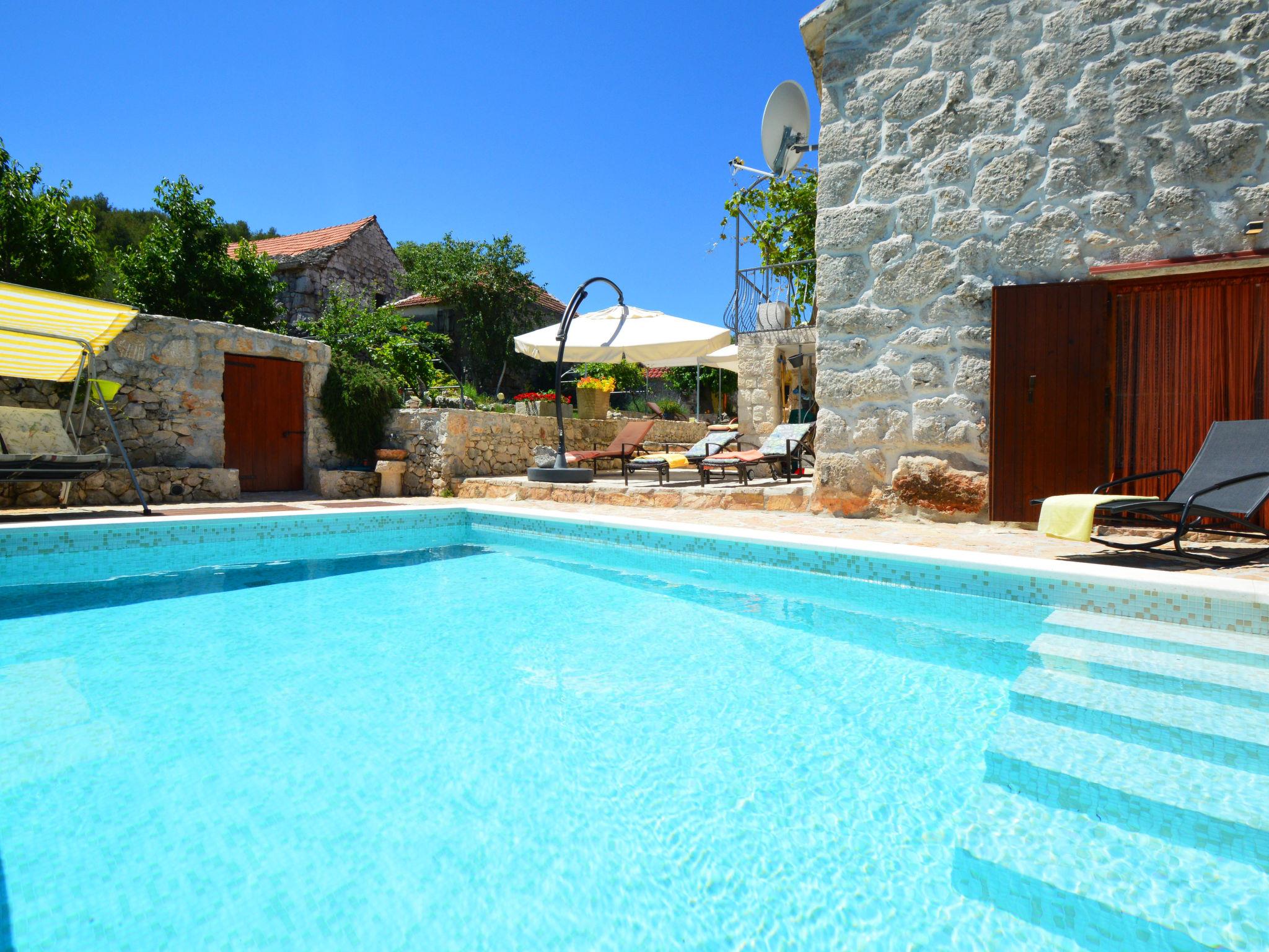 Single-family house "Home sweet home", 2 storeys. In the hamlet Vrsine 5 km from the centre of Marina, in a quiet, sunny position, 2.4 km from the sea, 2.4 km from the beach. Private: property 720 m2 (fenced), garden 20 m2 with lawn 220 m2, swimming pool angular (6 x 4 m, depth 150 cm, seasonal availability: 25.Apr. - 10.Oct.) with internal staircase. Outdoor shower, terrace (20 m2), garden furniture. In the house: internet access, sauna, washing machine. Breakfast possible on request (extra). Parking at the house on the premises. Shop 3.5 km, restaurant 2.5 km, bus stop 500 m, pebble beach 2.4 km. Tennis 5 km. The unit consists of 2 houses rented as one unit.