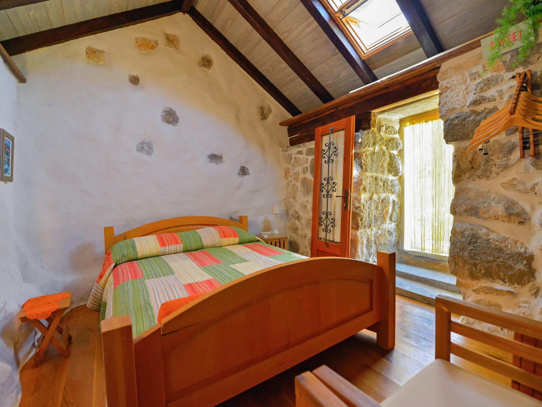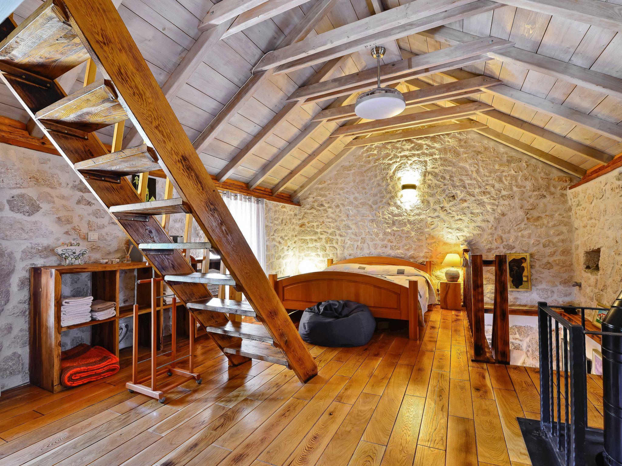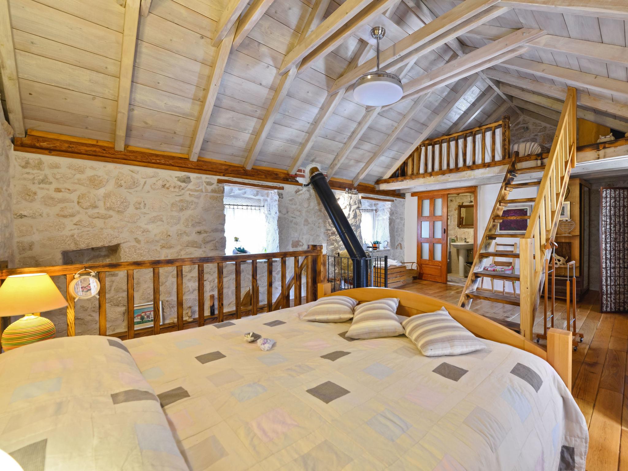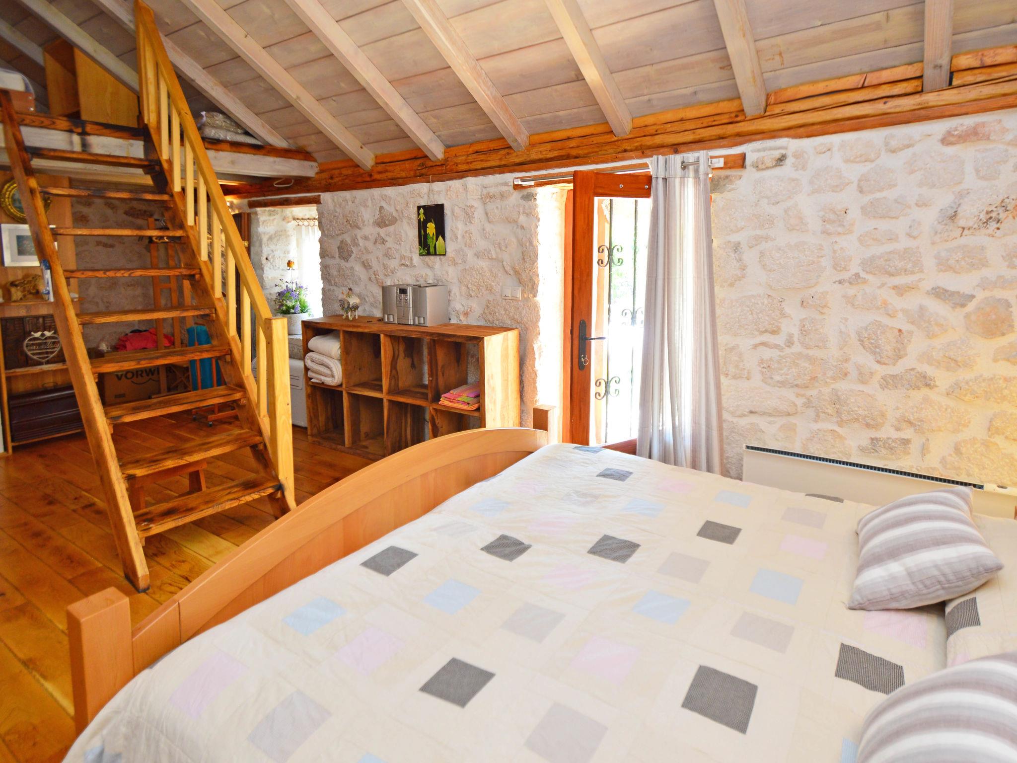 3-room house 80 m2 on 2 levels, south facing position. Living/dining room with open-hearth fireplace and TV (flat screen). Exit to the terrace. 1 room with 1 french bed (160 cm, length 200 cm), air conditioning. Open kitchen (oven, 4 ceramic glass hob hotplates, microwave, freezer, electric coffee machine). Shower/WC. Upper floor: walk-through room with 1 double bed (2 x 90 cm, length 200 cm), shower/WC and air conditioning. Exit to the terrace. Open gallery, ceiling height 30 - 140 cm with 1 bed (80 cm, length 200 cm). Terrace 4 m2. Barbecue (portable), deck chairs. View of the swimming pool and the countryside. Facilities: children's high chair, baby cot, hair dryer. Internet (WiFi, free). One house with living/dining room and open kitchen on the ground floor, bedroom and open gallery on the first floor. The other house with 1 bedroom on the ground floor. 2181-01/09-17-3