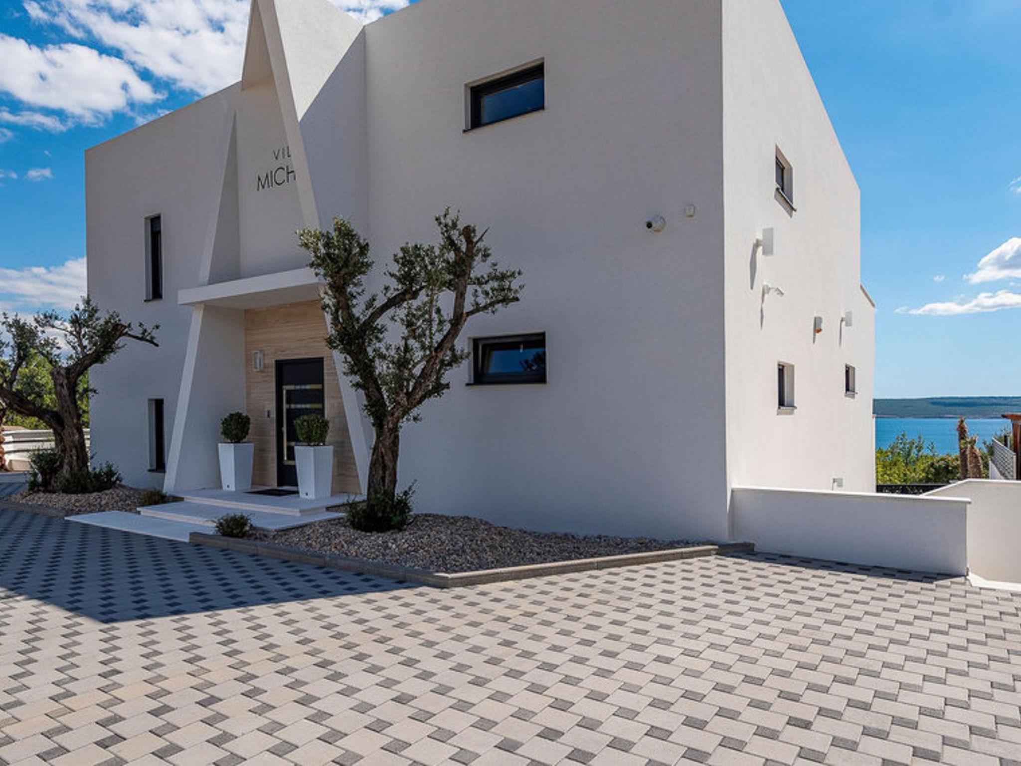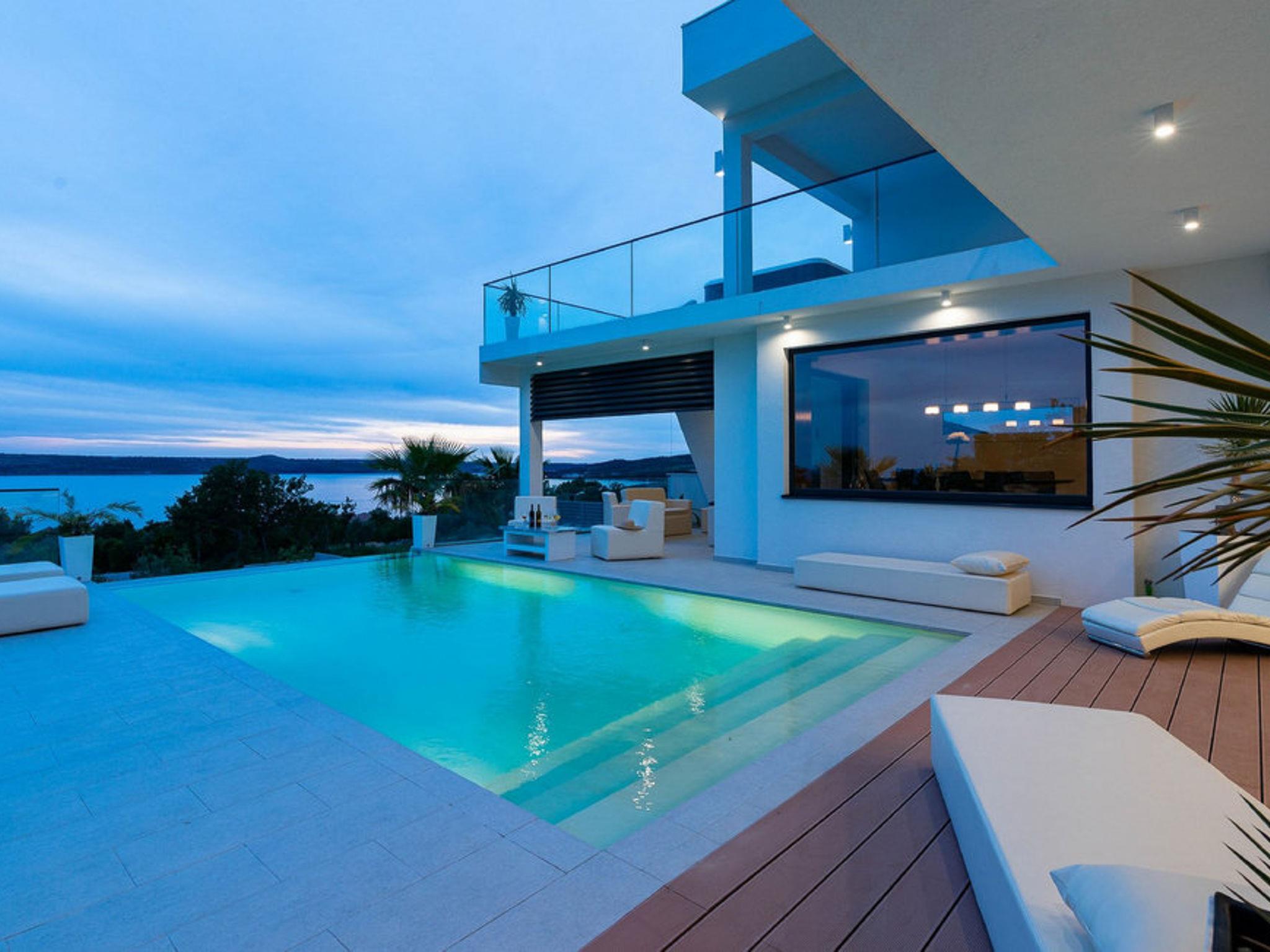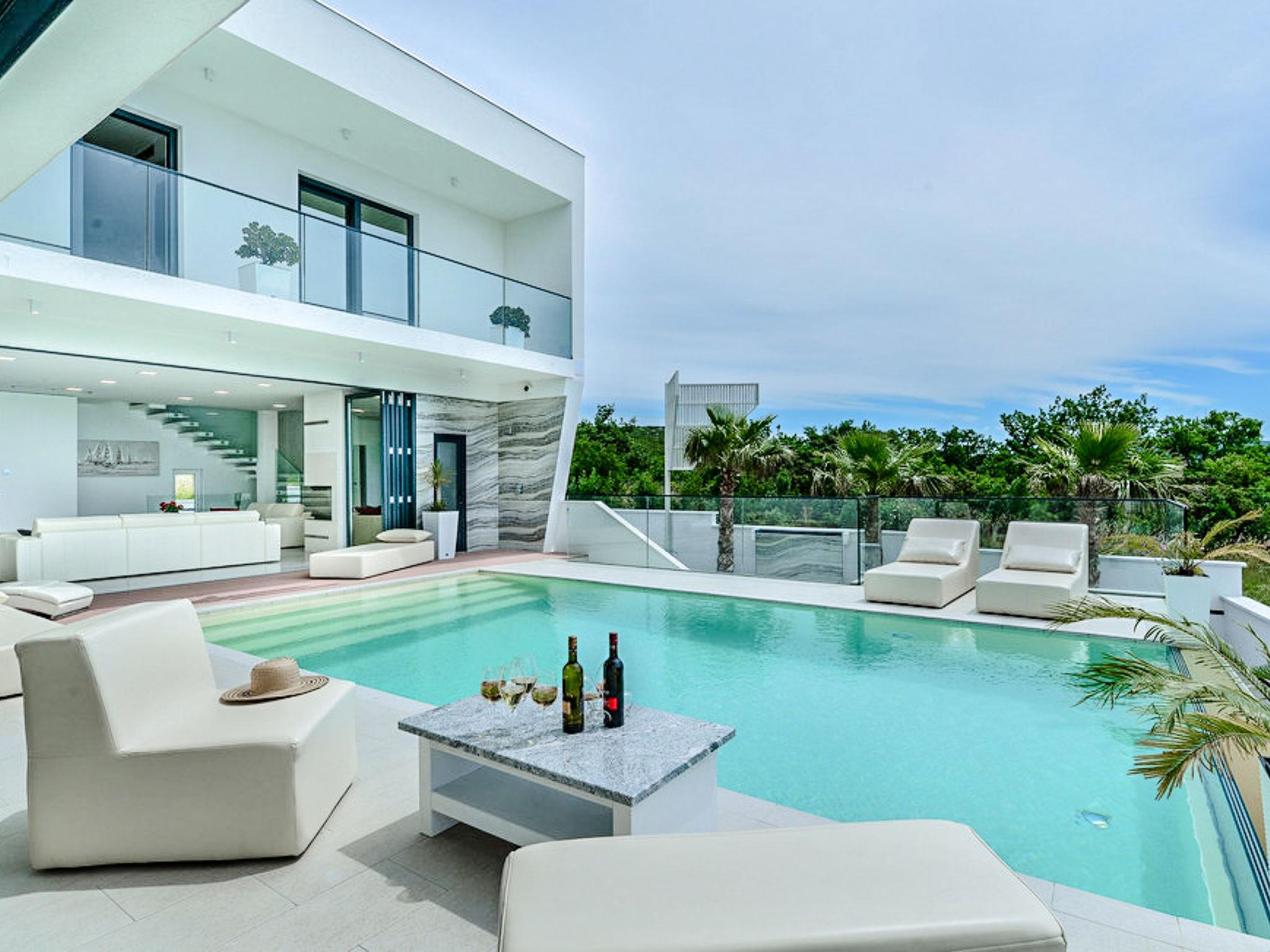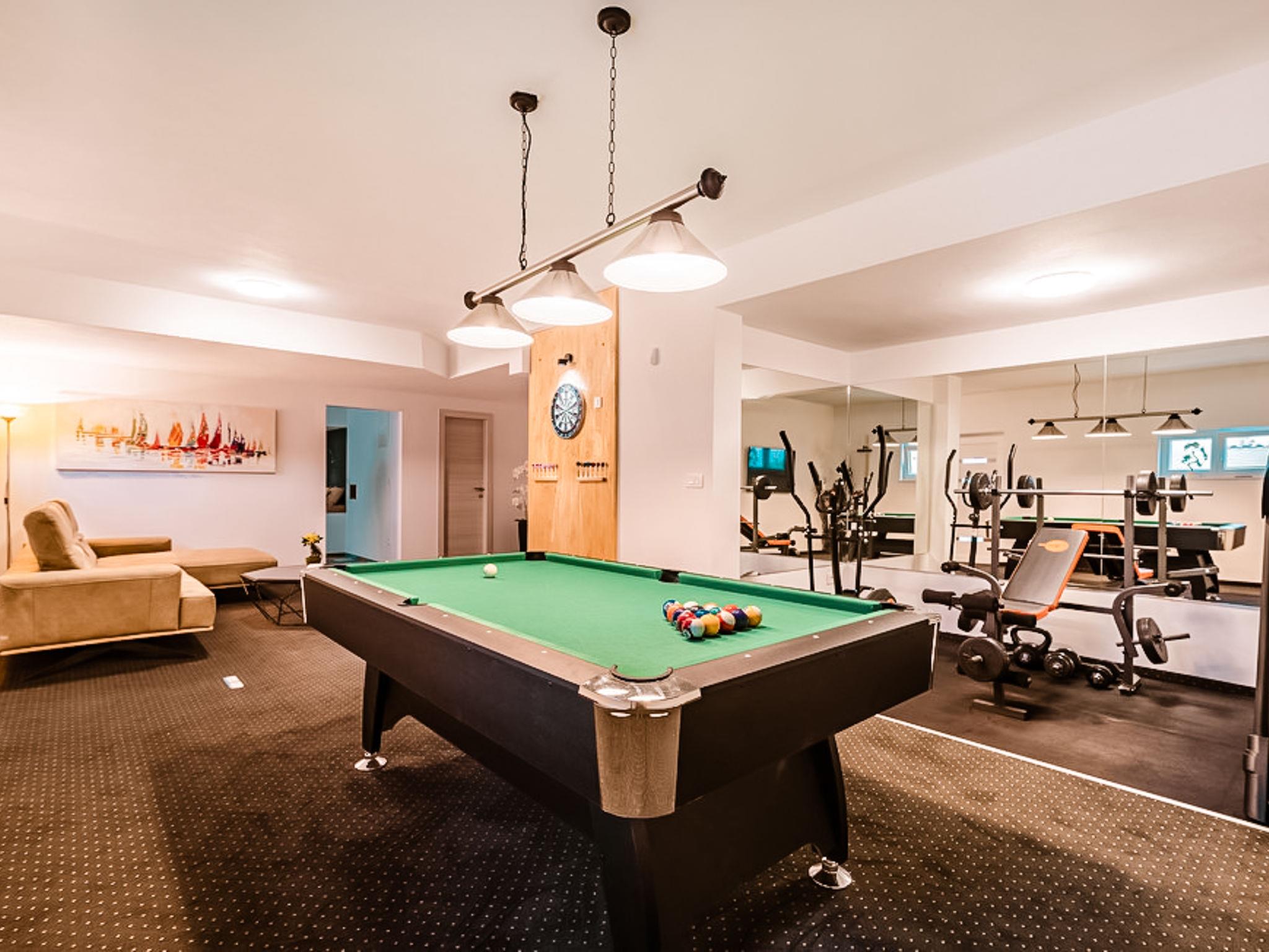 Luxurious villa "Michel", 2 storeys, built in 2024. 28 km from the centre of Zadar, in a sunny, elevated position, 600 m from the sea, 600 m from the beach, located by a road. Private: property 500 m2 (fenced), swimming pool angular (8 x 4 m, depth 150 cm, seasonal availability: 02.May. - 26.Sep.) with internal staircase. WC in the pool area, hot tub, pool house with shower, garden furniture, barbecue, pool maintenance by the owner/gardener. In the house: internet access, sauna, fitness room, billiard table, washing machine, tumble dryer. Parking (for 2 cars) at the house on the premises. Shop 1 km, restaurant 600 m, bus stop 900 m, pebble beach 600 m. Nearby attractions: NP Paklenica 17 km, rafting Zrmanja 35 km. Groups of teenagers on request only.