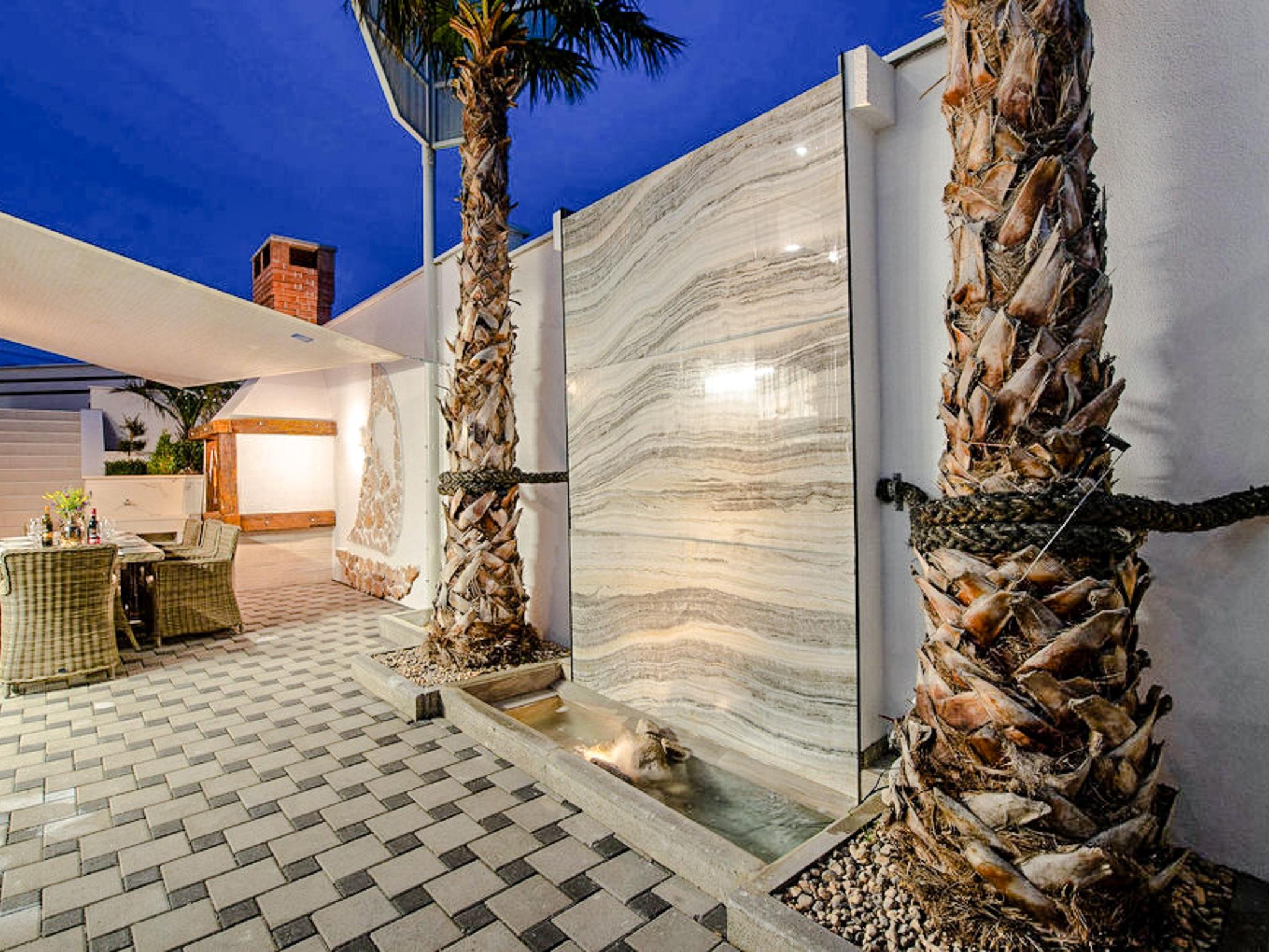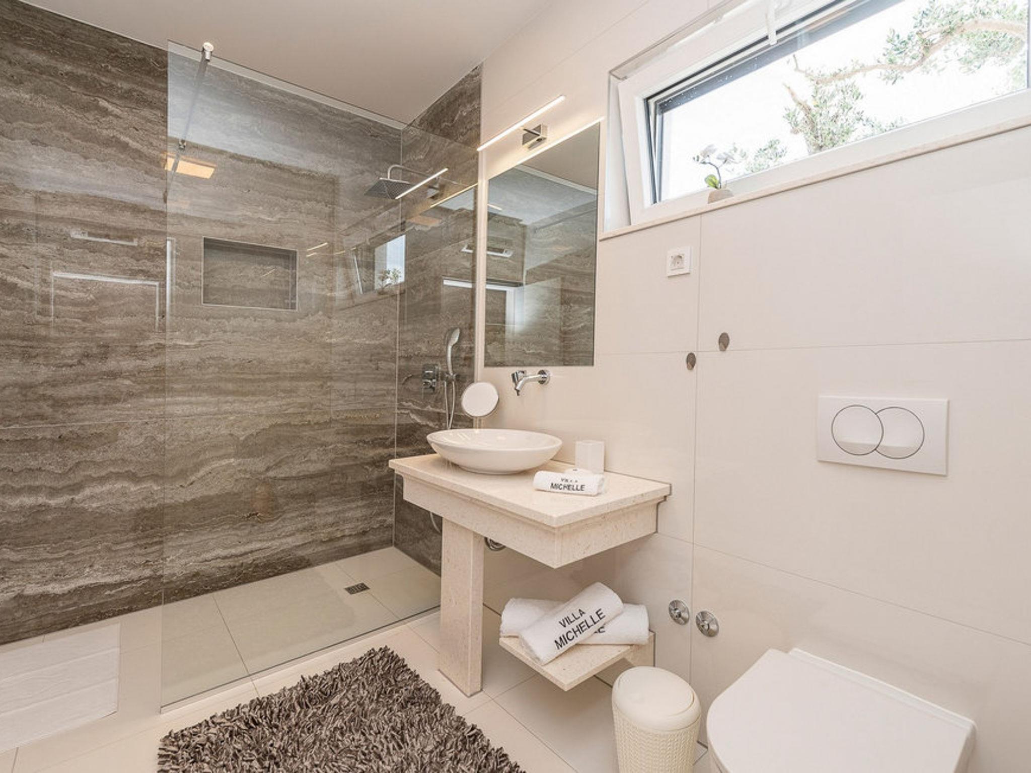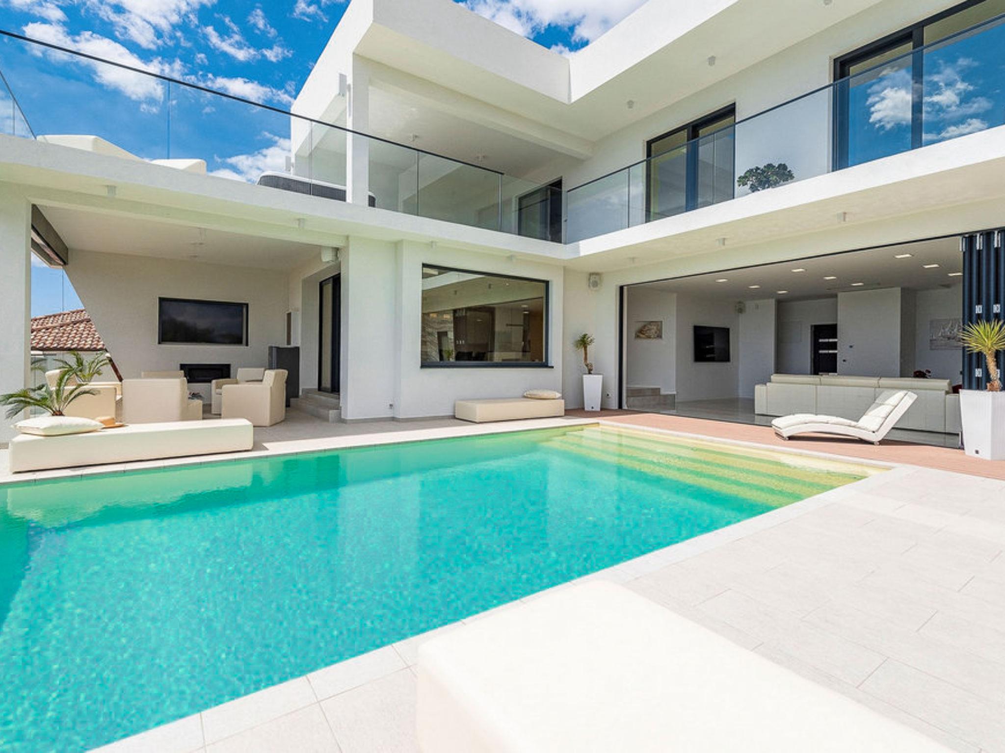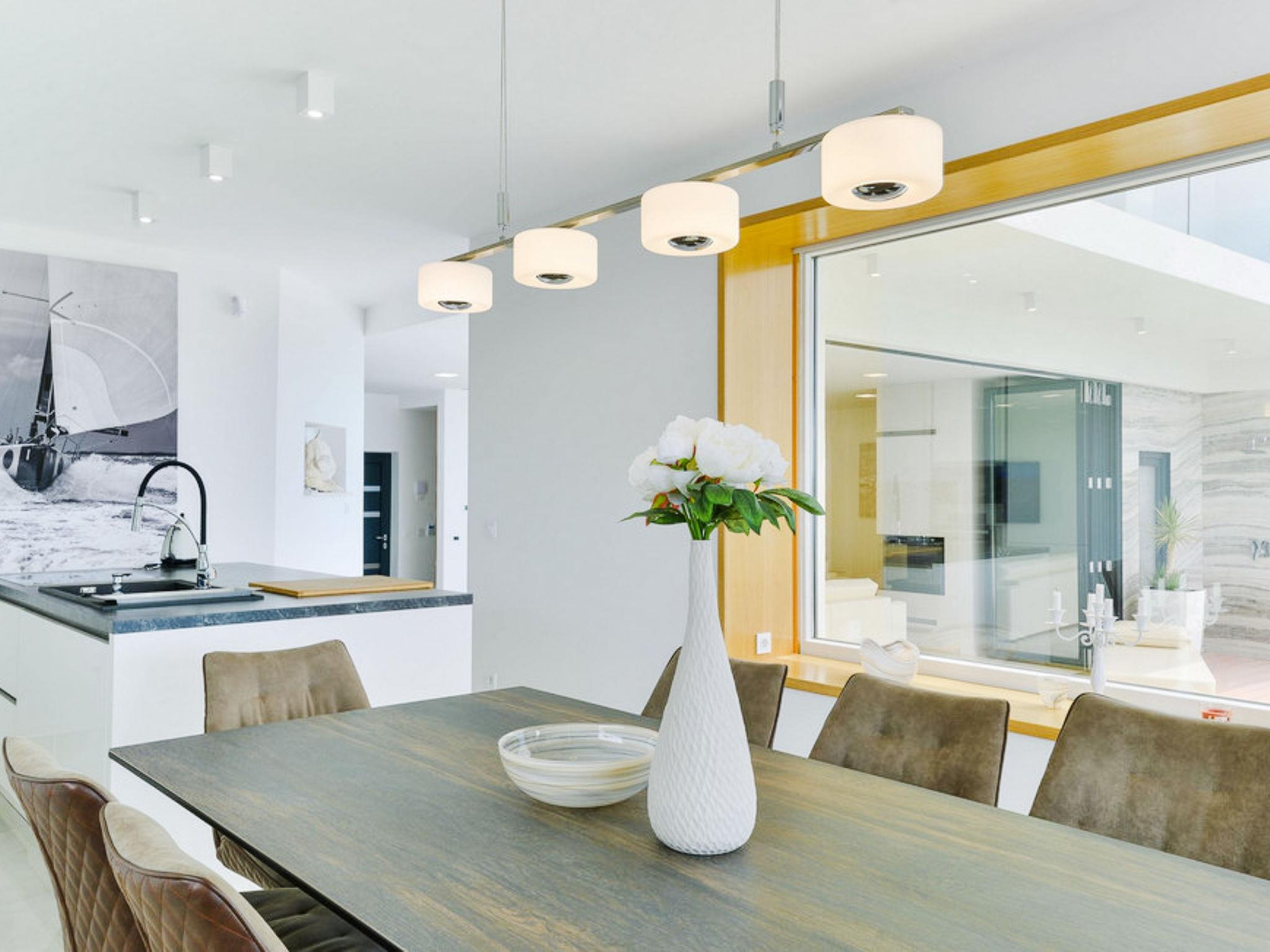 Luxurious villa "Michel", 2 storeys, built in 2024. 28 km from the centre of Zadar, in a sunny, elevated position, 600 m from the sea, 600 m from the beach, located by a road. Private: property 500 m2 (fenced), swimming pool angular (8 x 4 m, depth 150 cm, seasonal availability: 02.May. - 26.Sep.) with internal staircase. WC in the pool area, hot tub, pool house with shower, garden furniture, barbecue, pool maintenance by the owner/gardener. In the house: internet access, sauna, fitness room, billiard table, washing machine, tumble dryer. Parking (for 2 cars) at the house on the premises. Shop 1 km, restaurant 600 m, bus stop 900 m, pebble beach 600 m. Nearby attractions: NP Paklenica 17 km, rafting Zrmanja 35 km. Groups of teenagers on request only.