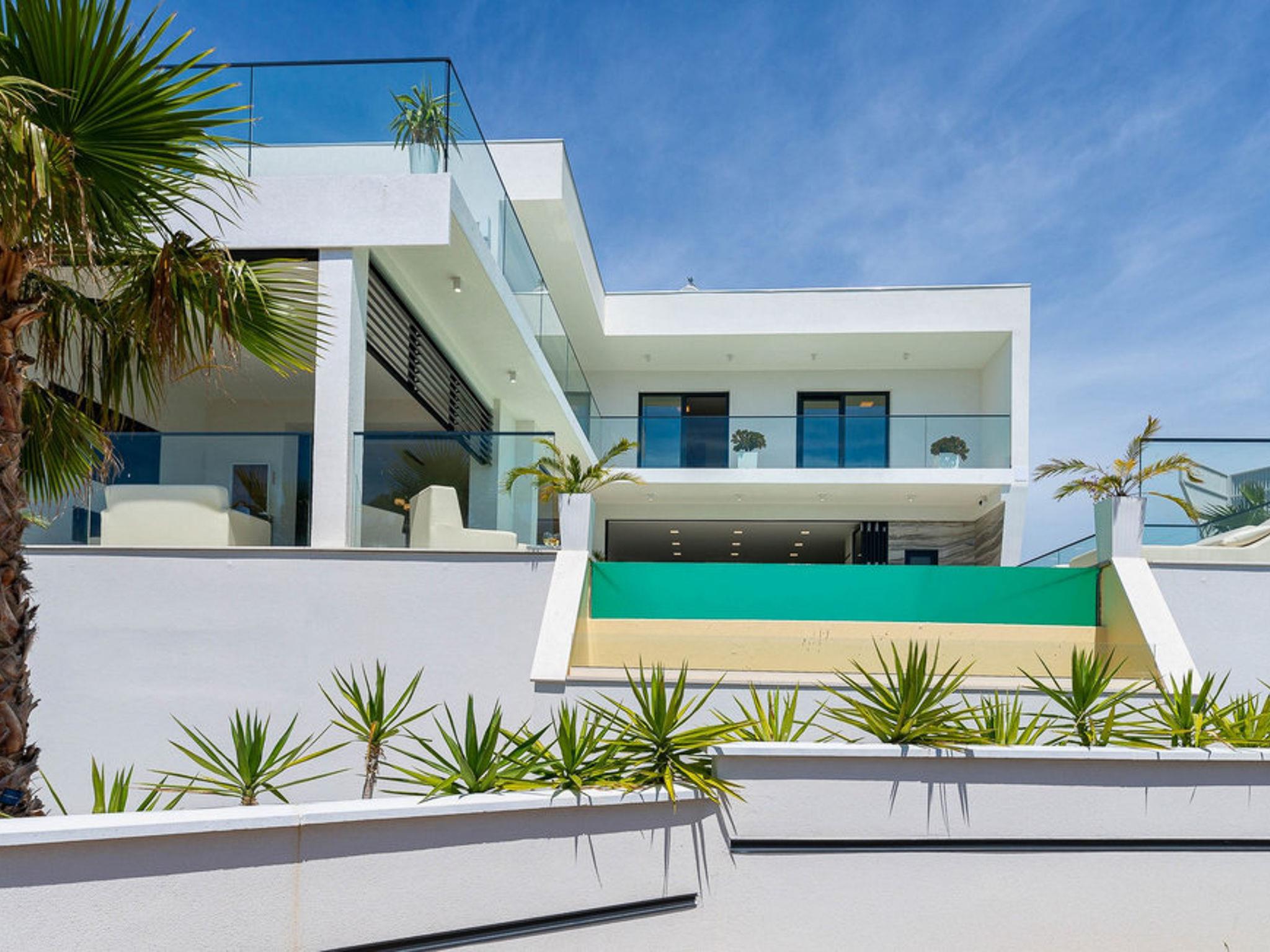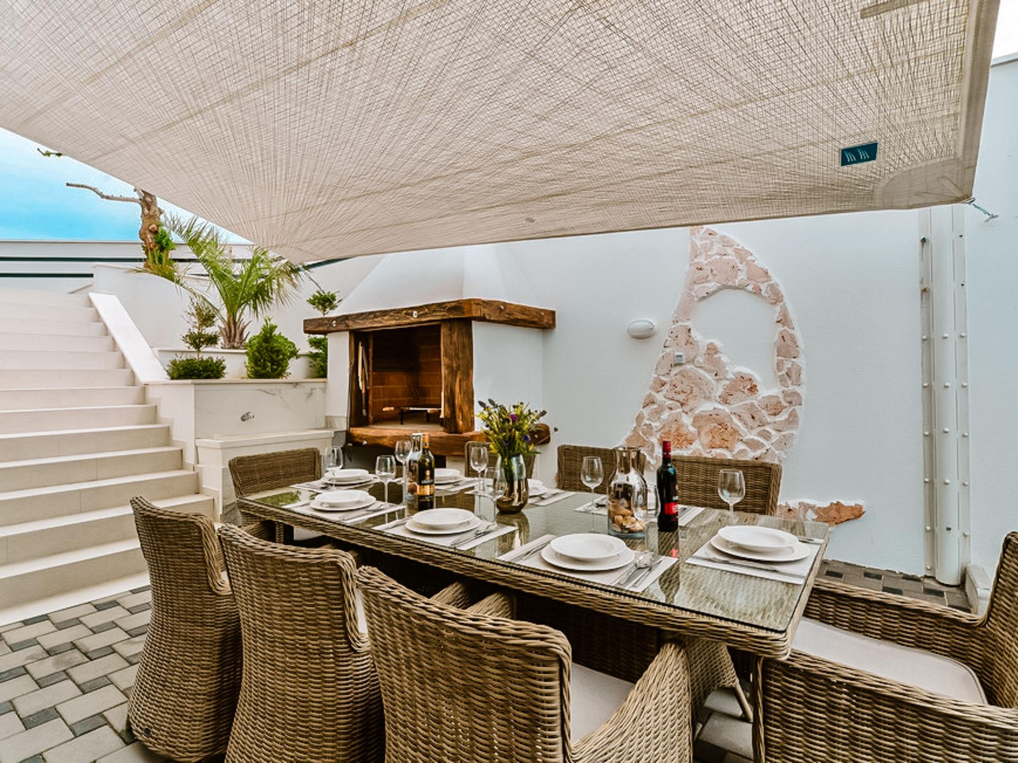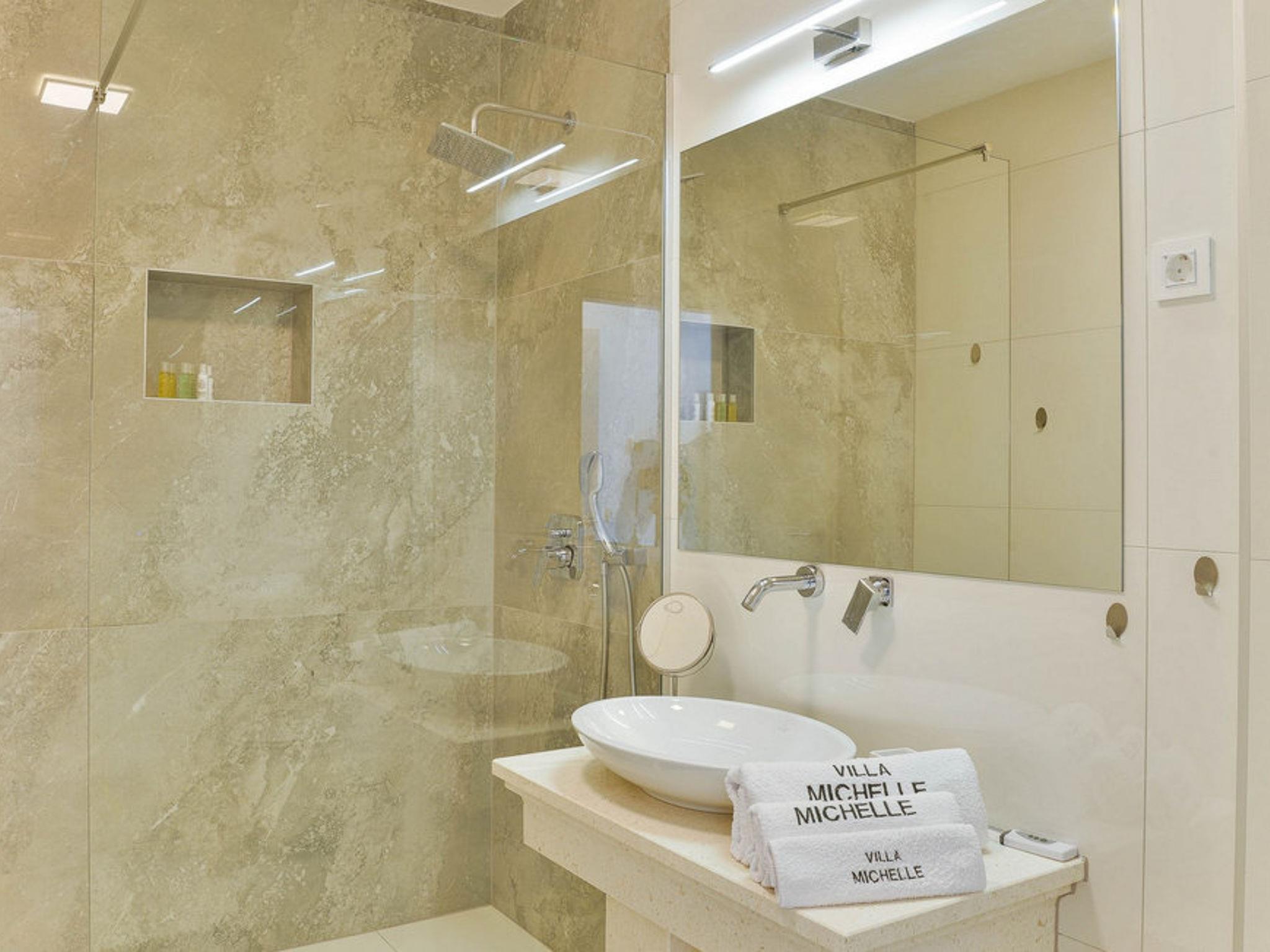 5-room villa 400 m2 on 2 levels. In 2024, very modern and luxurious furnishings: large living/dining room with satellite TV and air conditioning. Exit to the terrace, to the swimming pool. 1 room with 1 french bed (180 cm, length 200 cm), shower/WC, satellite TV and air conditioning. Open kitchen (oven, dishwasher, 4 induction hot plates, toaster, kettle, microwave, freezer, electric coffee machine) with air conditioning. Exit to the terrace, to the swimming pool. Shower/WC. Upper floor: 3 rooms, each room with 1 french bed (180 cm, length 200 cm), shower/WC, satellite TV and air conditioning. Exit to the balcony. No heating option. Terrace 30 m2, roofed. Terrace furniture, deck chairs. Panoramic view of the sea. Facilities: safe, iron, hair dryer. Internet (WiFi, free). Please note: non-smoking house.