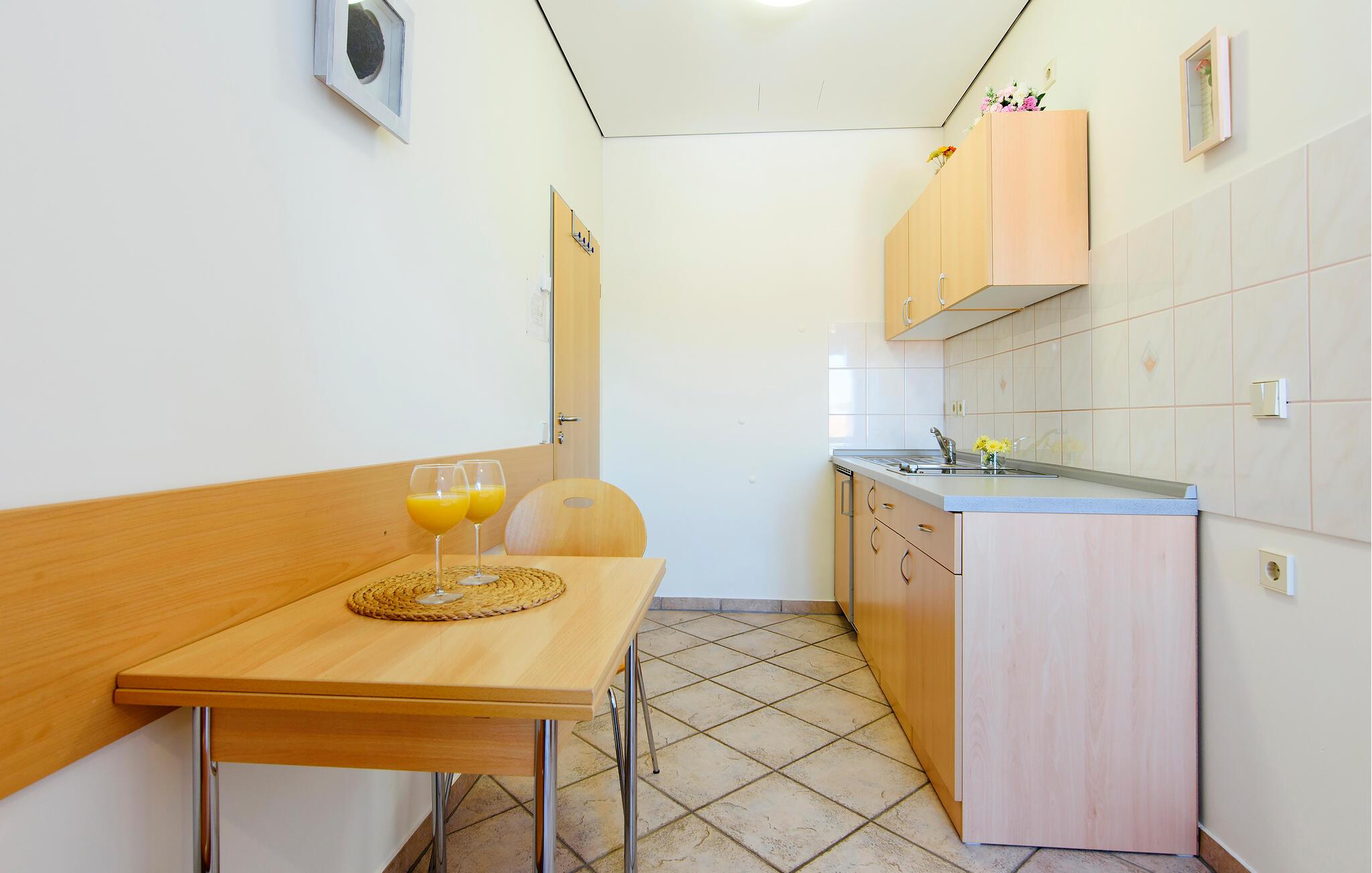 Den lyse og velholdte ferielejlighed tilbyder jer en venlig base for en solrig pause ved Adriaterhavet. Tilbered lækre retter i det charmerende køkken og tag plads ved det indbydende spisebord. Planlæg jeres næste udflugter her eller afslut dagen med en spilleaften.