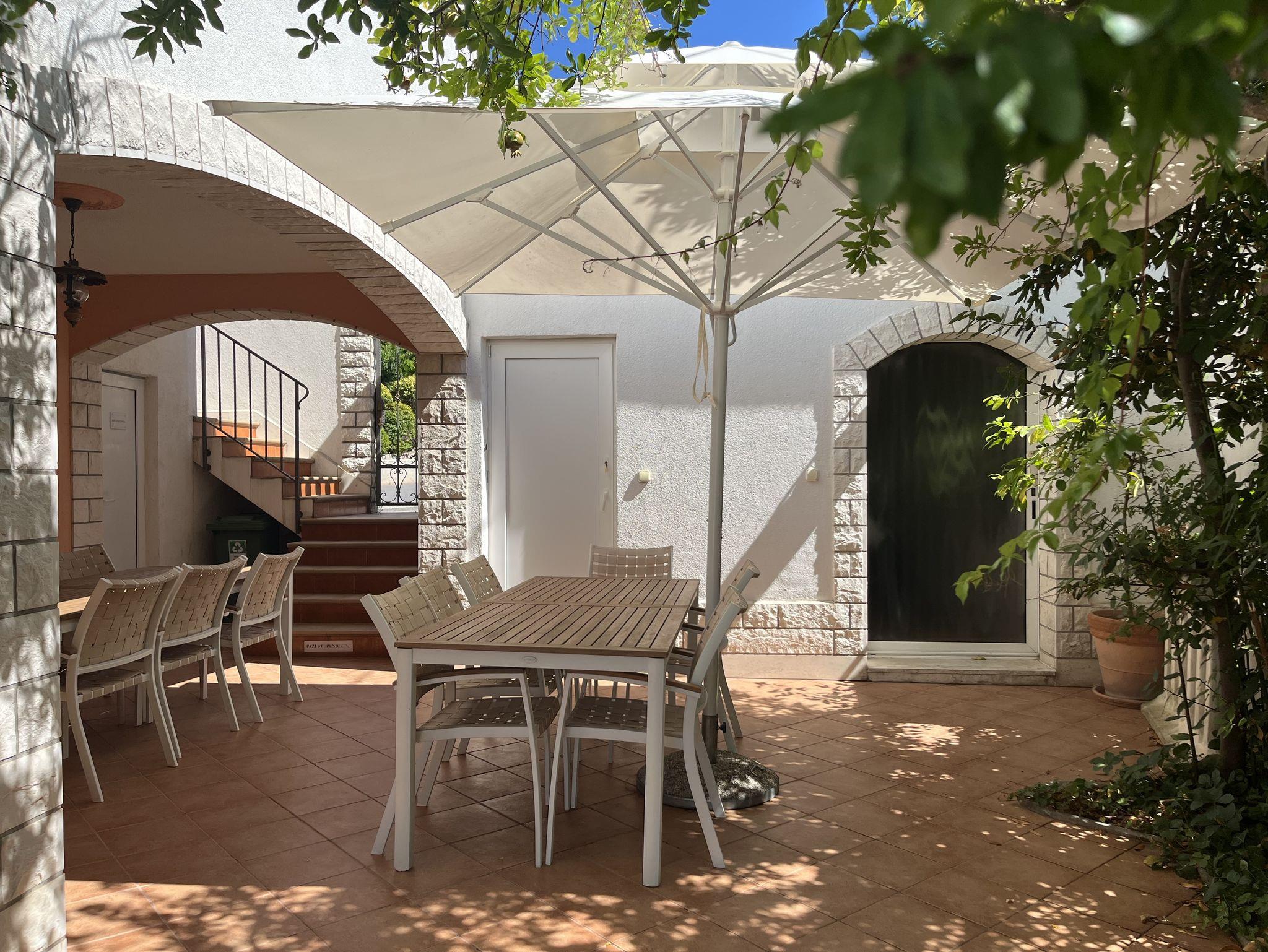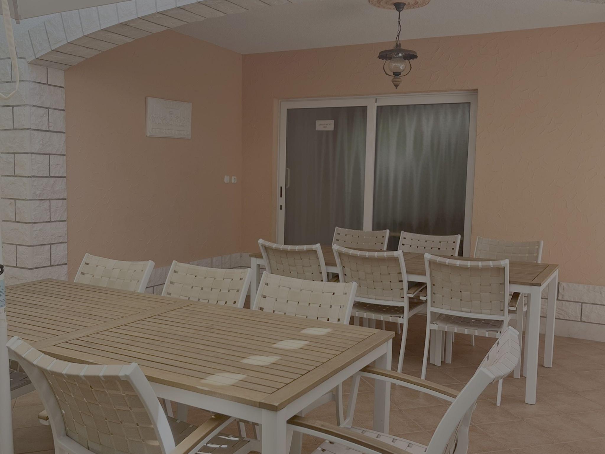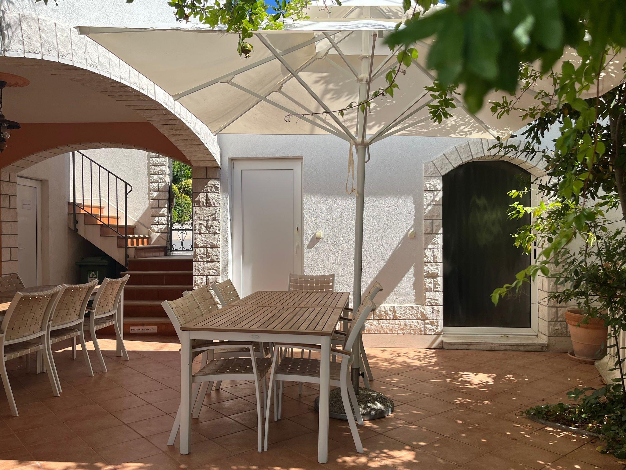 Ferienwohnung bietet Platz für 12 Gäste. Die Betten sind in Schlafzimmern, die es 5 gibt, und in Wohnzimmer, innerhalb einer Gesamtfläche von 144m2, angeordnet. Die Gäste haben eine eigene Terrasse zur Verfügung, auf der sie in warmen Sommernächten genießen können. Das Apartment bietet Meerblick. Es ist erlaubt, Speisen auf dem Gemeinschafts-Grill vorzubereiten. Räume der gebuchten Unterkunftseinheit werden nicht in eine Ganze verbunden. IM PREIS INBEGRIFFEN: Kurtaxe, Endreinigung, Klimatisierung, Parkplatz, Internet, Föhn, Liegestühle. VERBINDLICHE ZUSÄTZLICHE KOSTEN: Aufzahlung für Kurzaufenthalte (prozentualer Zuschlag pro Nächtigungsanzahl: 30% - 1, 20% - 2, 10% - 3). Die Verfügbarkeit zusätzlicher Dienstleistungen in Ihrem reservierten Termin und die Preise derselben (falls nicht aufgeführt) müssen im Voraus überprüft werden. Zusätzliche Dienstleistungen die in der Zahlungsaufforderung nicht aufgeführt sind werden direkt beim Vermieter bezahlt, angenommen der Gast nutzt auch diese. Ermäßigung auf den Grundpreis: Gratistag 14=13 (bei einem Aufenthalt von 14 Tagen oder mehr erhalten Sie einen Gratistag für den Aufenthalt bis 31.12.26).