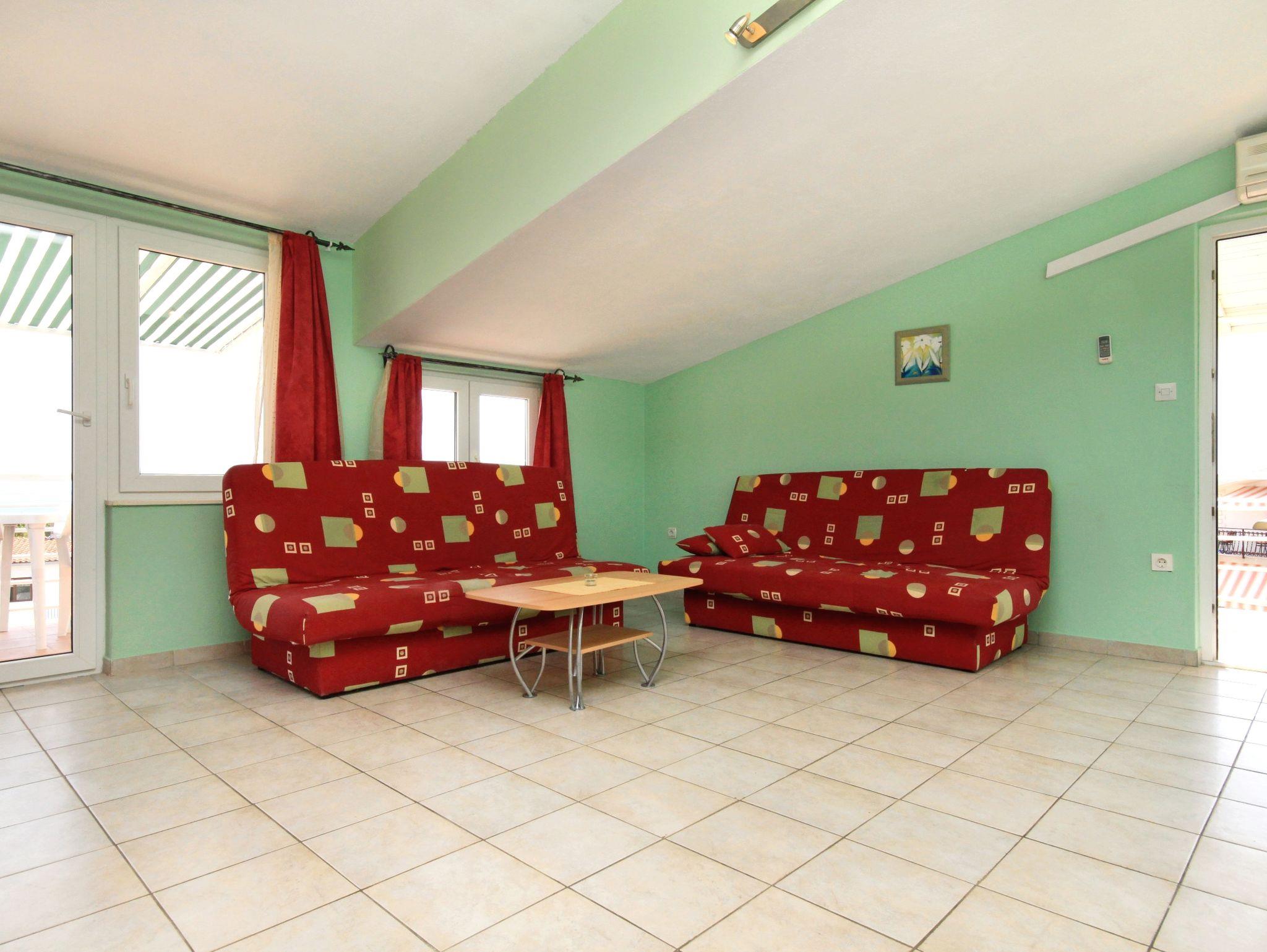 Ferienwohnung bietet Platz für 4 Gäste. Die Betten sind in Schlafzimmern, die es 1 gibt, und in Wohnzimmer, innerhalb einer Gesamtfläche von 37m2, angeordnet. Die Gäste haben einen eigenen Balkon zur Verfügung, auf der sie in warmen Sommernächten genießen können. Das Apartment bietet Meerblick. Es ist erlaubt, Speisen auf dem Gemeinschafts-Grill vorzubereiten. In der Unterkunftseinheit besteht die Möglichkeit des Mitbringens von Haustieren gegen Aufpreis. IM PREIS INBEGRIFFEN: Kurtaxe, Endreinigung, Klimatisierung, Parkplatz, Internet, Kinderbett. VERBINDLICHE ZUSÄTZLICHE KOSTEN: Aufzahlung für Kurzaufenthalte (prozentualer Zuschlag pro Nächtigungsanzahl: 30% - 1, 20% - 2, 10% - 3). UNVERBINDLICHE ZUSÄTZLICHE KOSTEN: Haustiere (5,00 € pro Nacht). Die Verfügbarkeit zusätzlicher Dienstleistungen in Ihrem reservierten Termin und die Preise derselben (falls nicht aufgeführt) müssen im Voraus überprüft werden. Zusätzliche Dienstleistungen die in der Zahlungsaufforderung nicht aufgeführt sind werden direkt beim Vermieter bezahlt, angenommen der Gast nutzt auch diese. Ermäßigung auf den Grundpreis: Gratistag 14=13 (bei einem Aufenthalt von 14 Tagen oder mehr erhalten Sie einen Gratistag für den Aufenthalt bis 31.12.26).