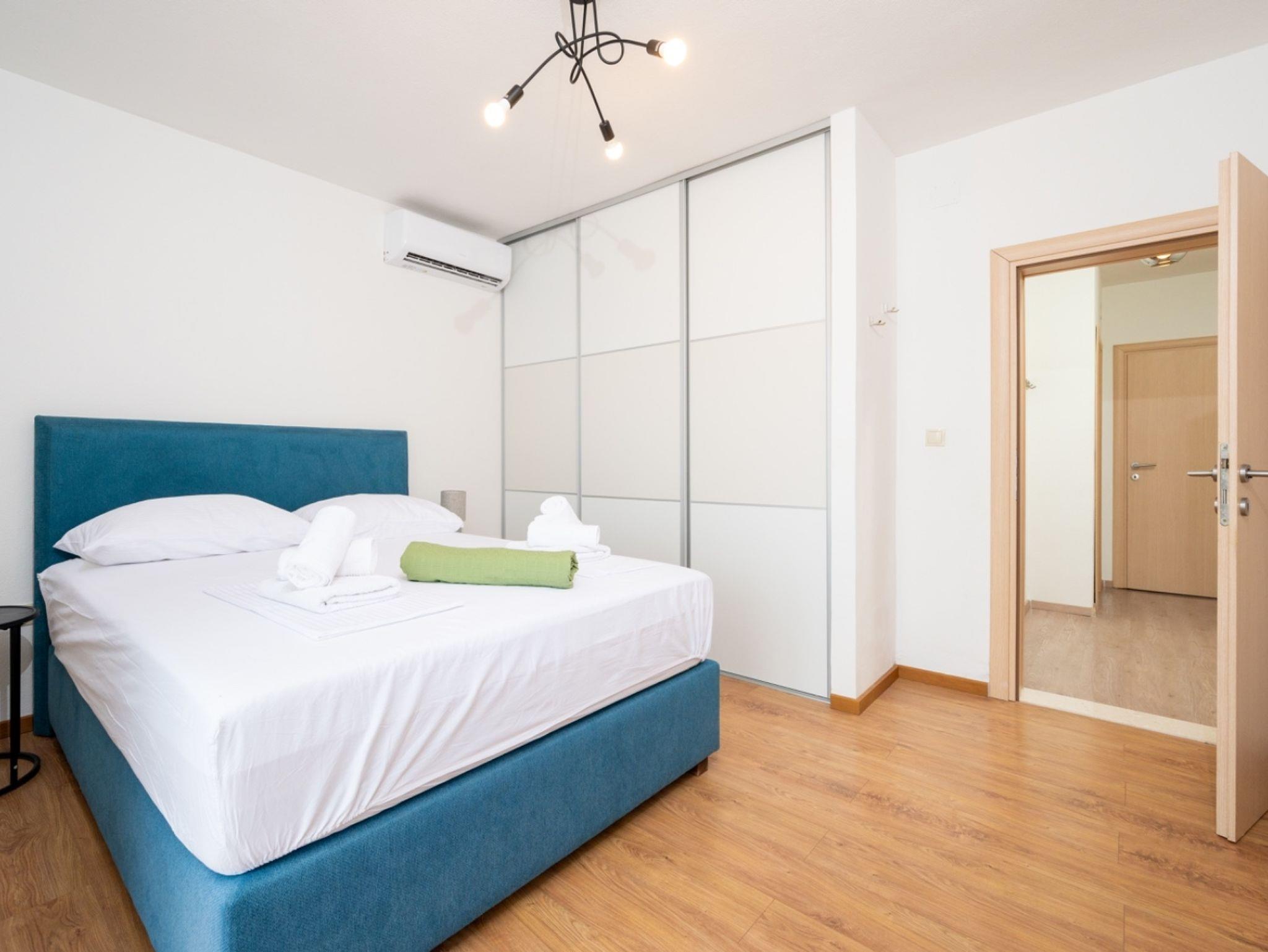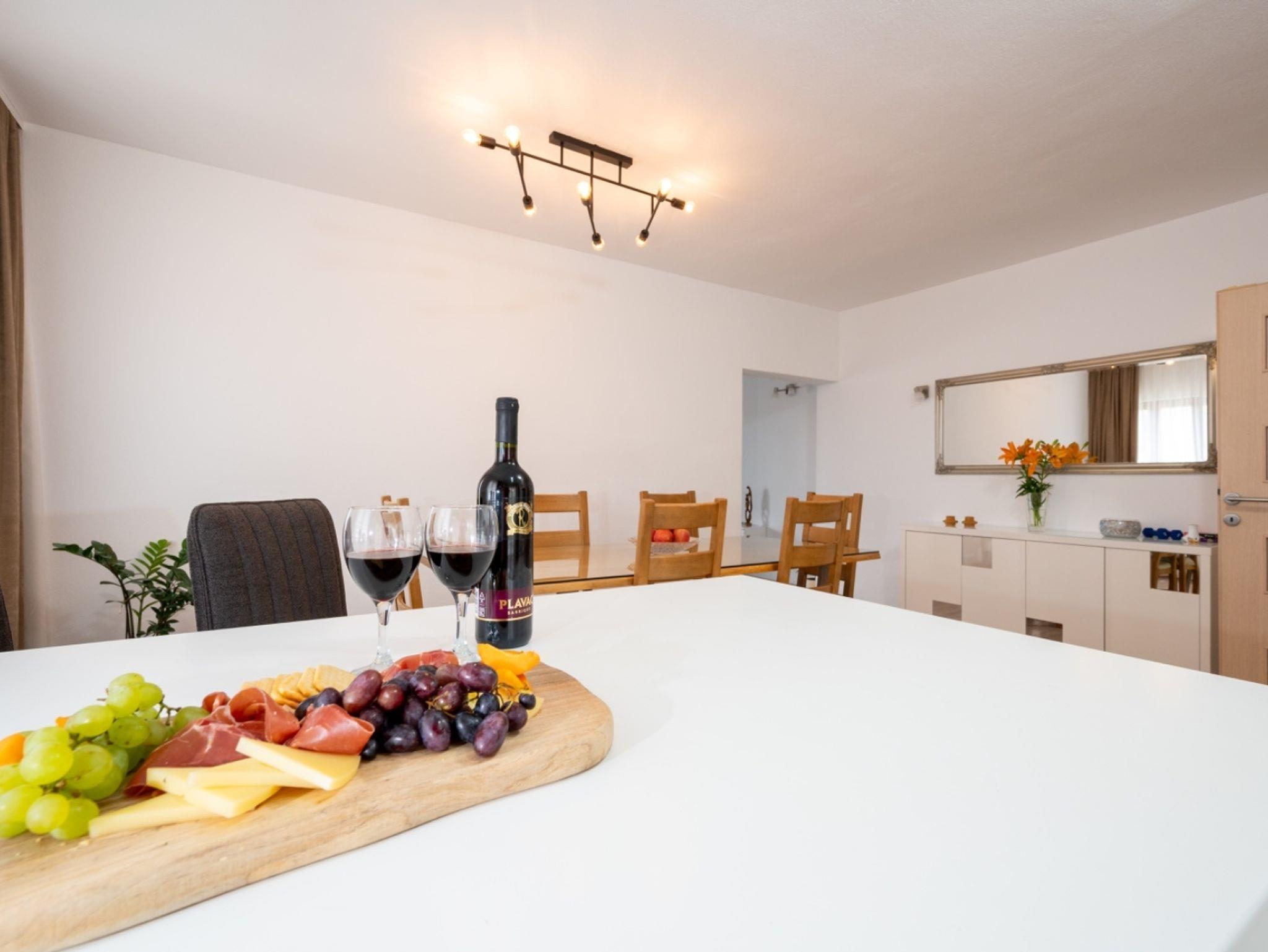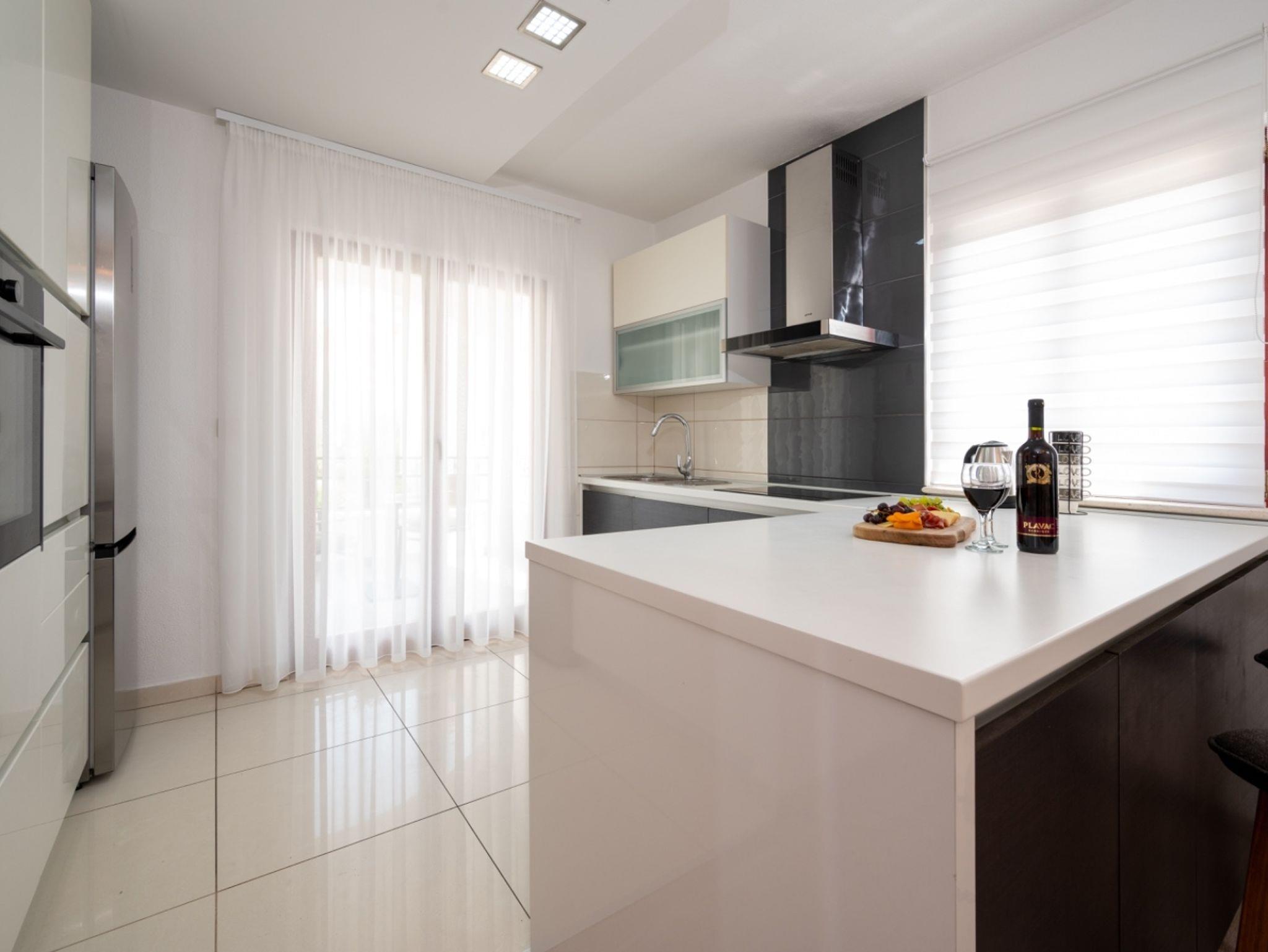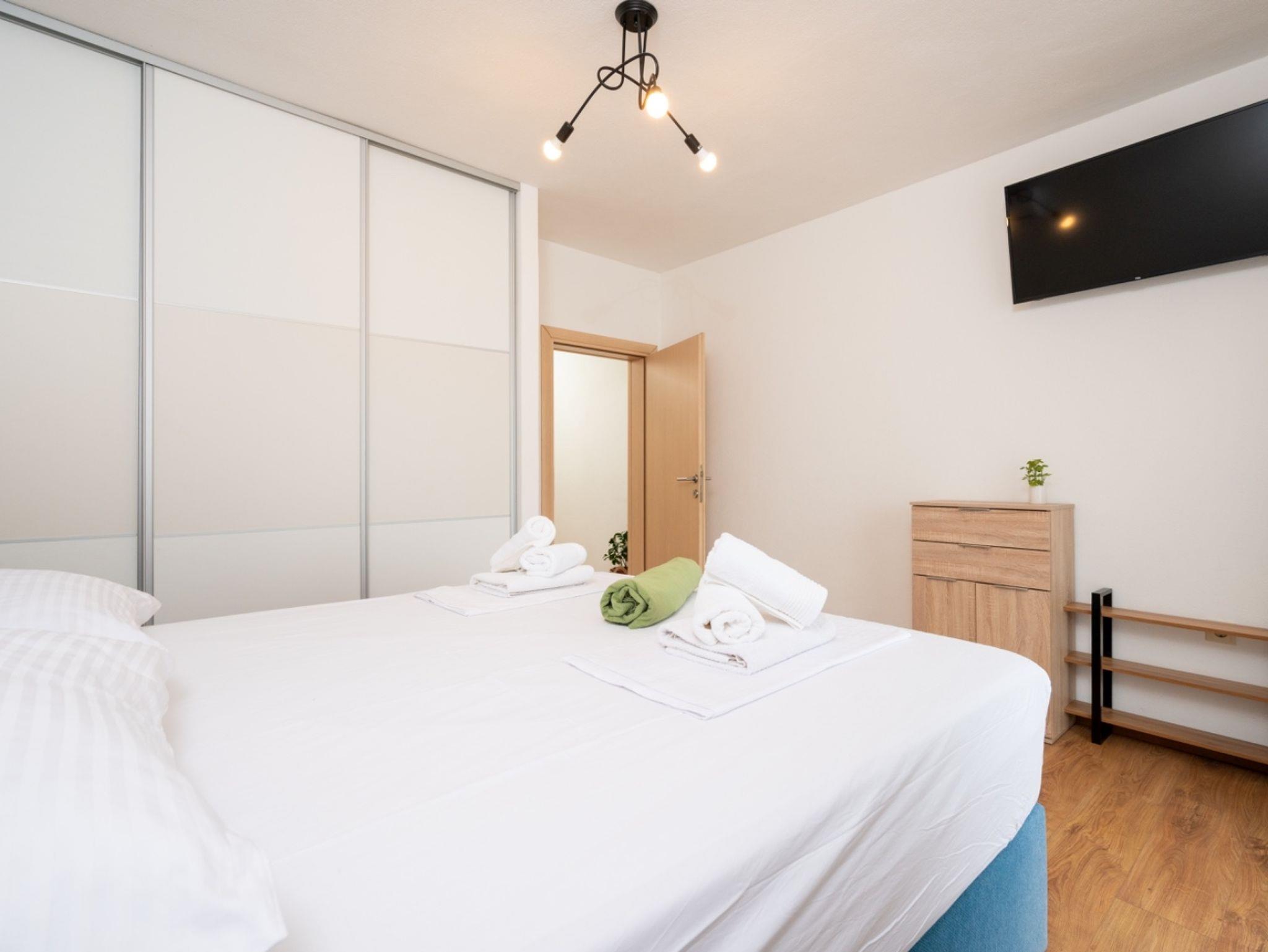 Ferienwohnung bietet Platz für 5 Gäste. Die Betten sind in Schlafzimmern, die es 2 gibt, und in Wohnzimmer, innerhalb einer Gesamtfläche von 90m2, angeordnet. Die Gäste haben eine eigene Terrasse zur Verfügung, auf der sie in warmen Sommernächten genießen können. Das Apartment bietet Meerblick. IM PREIS INBEGRIFFEN: Kurtaxe, Endreinigung, Klimatisierung, Parkplatz, Internet, Kinderbett, Bügeleisen, Bügelbrett, Föhn. VERBINDLICHE ZUSÄTZLICHE KOSTEN: Aufzahlung für Kurzaufenthalte (prozentualer Zuschlag pro Nächtigungsanzahl: 30% - 1, 20% - 2, 10% - 3). Die Verfügbarkeit zusätzlicher Dienstleistungen in Ihrem reservierten Termin und die Preise derselben (falls nicht aufgeführt) müssen im Voraus überprüft werden. Zusätzliche Dienstleistungen die in der Zahlungsaufforderung nicht aufgeführt sind werden direkt beim Vermieter bezahlt, angenommen der Gast nutzt auch diese.