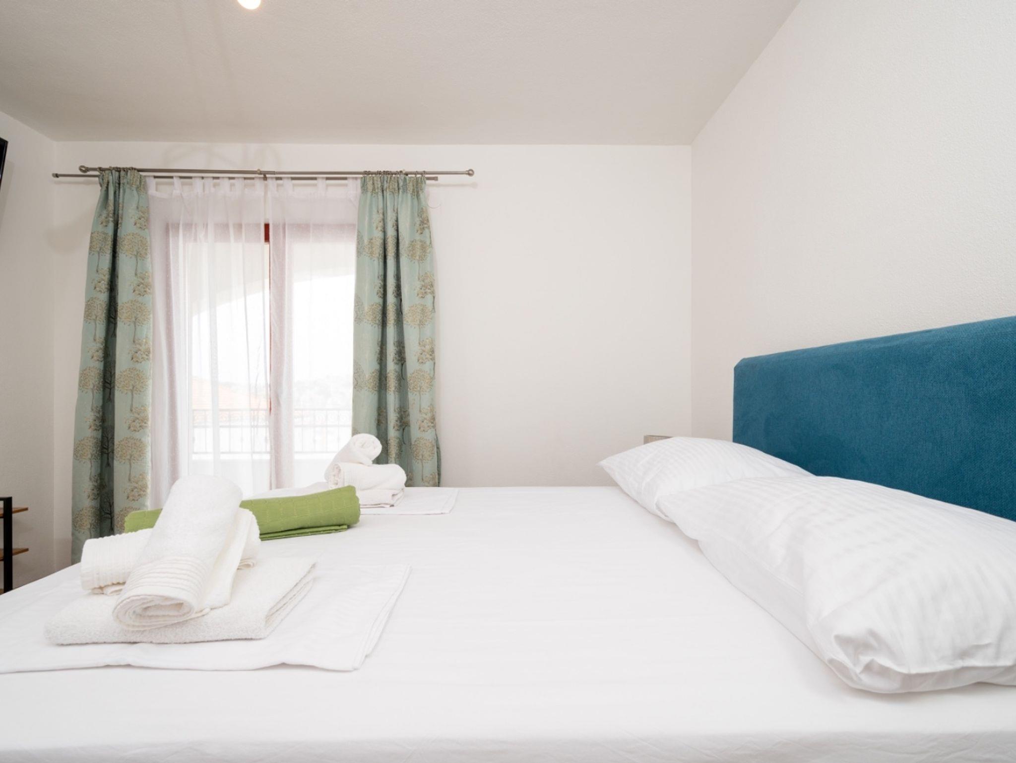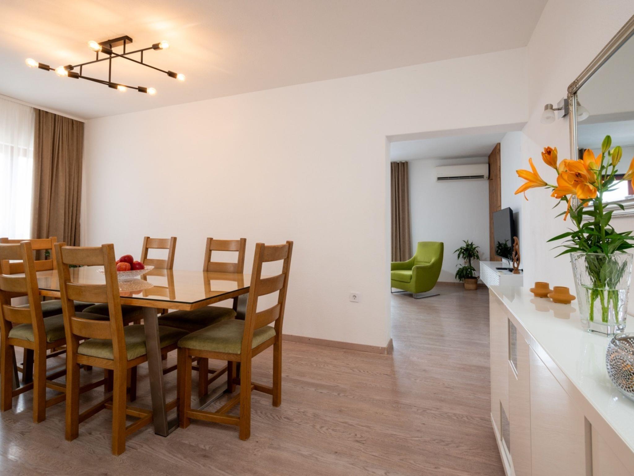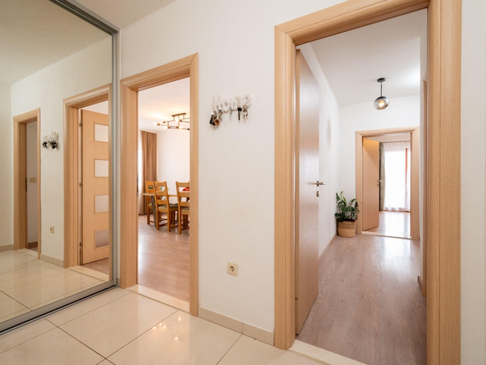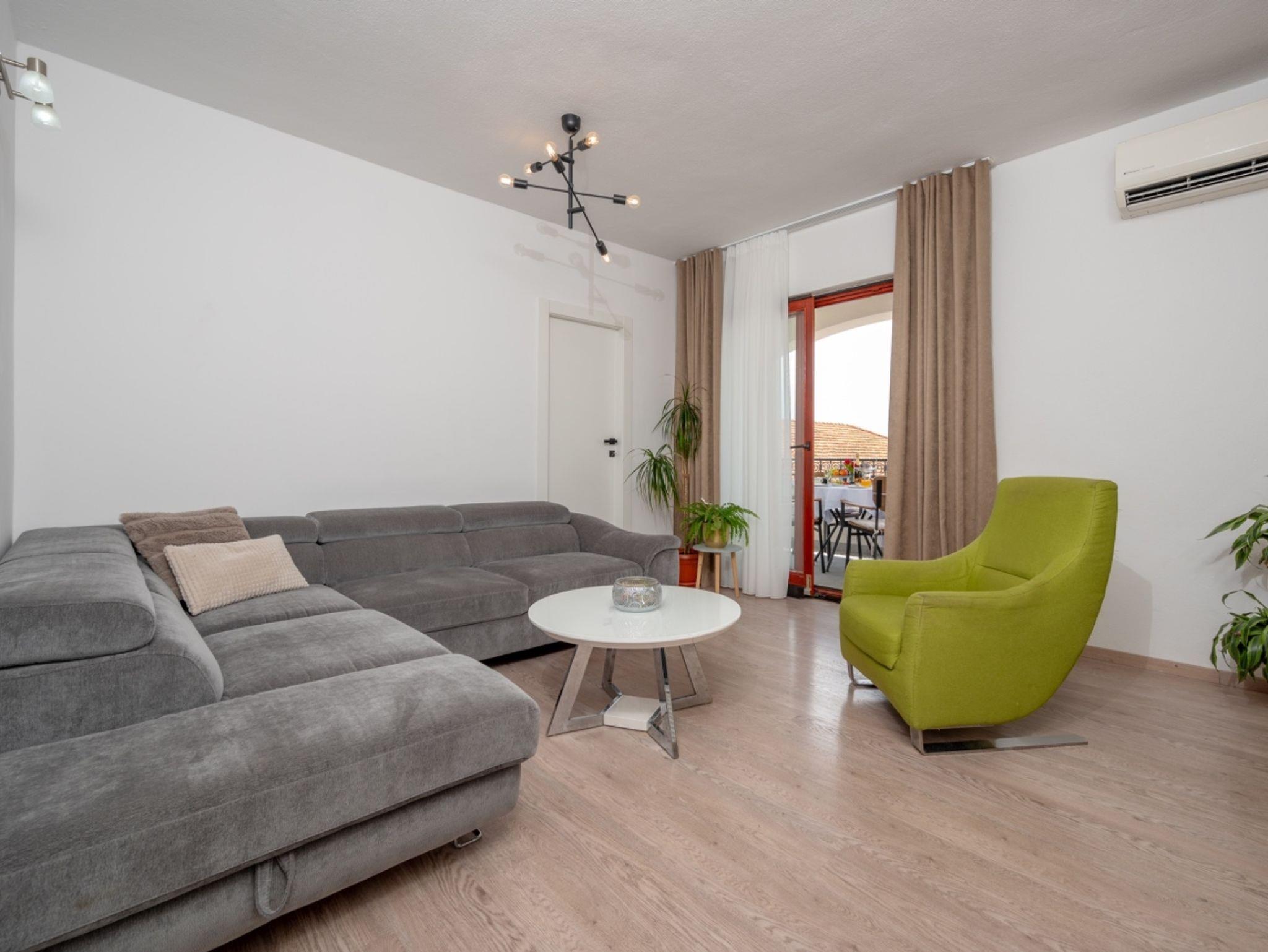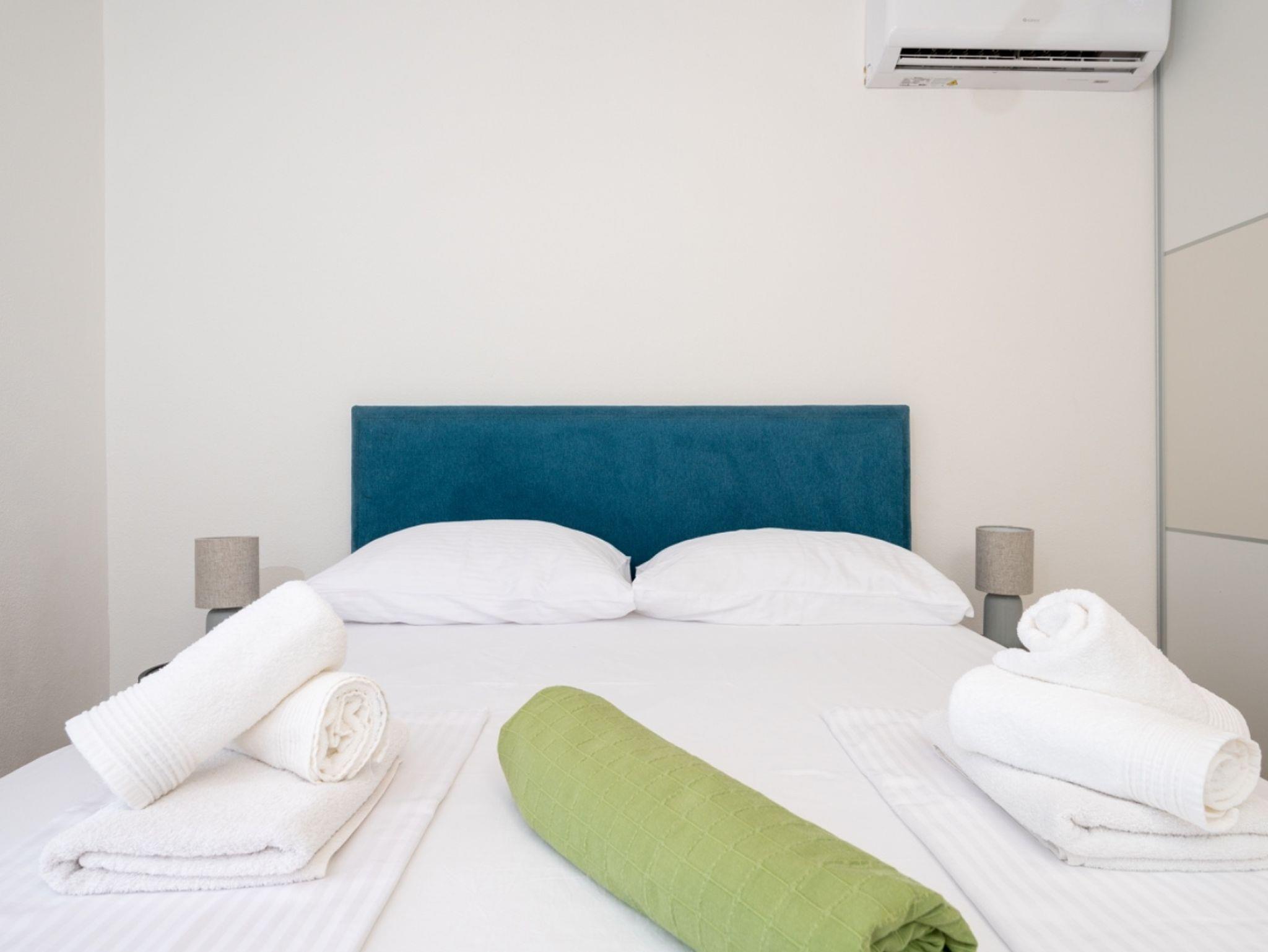 Ferienwohnung bietet Platz für 5 Gäste. Die Betten sind in Schlafzimmern, die es 2 gibt, und in Wohnzimmer, innerhalb einer Gesamtfläche von 90m2, angeordnet. Die Gäste haben eine eigene Terrasse zur Verfügung, auf der sie in warmen Sommernächten genießen können. Das Apartment bietet Meerblick. IM PREIS INBEGRIFFEN: Kurtaxe, Endreinigung, Klimatisierung, Parkplatz, Internet, Kinderbett, Bügeleisen, Bügelbrett, Föhn. VERBINDLICHE ZUSÄTZLICHE KOSTEN: Aufzahlung für Kurzaufenthalte (prozentualer Zuschlag pro Nächtigungsanzahl: 30% - 1, 20% - 2, 10% - 3). Die Verfügbarkeit zusätzlicher Dienstleistungen in Ihrem reservierten Termin und die Preise derselben (falls nicht aufgeführt) müssen im Voraus überprüft werden. Zusätzliche Dienstleistungen die in der Zahlungsaufforderung nicht aufgeführt sind werden direkt beim Vermieter bezahlt, angenommen der Gast nutzt auch diese.