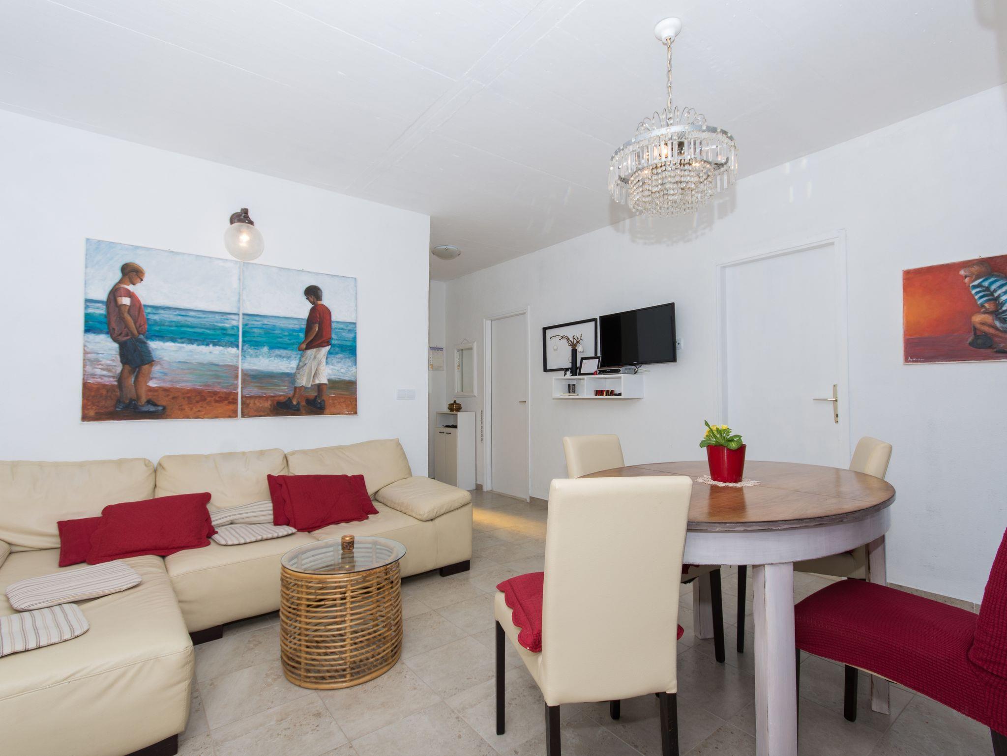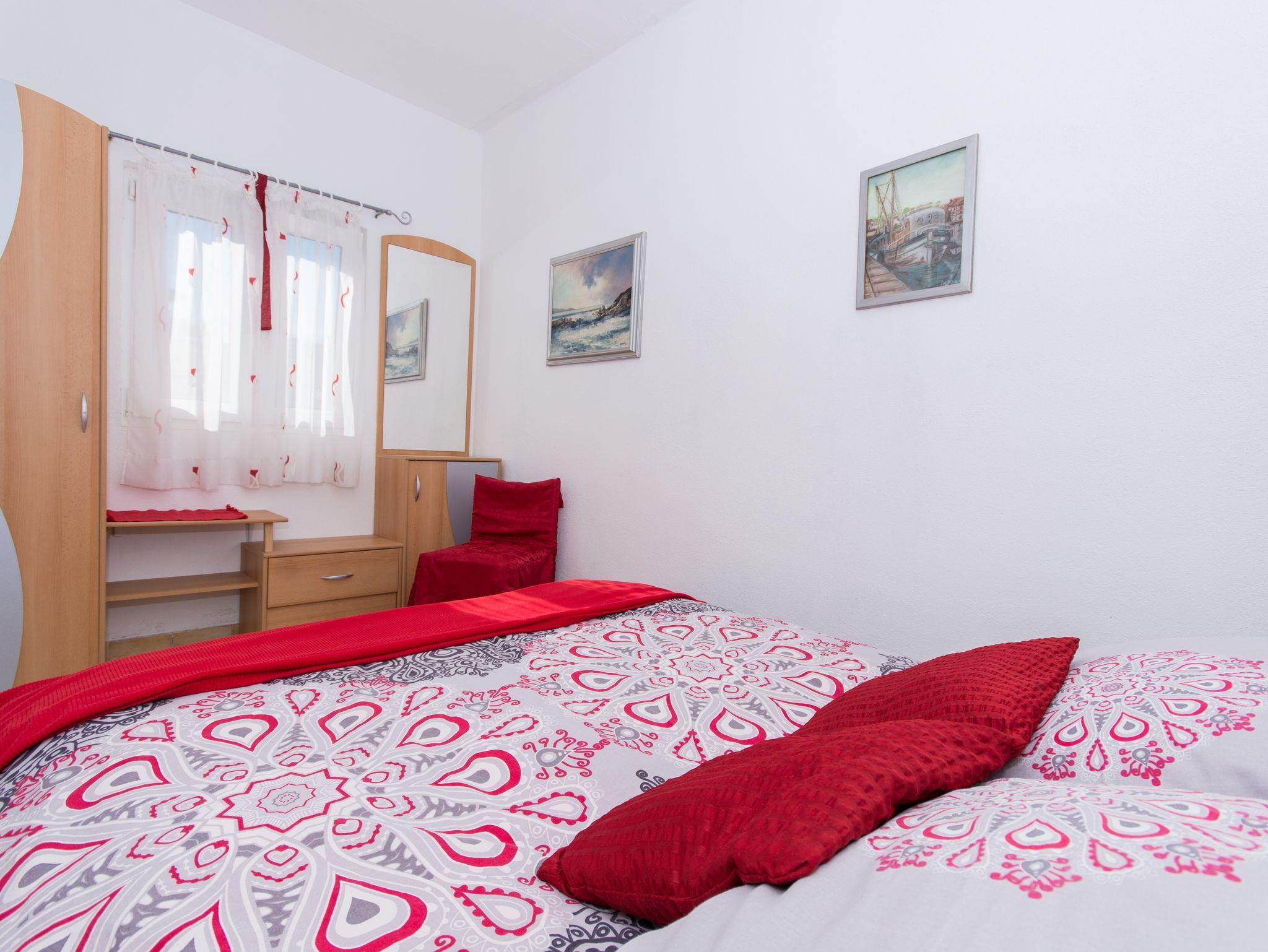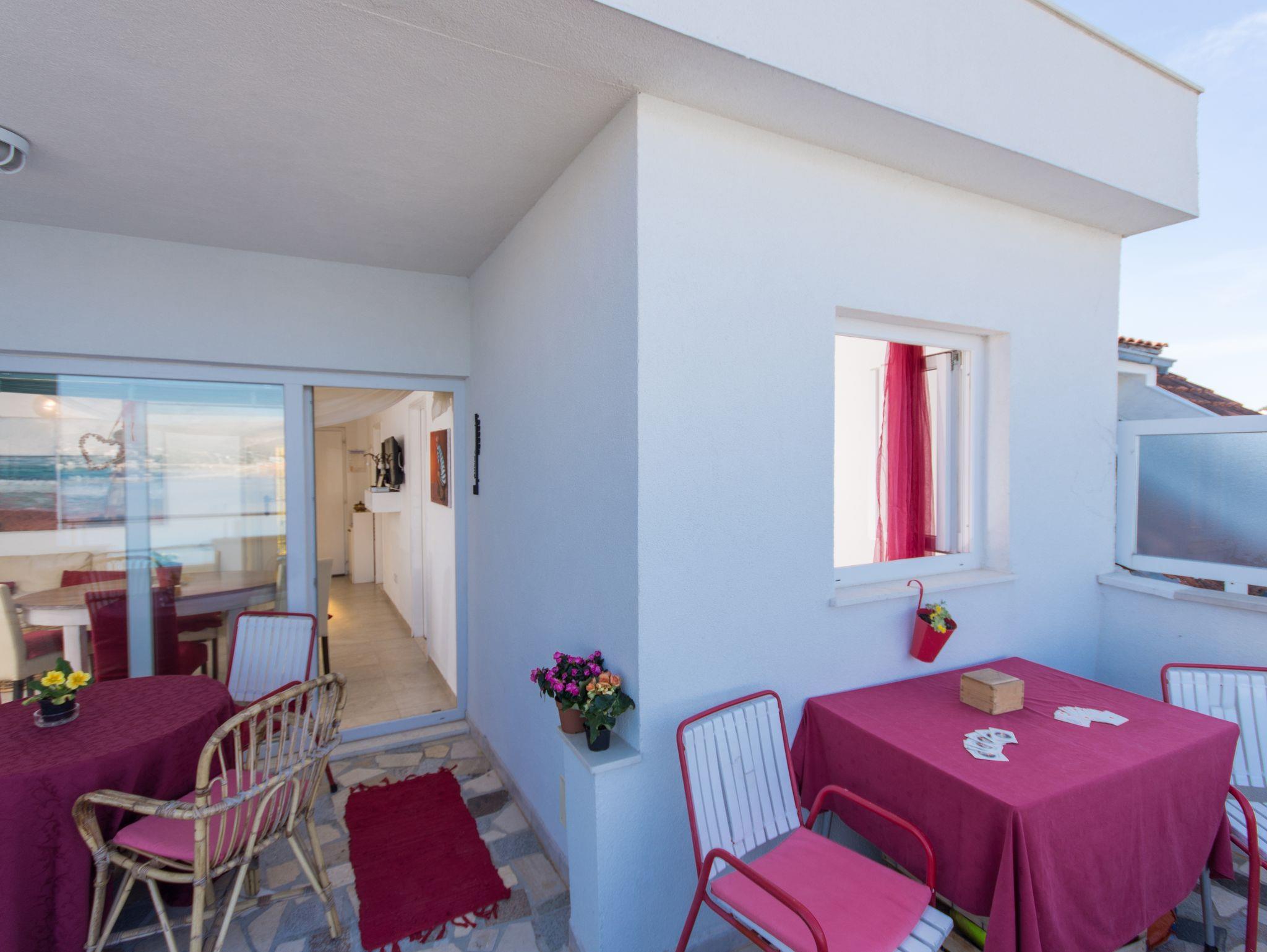 Ferienwohnung bietet Platz für 5 Gäste. Die Betten sind in Schlafzimmern, die es 2 gibt, und in Wohnzimmer, innerhalb einer Gesamtfläche von 39m2, angeordnet. Die Gäste haben eine eigene Terrasse zur Verfügung, auf der sie in warmen Sommernächten genießen können. Das Apartment bietet Meerblick. Es ist erlaubt, Speisen auf dem Gemeinschafts-Grill vorzubereiten. IM PREIS INBEGRIFFEN: Kurtaxe, Endreinigung, Klimatisierung, Parkplatz, Internet, Bügeleisen, Föhn. VERBINDLICHE ZUSÄTZLICHE KOSTEN: Aufzahlung für Kurzaufenthalte (prozentualer Zuschlag pro Nächtigungsanzahl: 30% - 1, 20% - 2, 10% - 3). Die Verfügbarkeit zusätzlicher Dienstleistungen in Ihrem reservierten Termin und die Preise derselben (falls nicht aufgeführt) müssen im Voraus überprüft werden. Zusätzliche Dienstleistungen die in der Zahlungsaufforderung nicht aufgeführt sind werden direkt beim Vermieter bezahlt, angenommen der Gast nutzt auch diese. Ermäßigung auf den Grundpreis: Gratistag 14=13 (bei einem Aufenthalt von 14 Tagen oder mehr erhalten Sie einen Gratistag für den Aufenthalt bis 31.12.26).