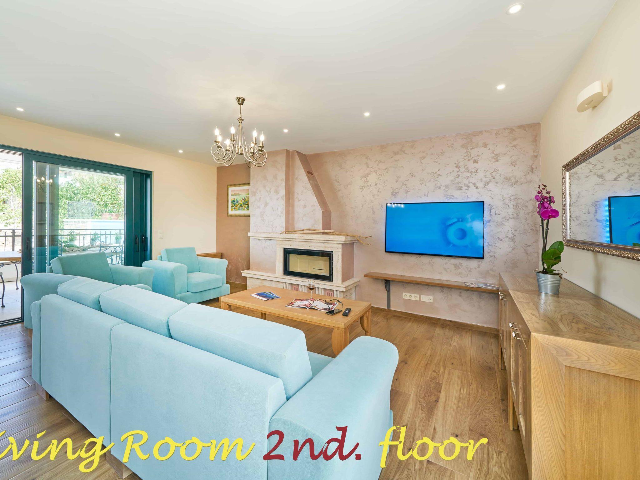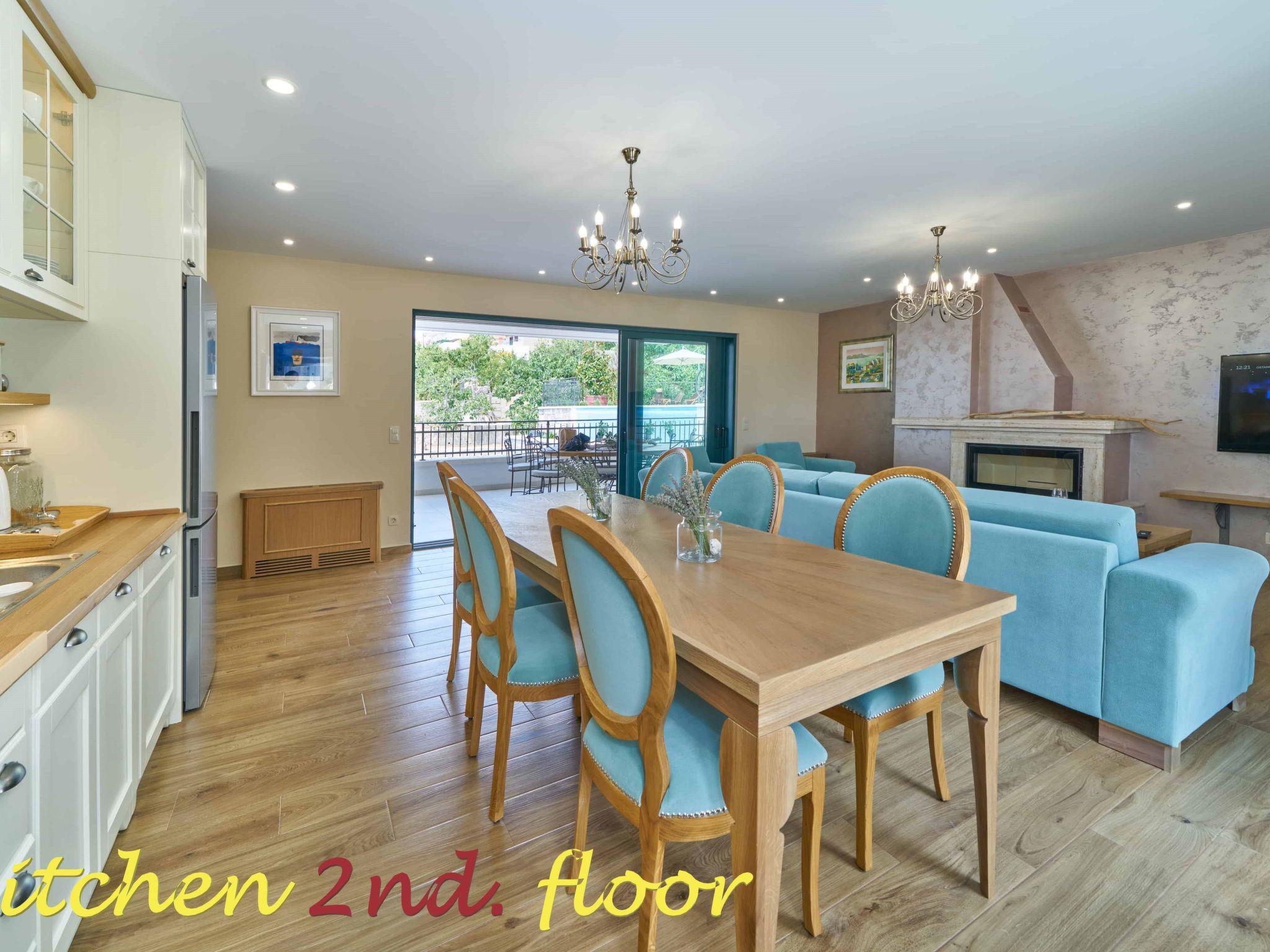 Second Floor 140 m2: 2 double bed bedrooms with ensuite toilets, 1 twin bed bedroom with ensuite toilet, kitchen equipped with dishes for 12 persons, fridge, freezer, owen, wine cooling fridge, coffee maker, toast maker, cattle for boiling water, inside dining area, living room, flat TV with Wi-Fi connection and international programs, large terrace with outside dining and leisure area for 12 persons, air condition, CO detector, fire protection cover, fireplace, floor warming, air condition, free Wi-Fi.