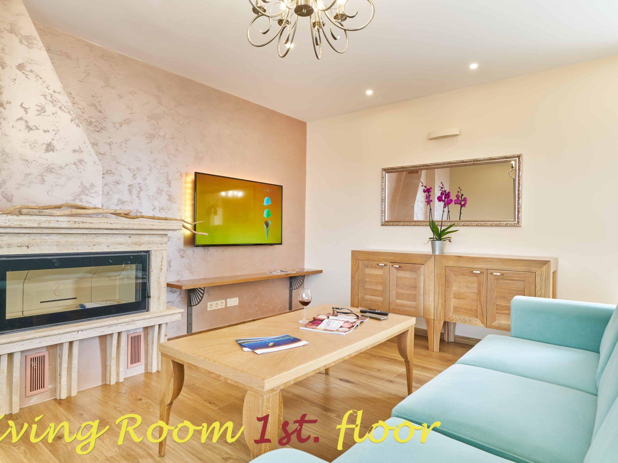 First Floor – 140 m2: 2 double bed bedrooms with ensuite toilets, 1 twin bed bedroom with ensuite toilet, kitchen equipped with dishes for 12 persons, fridge, freezer, owen, wine cooling fridge, coffee maker, toast maker, cattle for boiling water, inside dining area, living room, flat TV with Wi-Fi connection and international programs, large terrace with outside dining and leisure area for 12 persons, air condition, CO detector, fire protection cover fireplace, floor warming, air condition, free Wi-Fi.