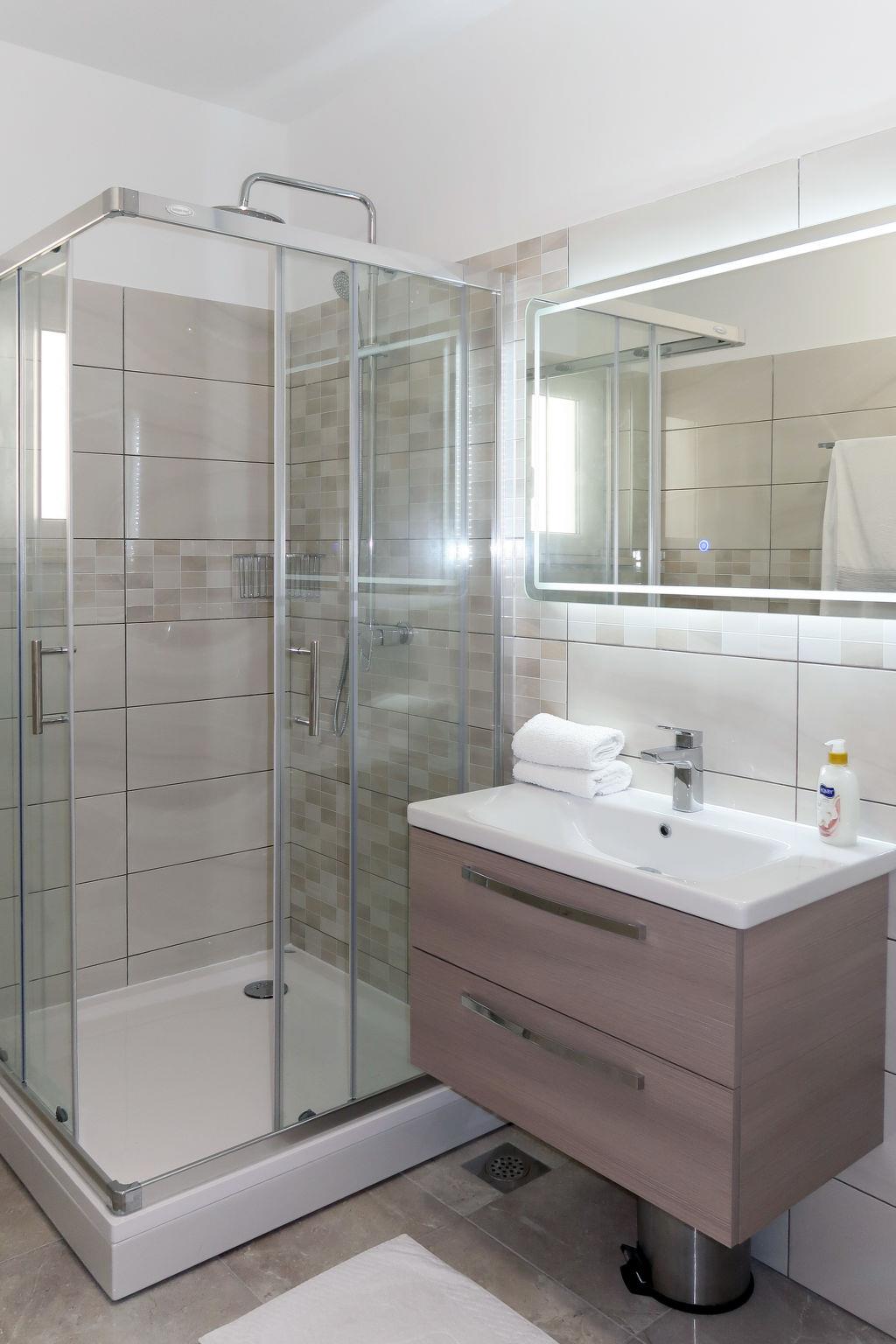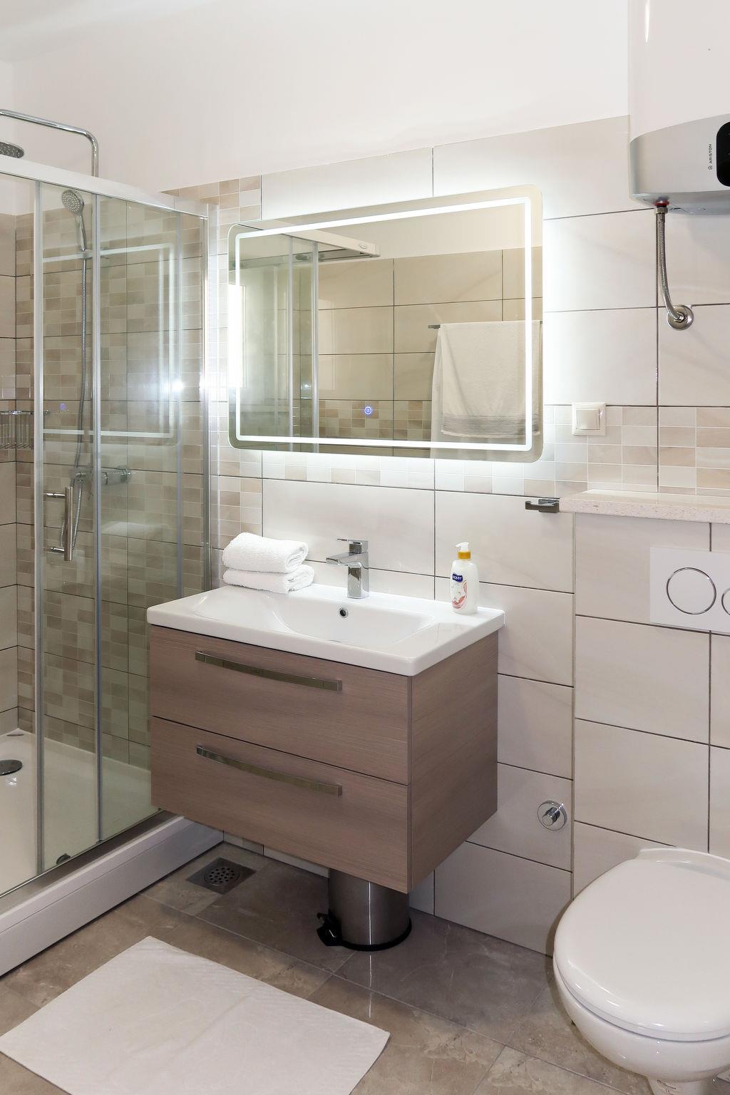 "Lada", 3-room apartment 75 m2 on 2nd floor. Living/dining room with 1 double sofabed (150 cm), TV (flat screen), air conditioning. Exit to the balcony. 1 room with 1 double bed. 1 room with 1 double bed (160 cm). Open kitchen (oven, dishwasher, 4 ceramic glass hob hotplates, toaster, kettle, freezer, electric coffee machine). Shower/WC, sep. WC. No heating option. Balcony. Balcony furniture. Marvellous view of the sea. Facilities: Internet (WiFi, free). Please note: private entrance.
