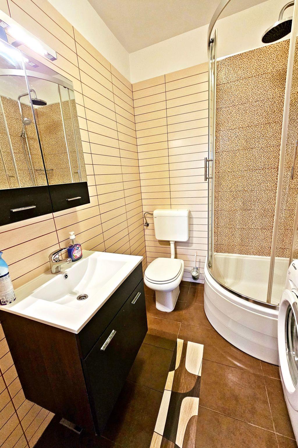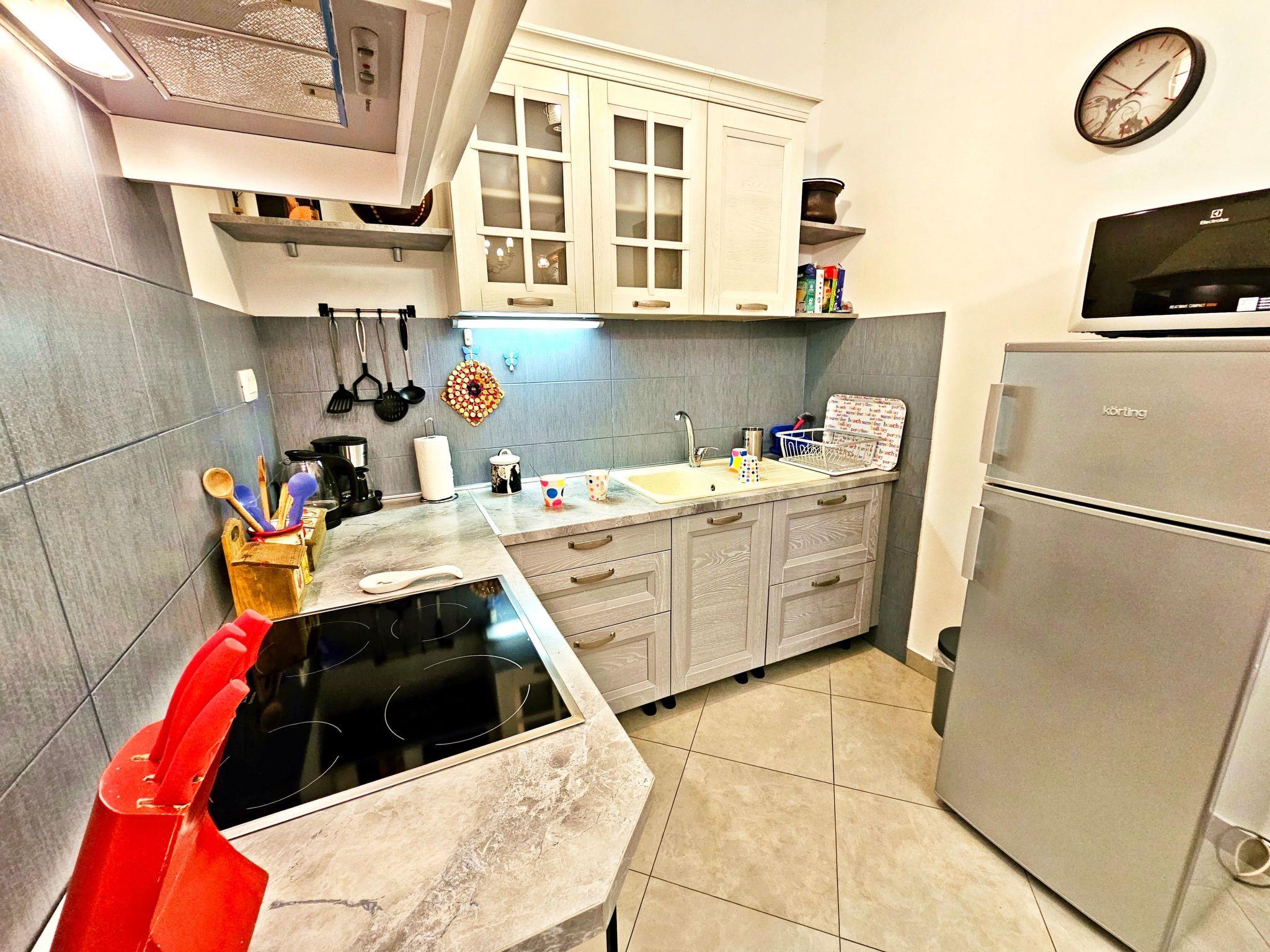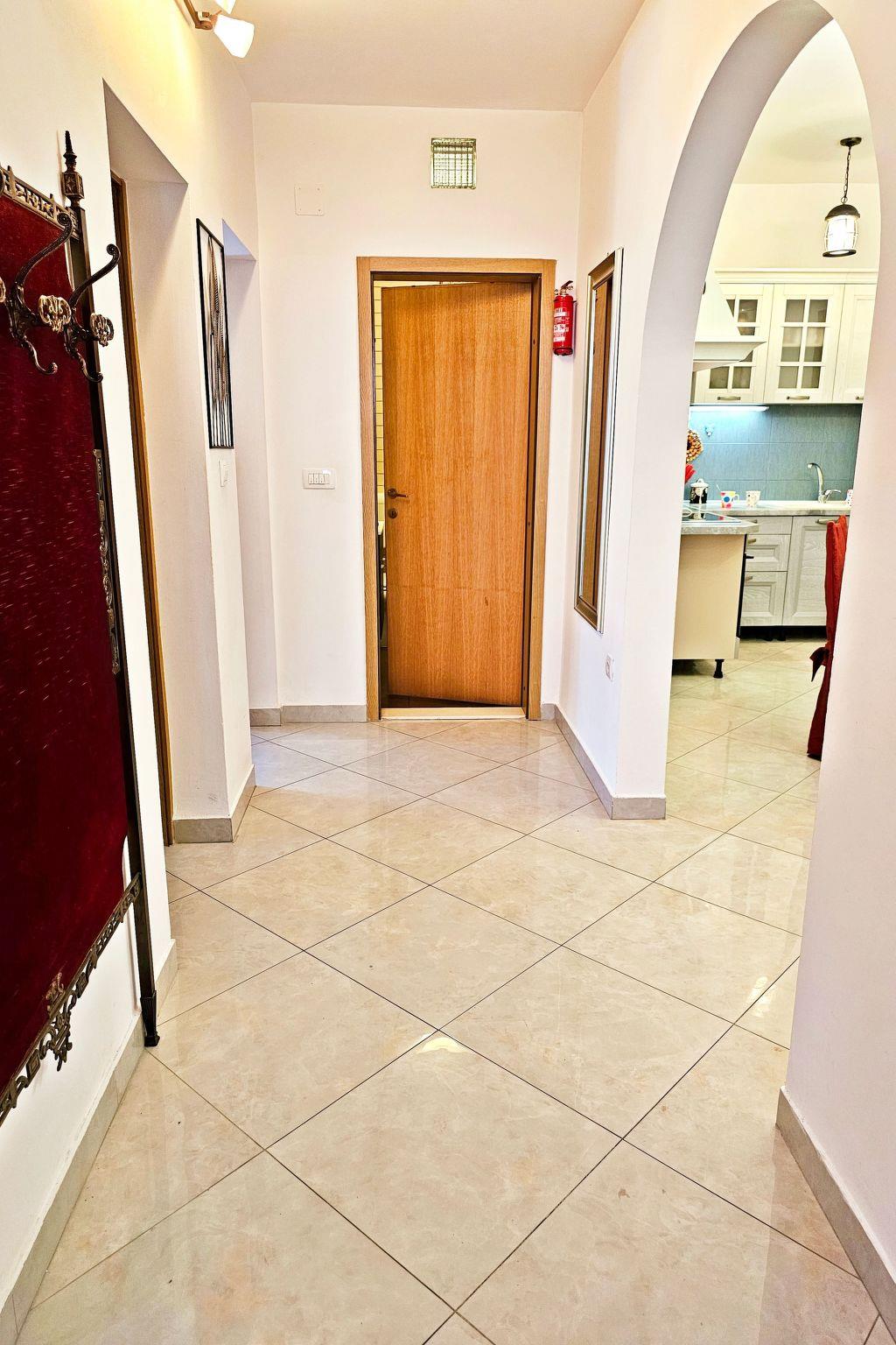 The apartment has one double bedroom and one bedroom with two single beds and one single sofa bed. The apartment has a terrace of 25 m2 with a large dining table and lounge chairs. The kitchen is equipped with all necessary appliances, spacious living area where is the sofa, which can be dissolve into an additional bed. The apartment has a bathroom with a toilet and a separate toilet.