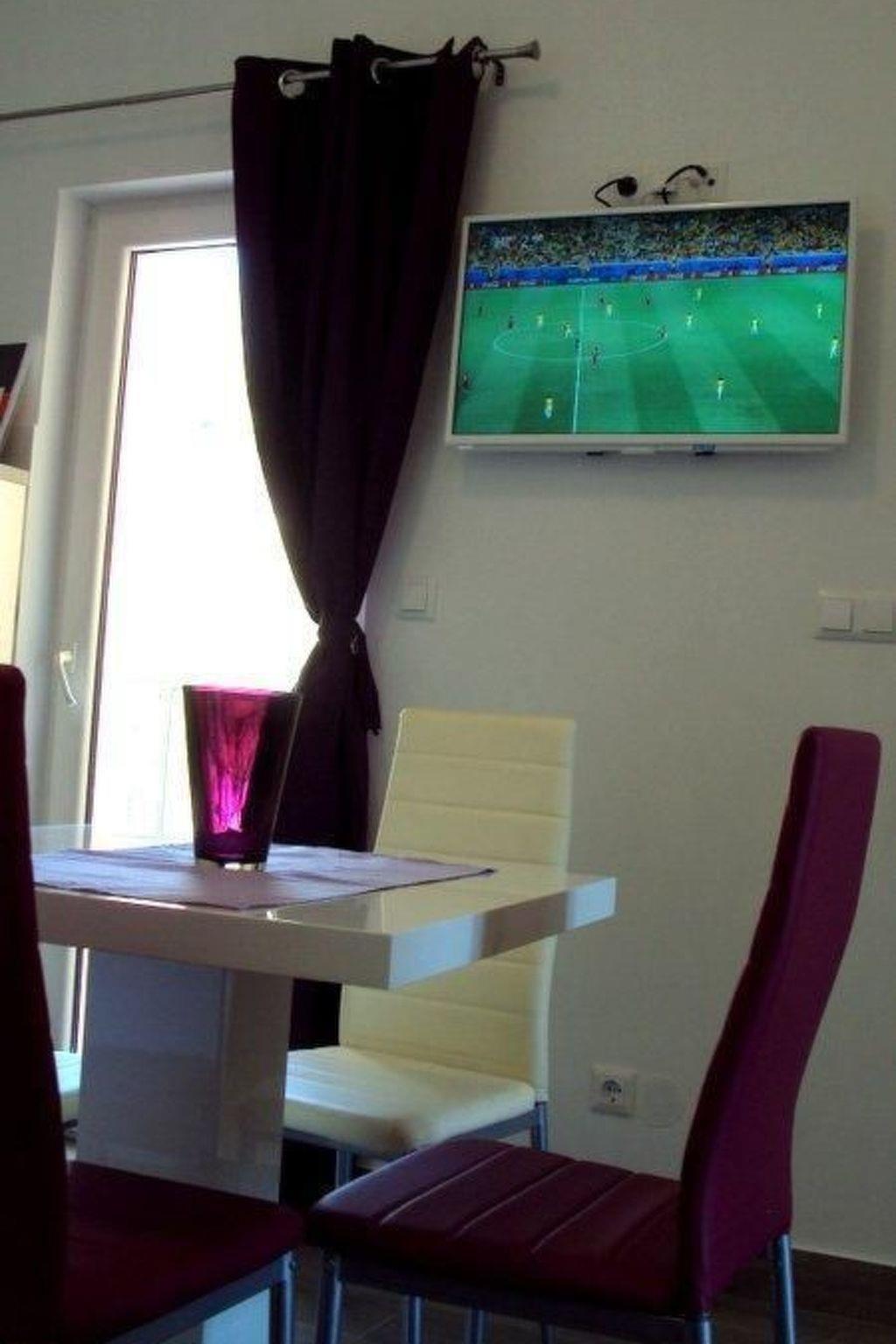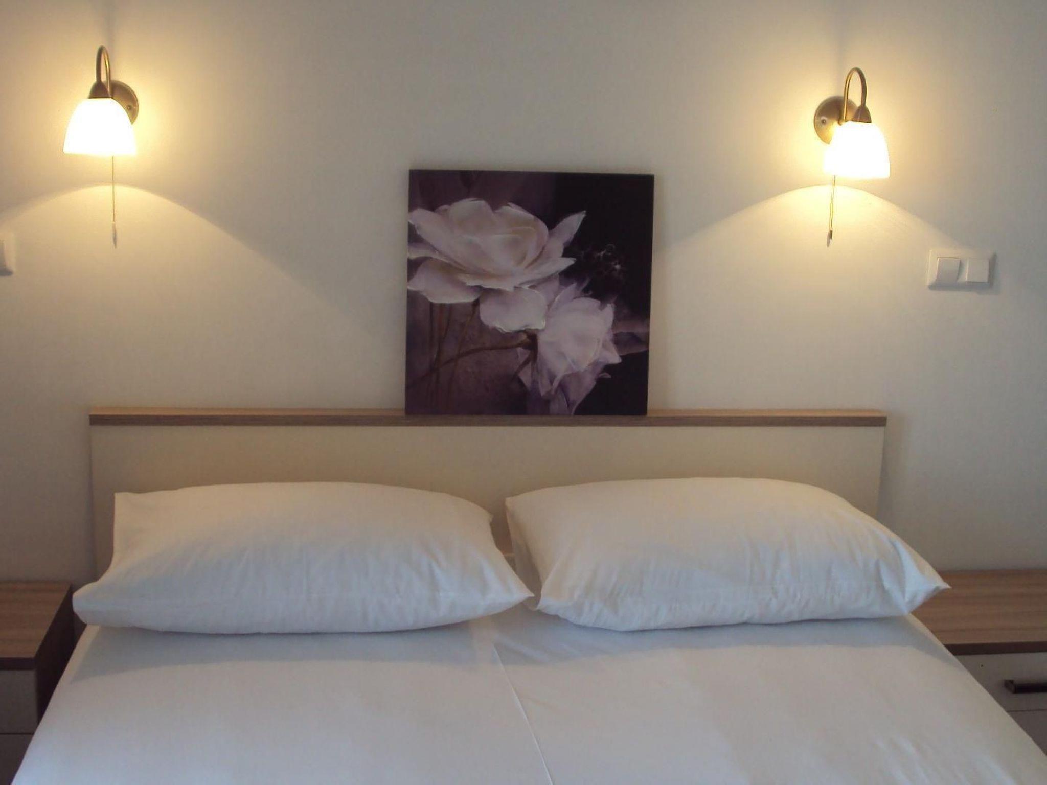 The apartment consists of an air-conditioned living room with an open kitchen, a bathroom and a bedroom. The latter has a double bed (160 x 200cm). The new kitchen has a two-ring hob, fridge, freezer compartment, microwave, coffee machine, kettle and everything you need. The living room provides a pull-out sofa bed (150 x 200cm, for two people) and a flatscreen TV. The bathroom has modern tiling and comprises a shower and WC. Internet access is available throughout the apartment.