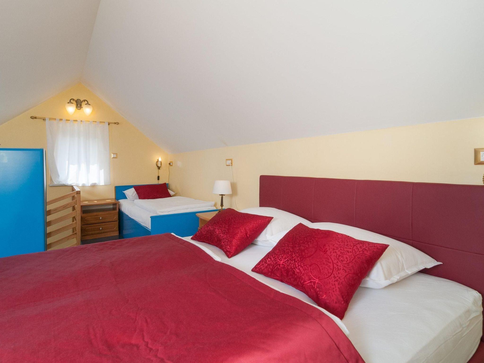 This 30m² apartment is in the middle of the interior courtyard on site and is surrounded by olive trees and grape vines. It is suitable for three people. The ground floor has a living room with a sofa, a table and a TV with Astra satellite channels, as well as air conditioning. In the rear part of the room there is the kitchenette with a two-ring hob, fridge, kettle and necessary utensils. There is also the bathroom with a shower cubicle, hairdryer and WC. Stairs lead to the upper floor with a bedroom for three people, furnished with a double bed (160 x 200cm) and a single bed (80 x 190cm).