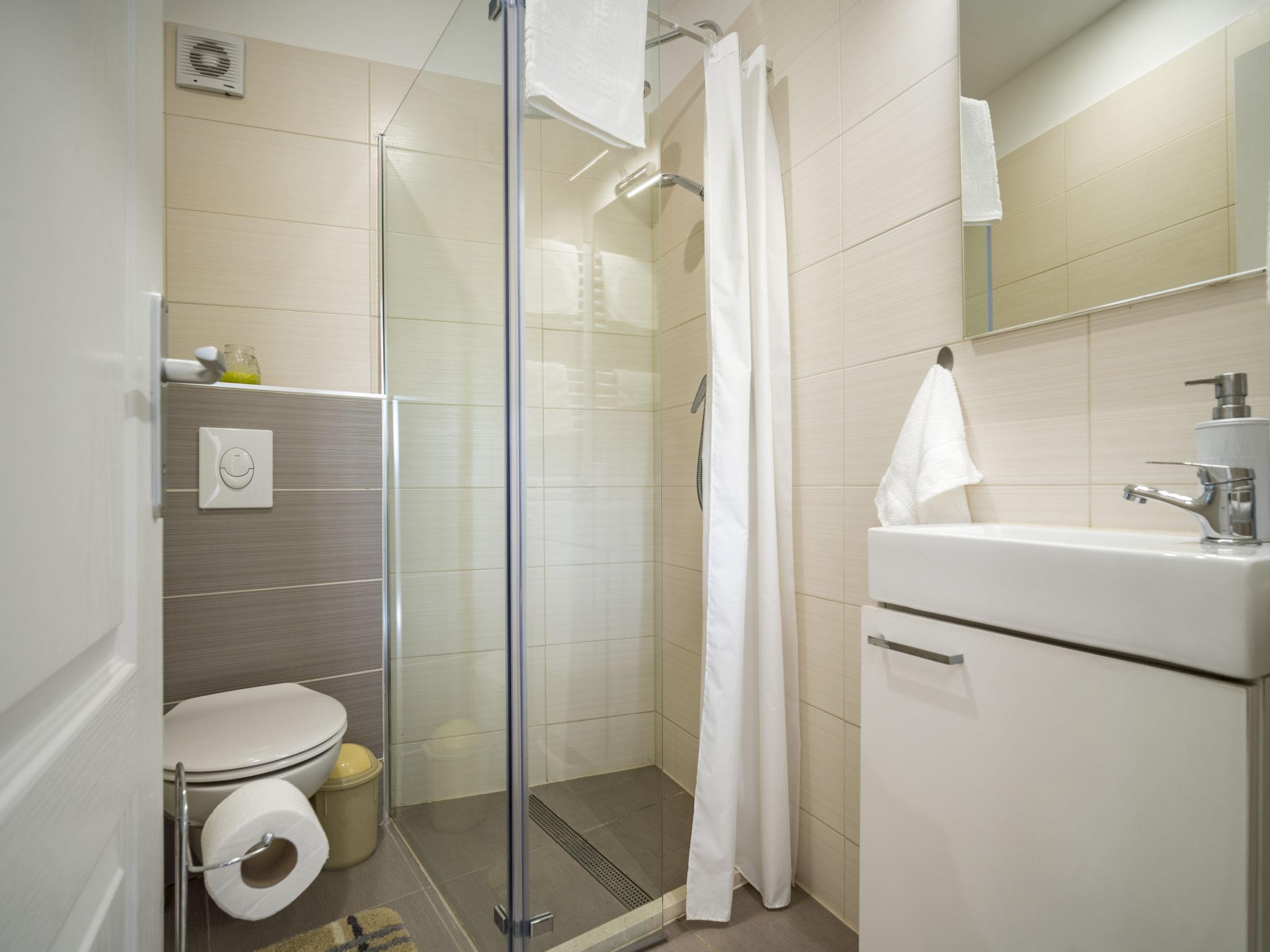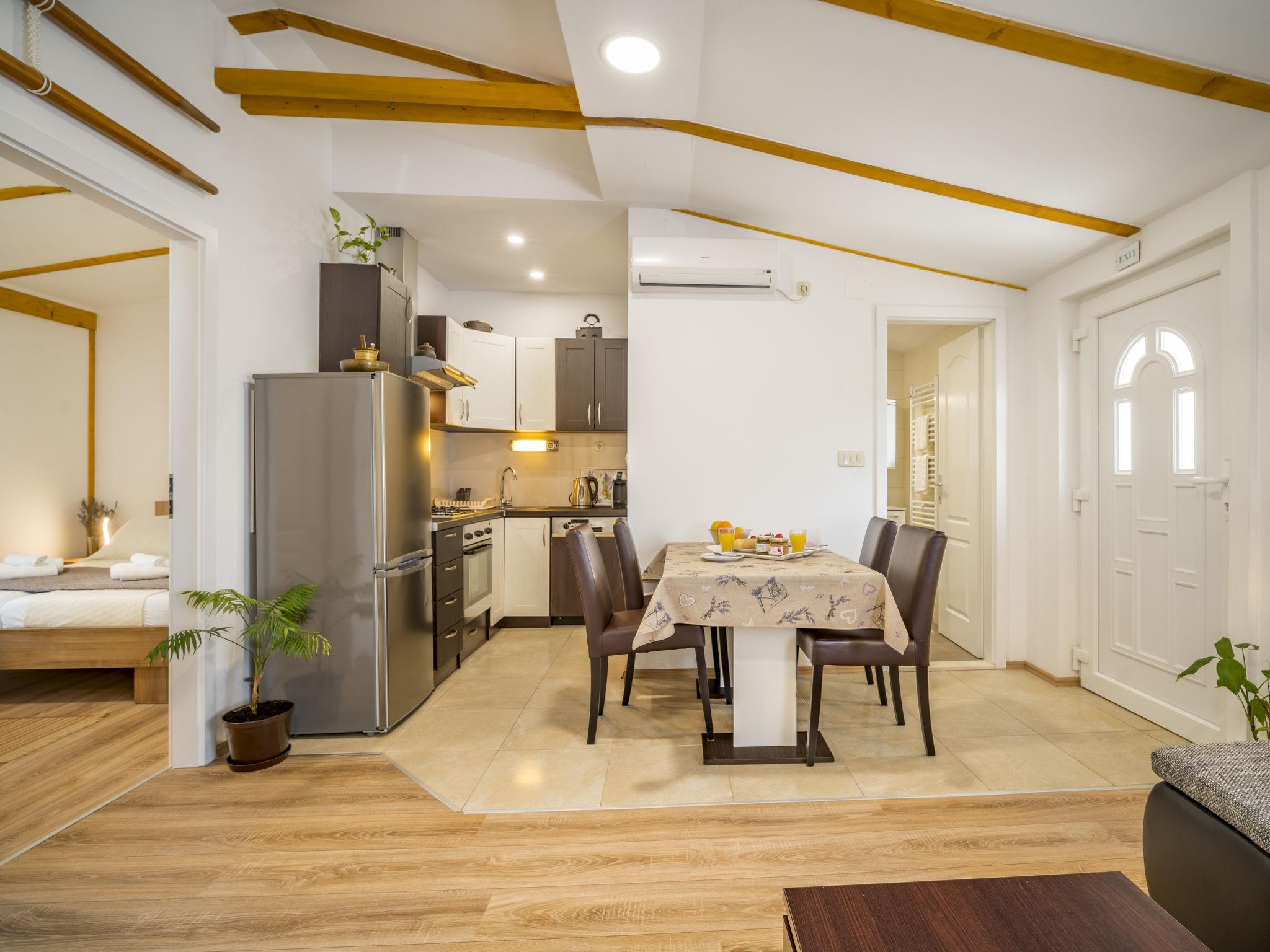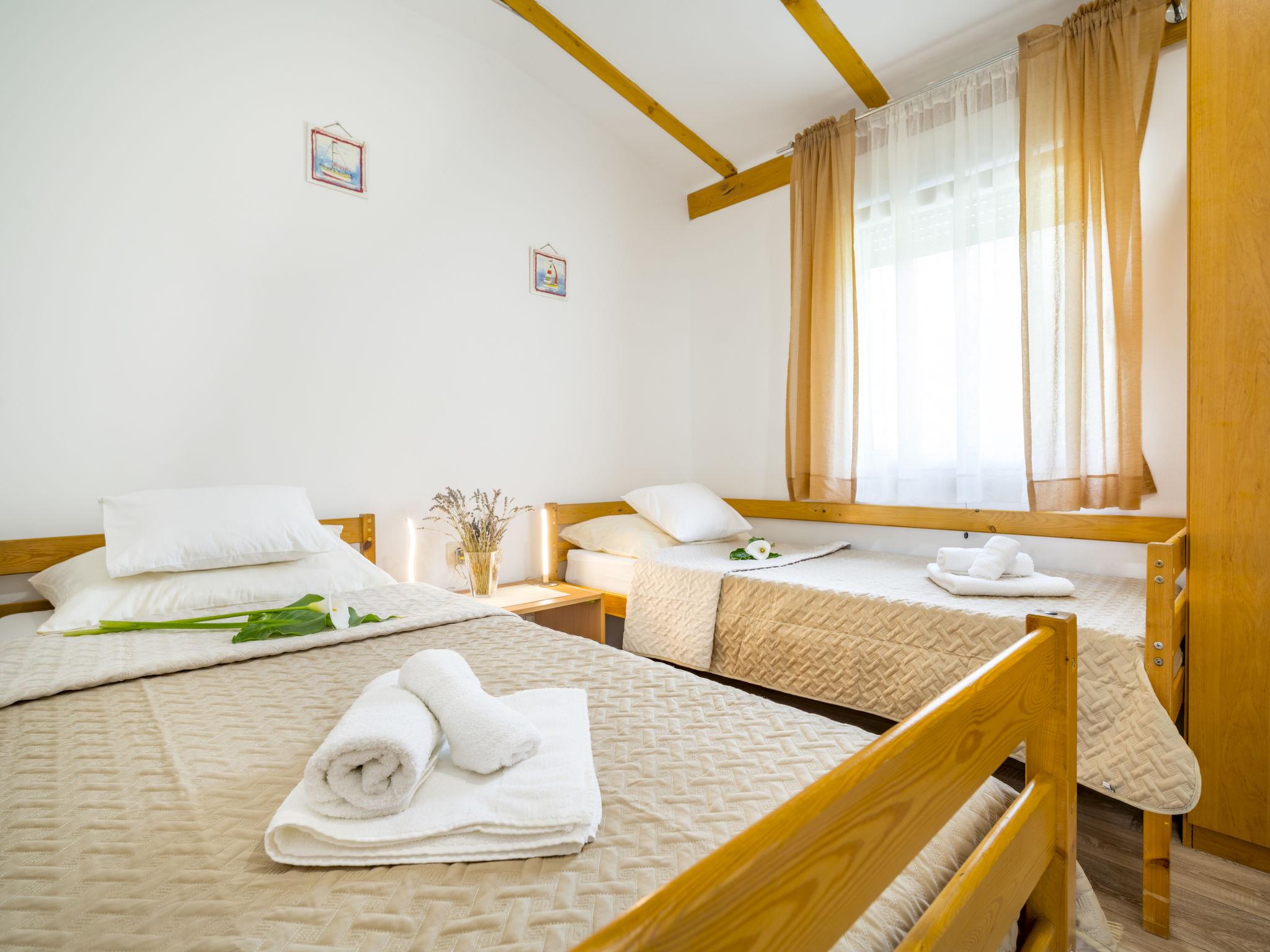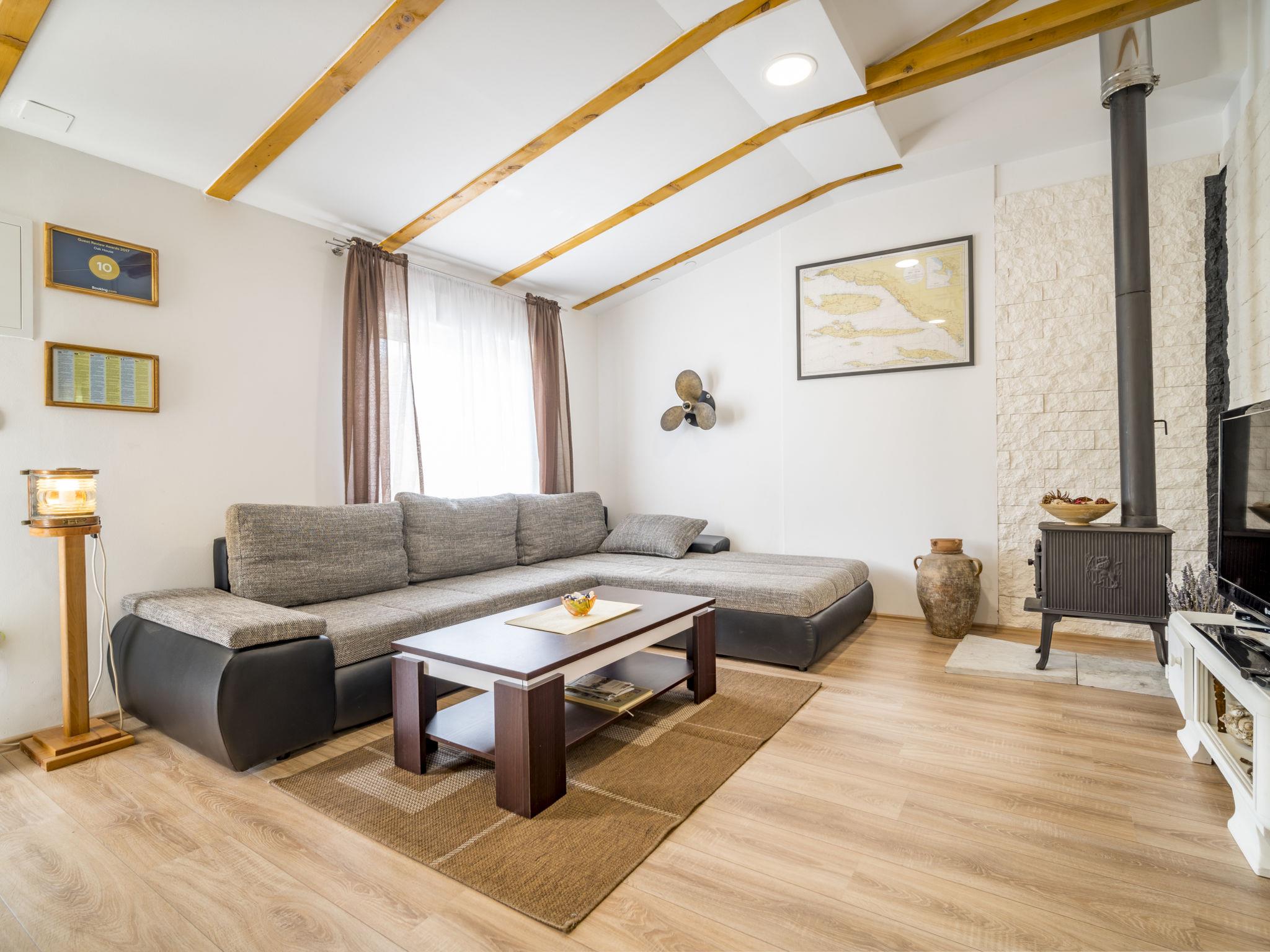 4-room house 85 m2, south facing position. Living/dining room with 1 double sofabed (160 cm, length 200 cm), satellite TV (flat screen), air conditioning. Exit to the terrace. 1 room with 2 beds (90 cm, length 200 cm). 1 room with 1 double bed (2 x 80 cm, length 200 cm). 1 room with 1 double bed (2 x 80 cm, length 200 cm), shower/WC and TV. Open kitchen (4 hot plates, oven, dishwasher, freezer, electric coffee machine). Shower/WC. Forced-air heating. Terrace 25 m2, roofed. Terrace furniture, deck chairs. Marvellous view of the countryside. Facilities: baby cot, hair dryer. Internet (WiFi, free). Maximum 1 pet/ dog allowed. Bedroom with 1 double bed (2 x 80 cm, length 200 cm), TV, shower/WC with a separate entrance. Klasa: UP/I-335-02/17-01/15 Ur broj: 2181-01/05-17