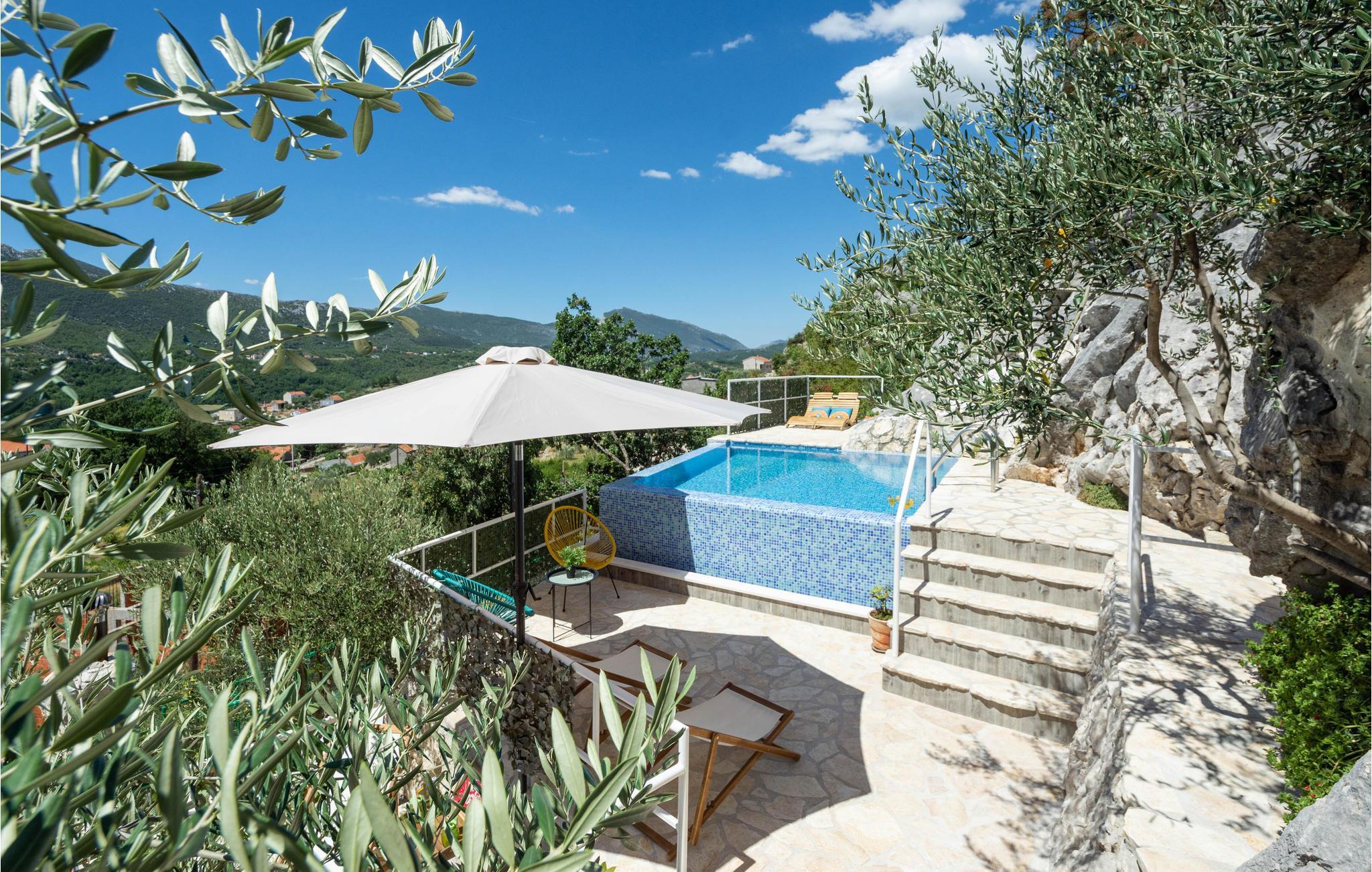 Bo lige i hjørnet mellem Makarskas riviera, og Omis samt Biokovobjergene i dette skønt indrettede feriehus med badebassin. I bor heller ikke langt fra den interessante by Split, der bugner af historie og kultur. Den lille by Kostanje, med smuk natur og mediterrant klima, ligger langt fra trafikstøj, men alligevel med gode forbindelser til de mest attraktive strande. Centrum i Kostanje er floden Cetina, der får sit vand fra en uudtømmelig kilde og indbyder til turbulente raftingeventyr. Husets etager er forbundet af udendørs trapper. Nyd naturens dufte, det rolige hav, kraften og energien på floden når I rafter, slap af med cykel- og gåture, lær naturens lægeplanter og urter at kende og sving jer til Dalmatiens lokkende toner.
