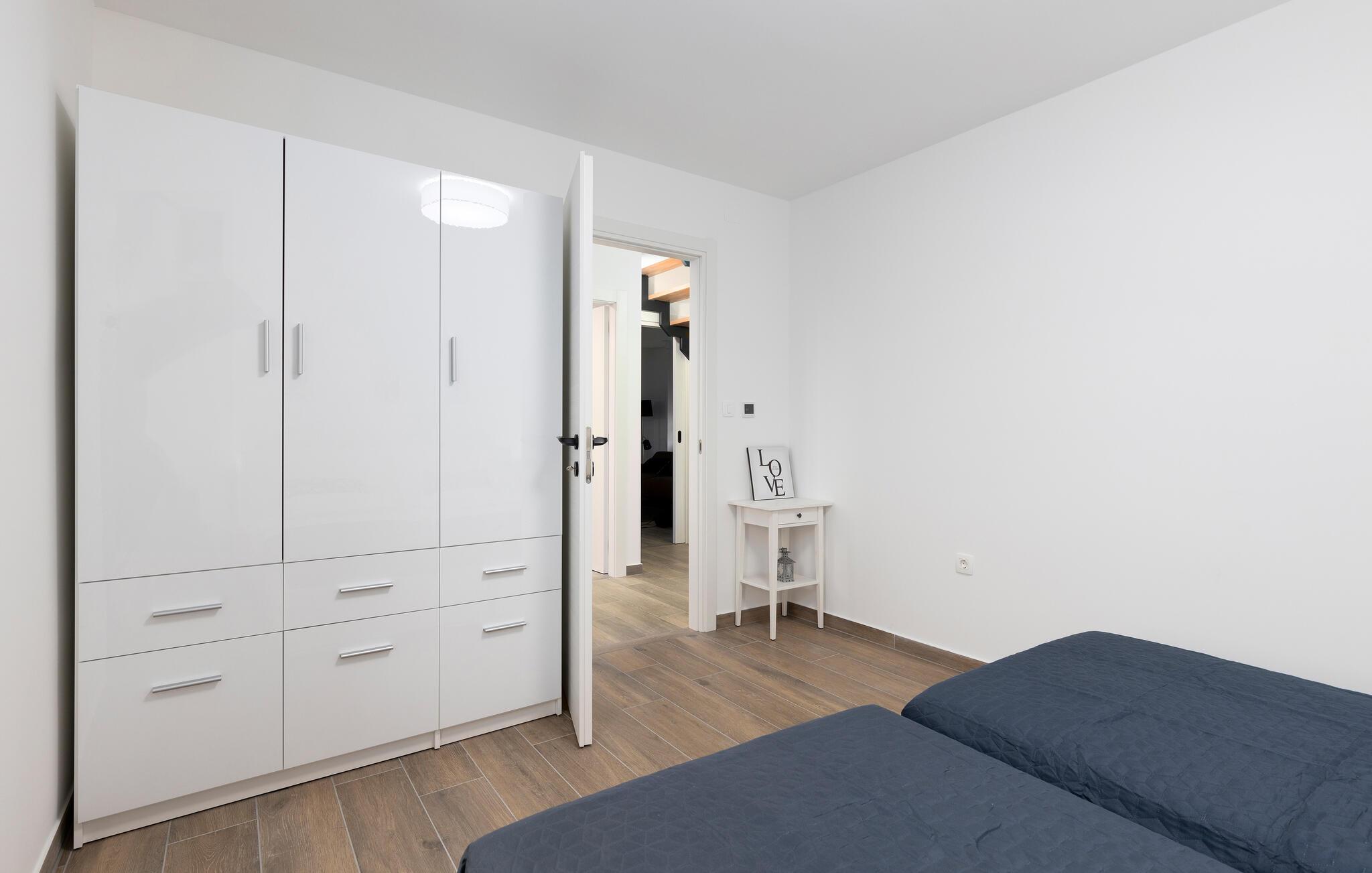 Lejligheden er fordelt over to etager og byder på en moderne indretning med mange gode faciliteter, der sikrer jer fuld komfort og en allelunde dejlig boligoplevelse på ferien. Boligen bliver jeres andet hjem, og efter dagens udflugter kan I give jer god tid med madlavningen i det åbne køkkenalrum og nyde måltiderne i aftensolen på terrassen. Soveværelserne er rummelige og yderst behagelige, så glæd jer til at sove igennem i de rolige omgivelser.