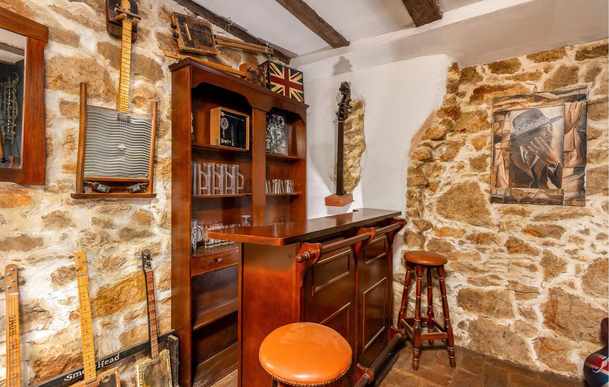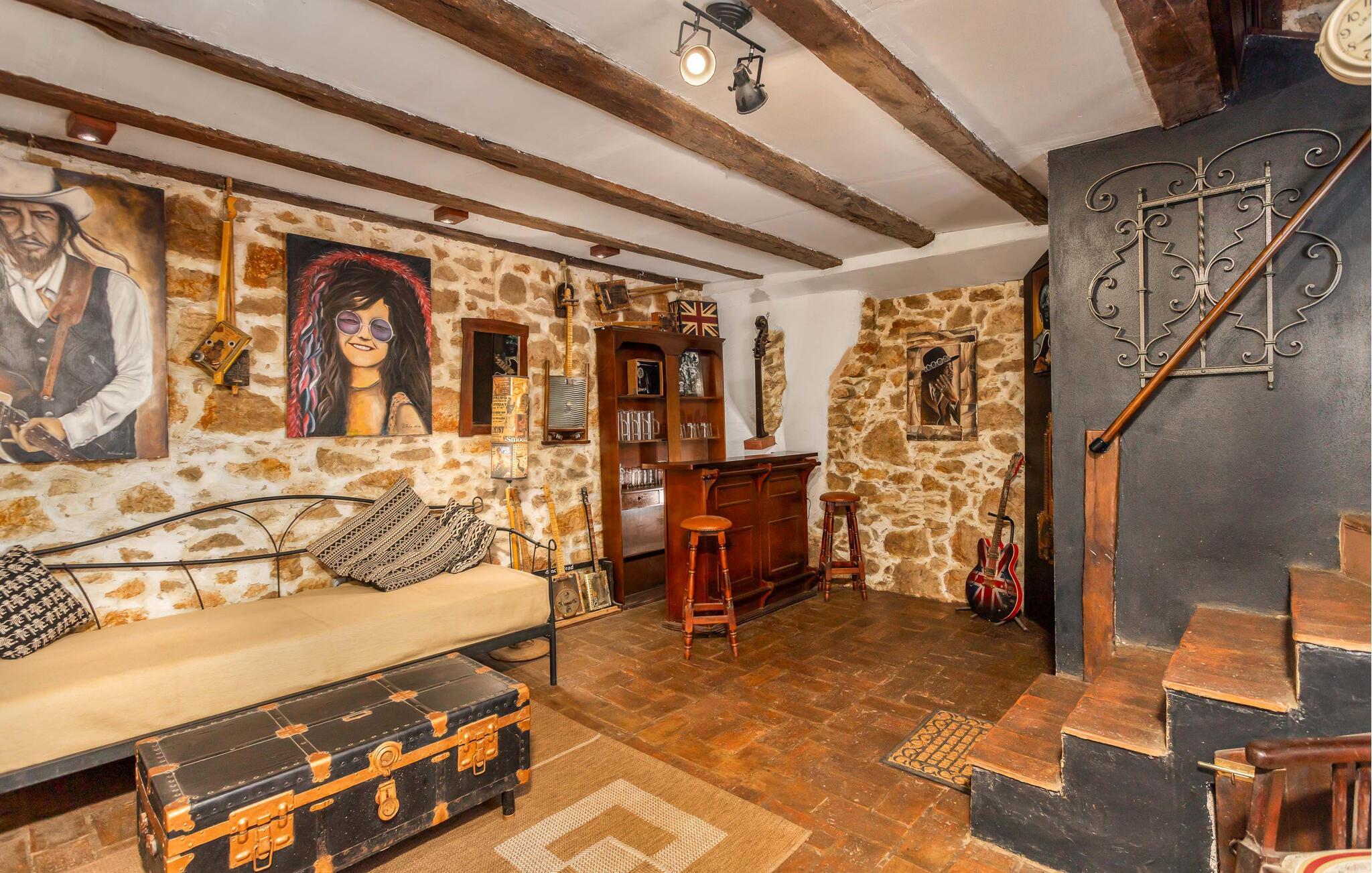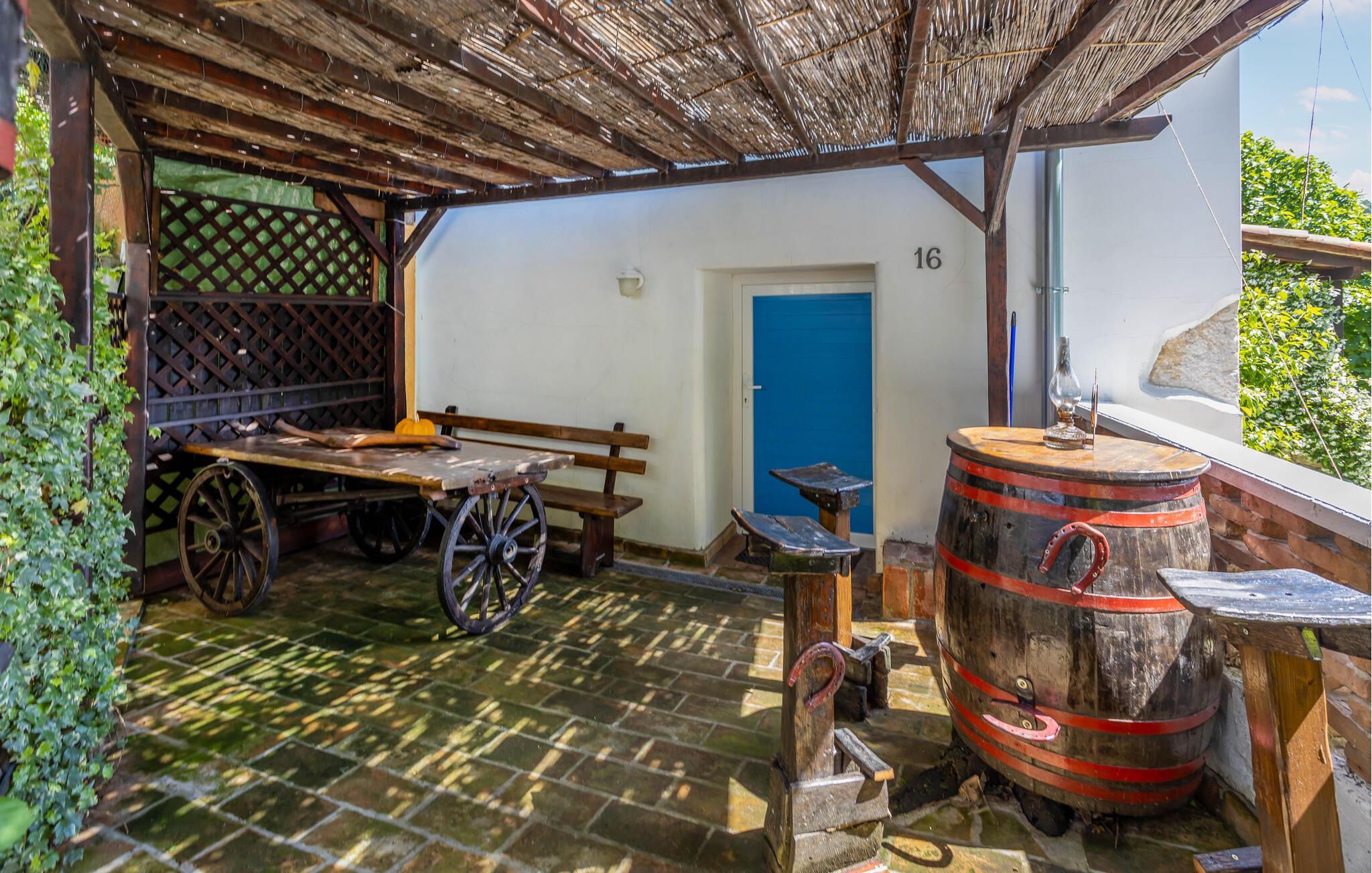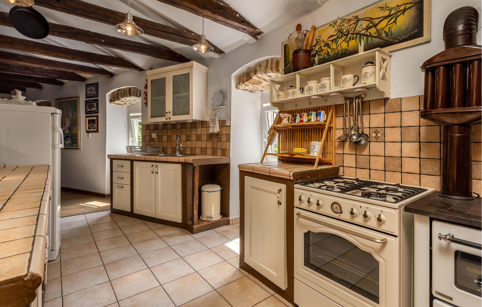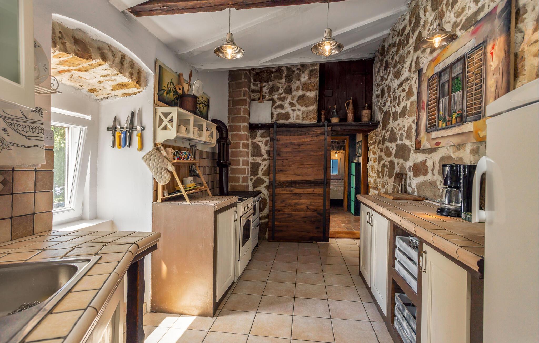 Nyd en pause fra jeres hektiske hverdag, og hold en dejlig ferie i dette rustikke og samtidig hyggelige feriehus. Den kærligt indrettede bolig tilbyder en indbydende atmosfære med hyggelige indendørsrum, stenvægge og synligt bindingsværk, samt en fantastisk udsigt til det grønne. Føl jer hjemme her, lav lækre måltider i køkkenet, eller nyd ferietiden sammen i stuen.