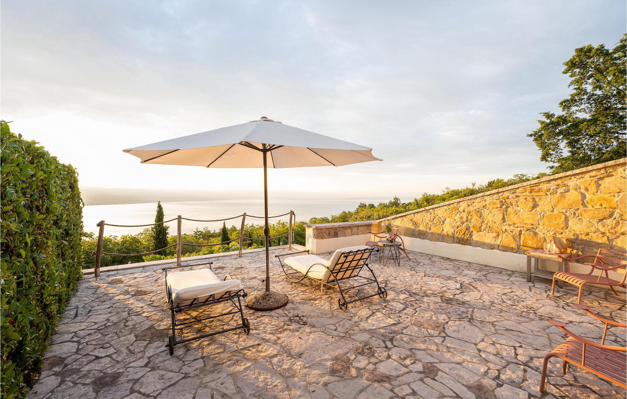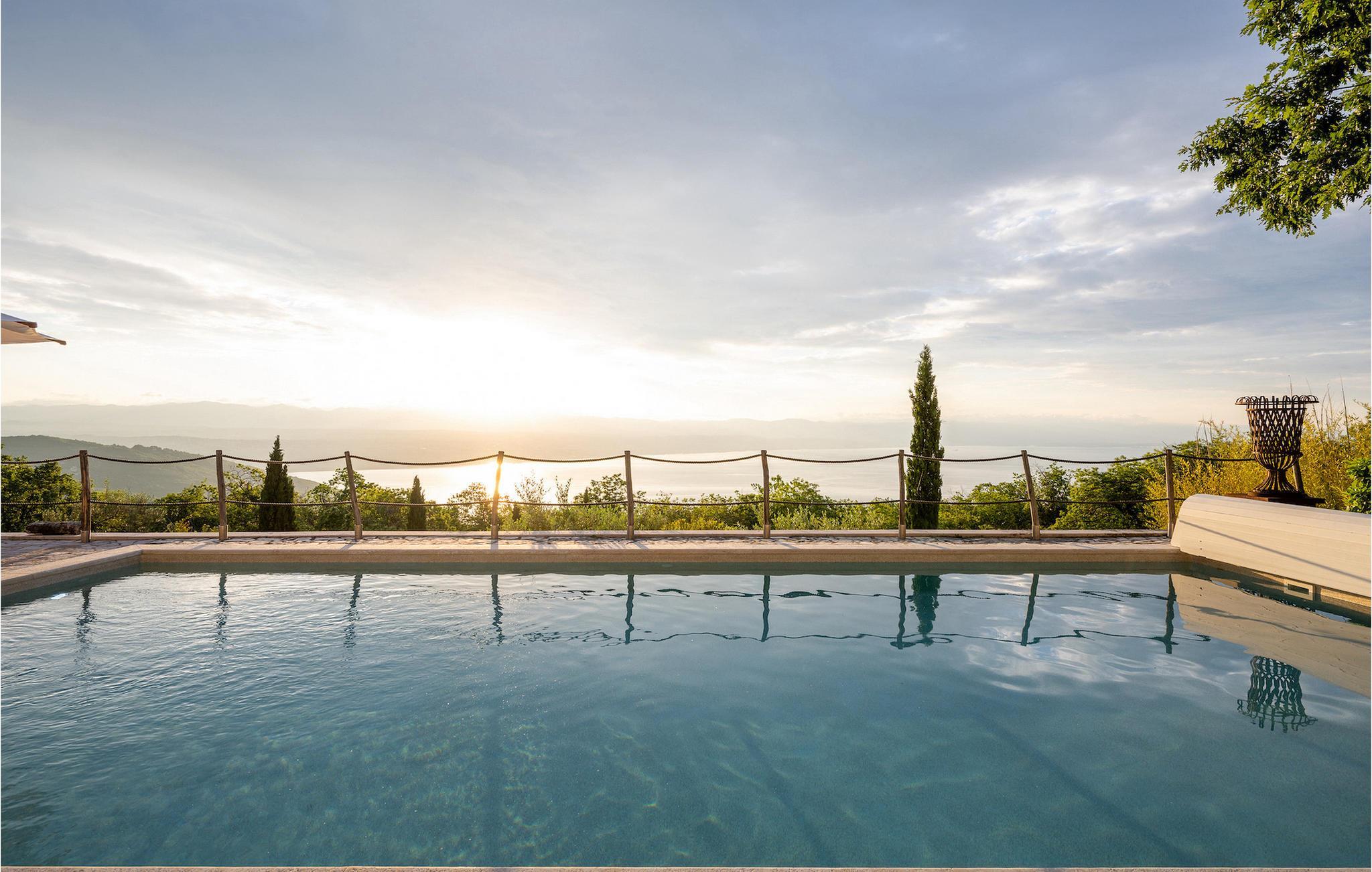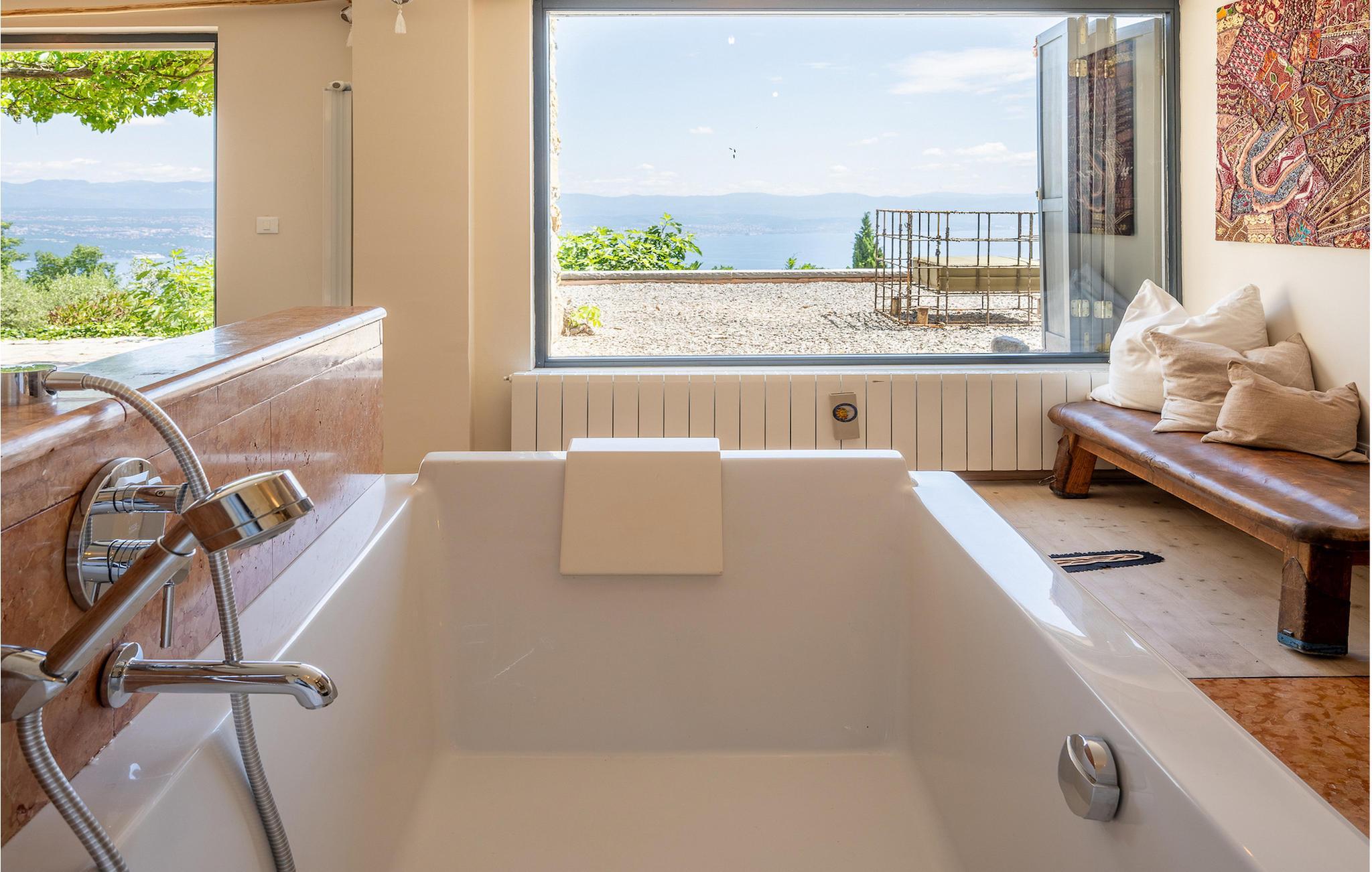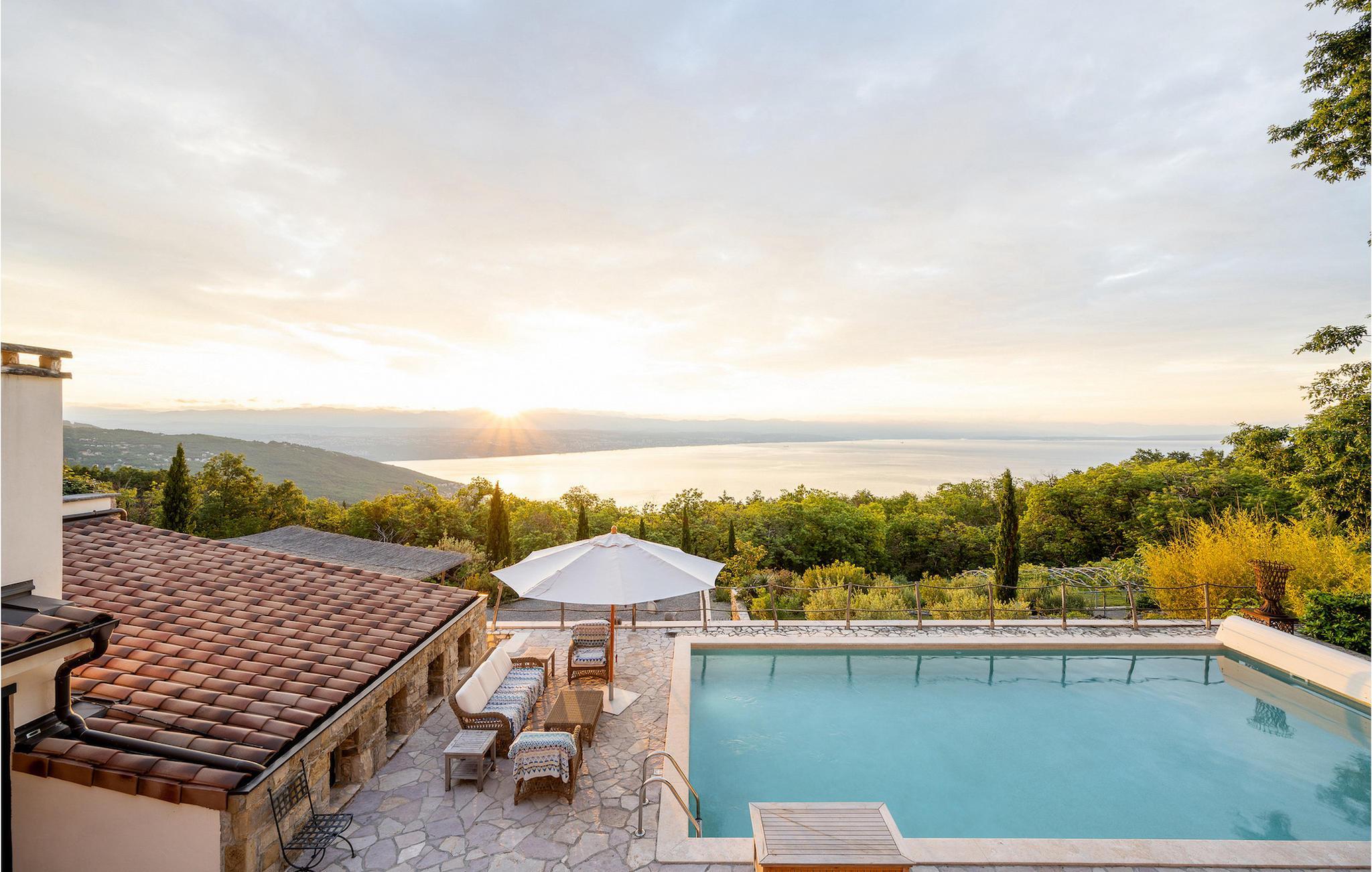 Villa Evelina Eselboeck byder dig velkommen med en idyllisk terrasse, omgivet af natur. Du kan nyde solen fra en af 8 liggestole eller svømme i den forfriskende pool. Ved siden af poolen er loungeområdet perfekt til at nyde kolde drinks, mens du beundrer havudsigten i dit eget lille stykke paradis. Et andet loungeområde tilbyder dig noget tiltrængt skygge efter en lang dag i solen og er perfekt til sjove komsammener sent om aftenen. Endelig er det tredje loungeområde forhøjet og byder på udsigt over både poolen og havet. Ved siden af villaen kan du bruge grillen til at lave et lækkert måltid, og derefter nyde det ved spisebordet til op til 10 personer. Dine børn vil nyde at løbe rundt i den smukke have eller skiftes på gyngen. I stueetagen finder du et komfortabelt dobbeltværelse med eget badeværelse og terrasse. Stuen med TV og pejs og det fuldt udstyrede køkken er på første sal. Her finder du også det andet spisebord til op til 12 personer og udgang til haven. Tre mere komfortable dobbeltværelser er forberedt til dig på denne etage. Hver enkelt har sit eget badeværelse, og et af dem har et badekar med udsigt over havet til det mest afslappende boblebad, du nogensinde har haft. Villa Evelina Eselboeck er den fredfyldte del af himlen, du har brug for til en idyllisk, afslappende ferie, der vil få dig til at glemme bekymringerne i dit travle liv. Villa Evelina Eselboeck ligger i landsbyen Lovran, kun 2 km fra stranden. Den nærmeste restaurant, café og butik ligger inden for 1,1 km derfra. For naturelskere kan du besøge naturparken Ucka, et beskyttet område med vandreruter, der fører til kløfter, vandfald og historiske steder. Villaen ligger tæt på "Adriaterhavets Perle", byen Opatija. For en afslappende spadseretur langs kysten kan du ikke gå glip af Lungomare-promenaden. Mens du går, kan du beundre den fantastiske udsigt over byen og de nærliggende øer , er det det perfekte sted at udforske Opatijas naturlige seværdigheder. Villa Angiolina fra 1800-tallet ligger i en have med eksotiske planter og er hjemsted for det kroatiske turismemuseum. Det samler, undersøger og viser genstande og historier, der repræsenterer den rige historie af turisme i Kroatien. Lidt længere kan du tilbringe en dag i Rijeka. Udforsk Trsat-slottet og nyd et måltid i gårdhaven, som er blevet omdannet til en restaurant. For en mere moderne aktivitet, hvorfor ikke gå og se en udstilling på Museum of Modern and Contemporary Art eller Computer Museum. Temperaturen i den opvarmede swimmingpool er afhængig af eksterne faktorer, herunder vejrforhold, og som sådan kan temperaturen på vandet ikke garanteres.