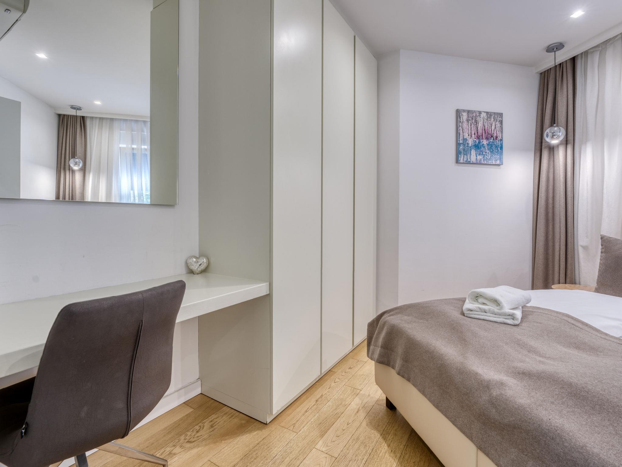 3-room apartment 79 m2, on the ground floor. Modern furnishings: living/dining room with 1 double sofabed (160 cm, length 200 cm), cable TV (flat screen), air conditioning. Exit to the terrace. 1 room with 2 beds (80 cm, length 200 cm), air conditioning. 1 room with 1 french bed (180 cm, length 200 cm), shower/WC and satellite TV (flat screen), air conditioning. Exit to the terrace. Open kitchen (oven, dishwasher, 4 ceramic glass hob hotplates, kettle, microwave). Shower/WC. Floor heating, forced-air heating. Terrace 10 m2. Terrace furniture. Partial view of the town. Facilities: safe, iron, hair dryer. Internet (WiFi, free). Garage (1 car). Please note: non-smoking house.