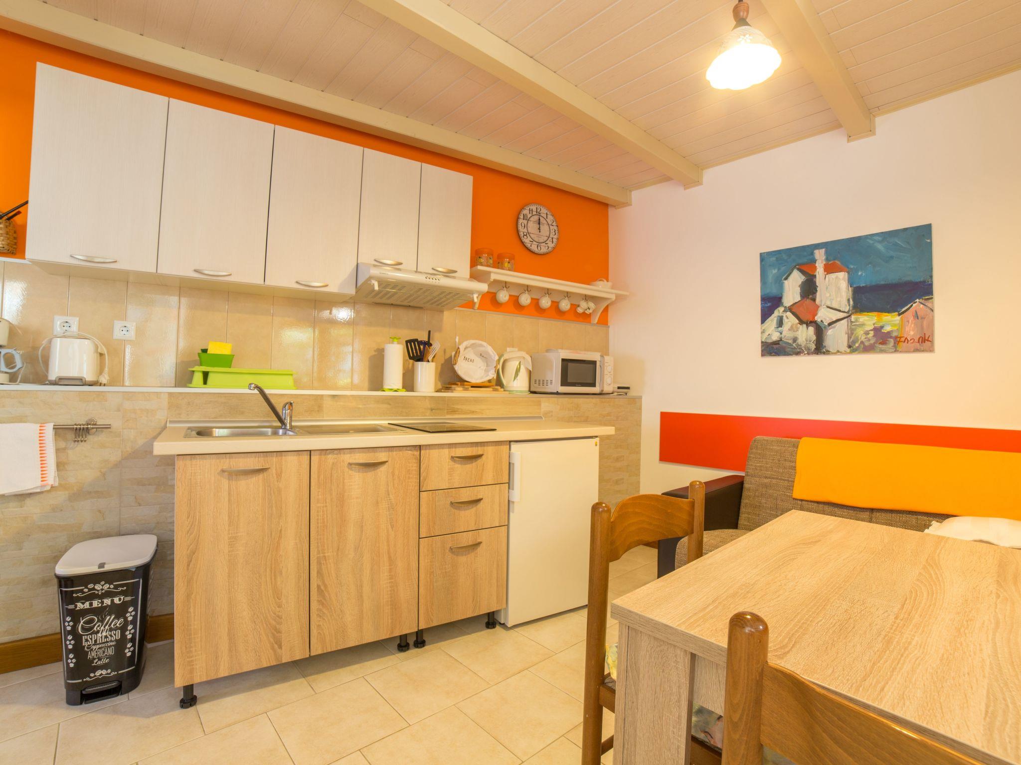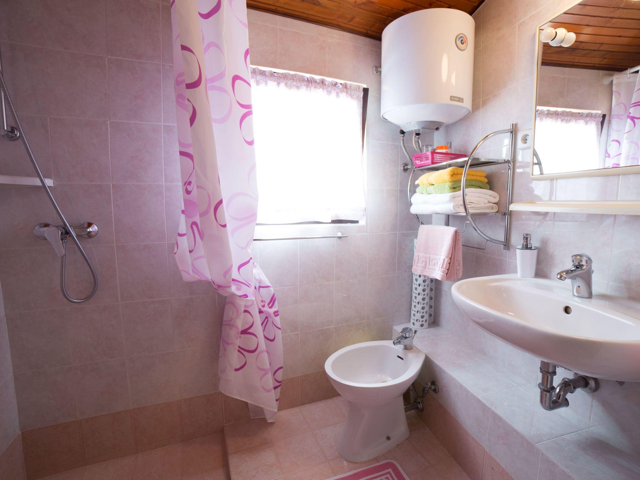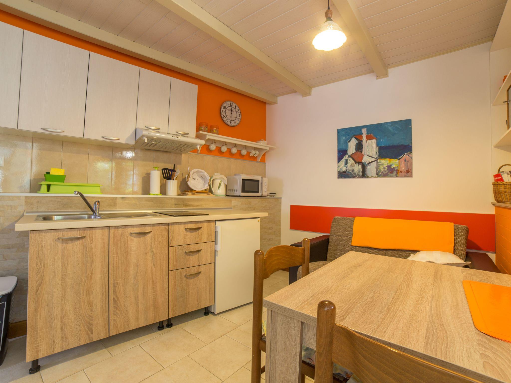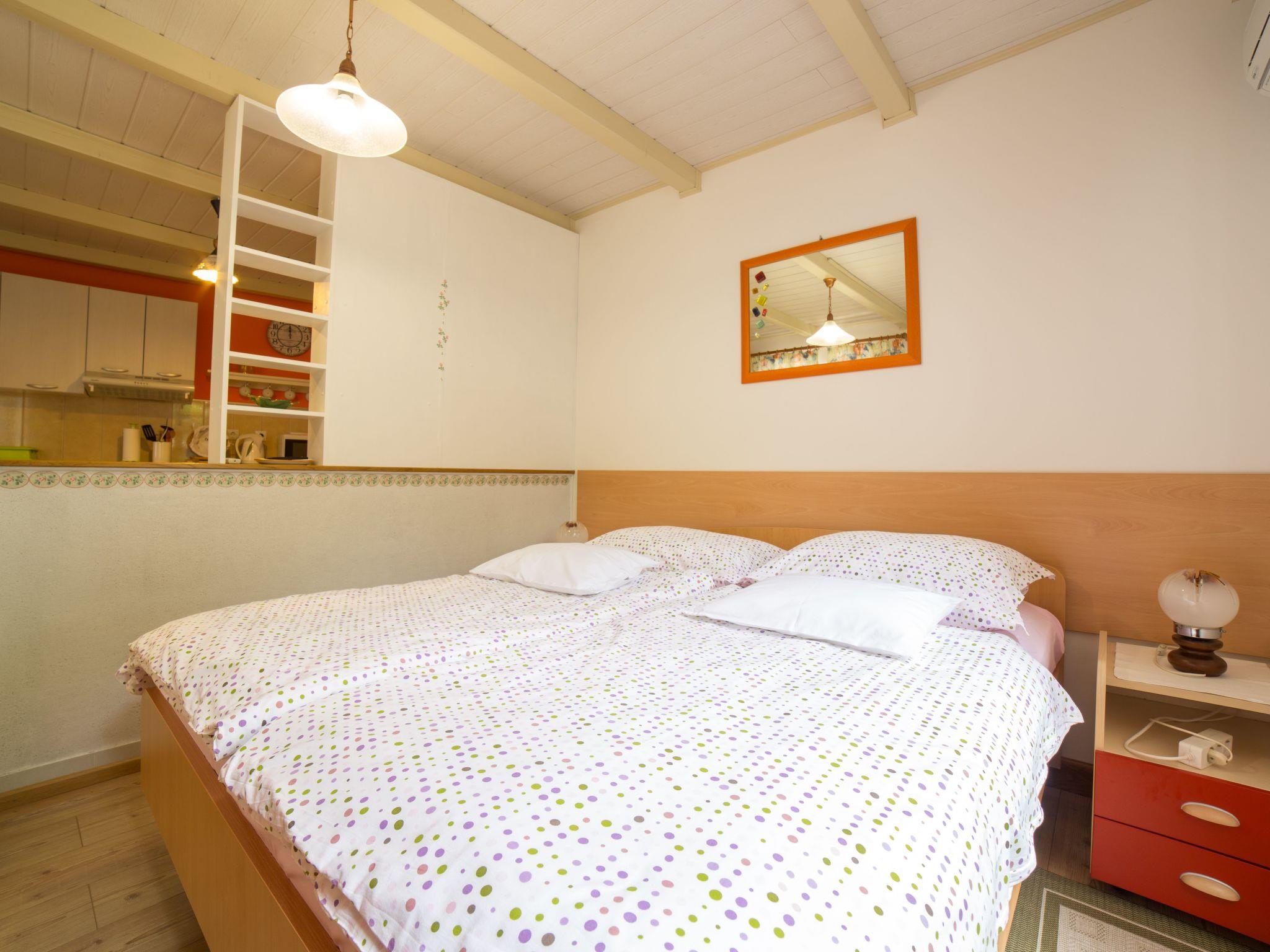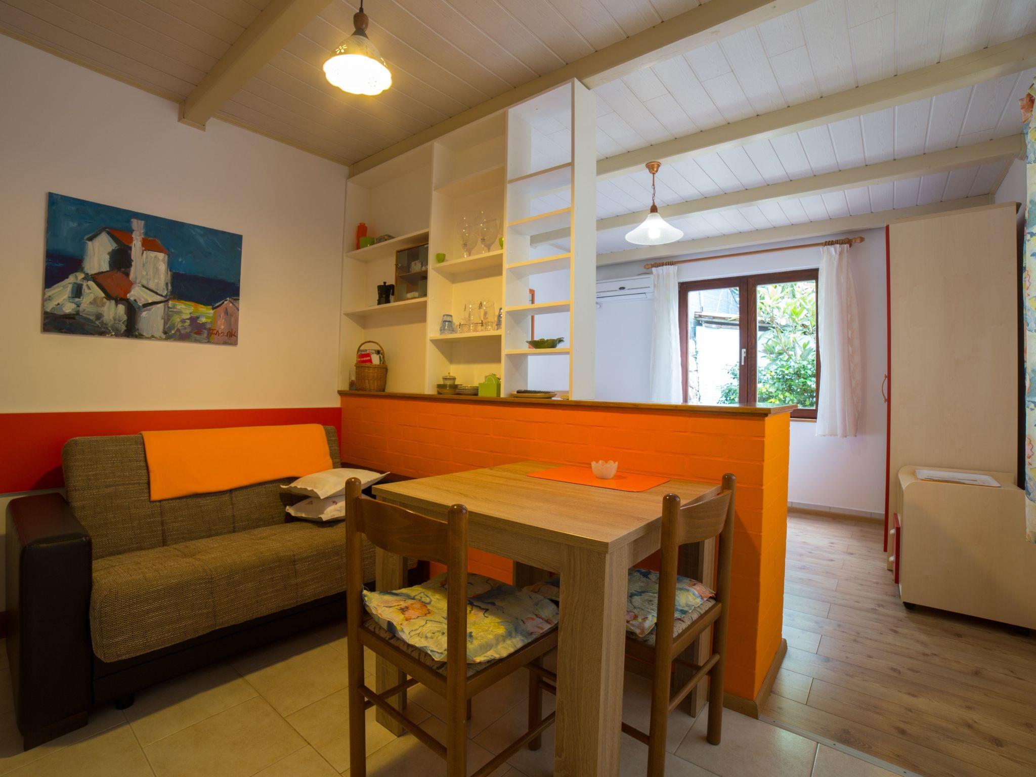 The separate annexe is about 35 square metres and is separated from the main building by a few steps. The small house is open-plan. The living area consists of a kitchenette, separated from the sleeping area by shelving. The sleeping area has a double bed. The living area includes a sofa bed suitable for a child, a dining table and a kitchenette. The kitchenette is equipped with two electric cookers, a coffee machine and a mini-oven. The bathroom is equipped with a shower, sink and bidet. This accommodation also offers air conditioning, central heating, satellite TV and internet access. A washing machine is located in a small outbuilding.