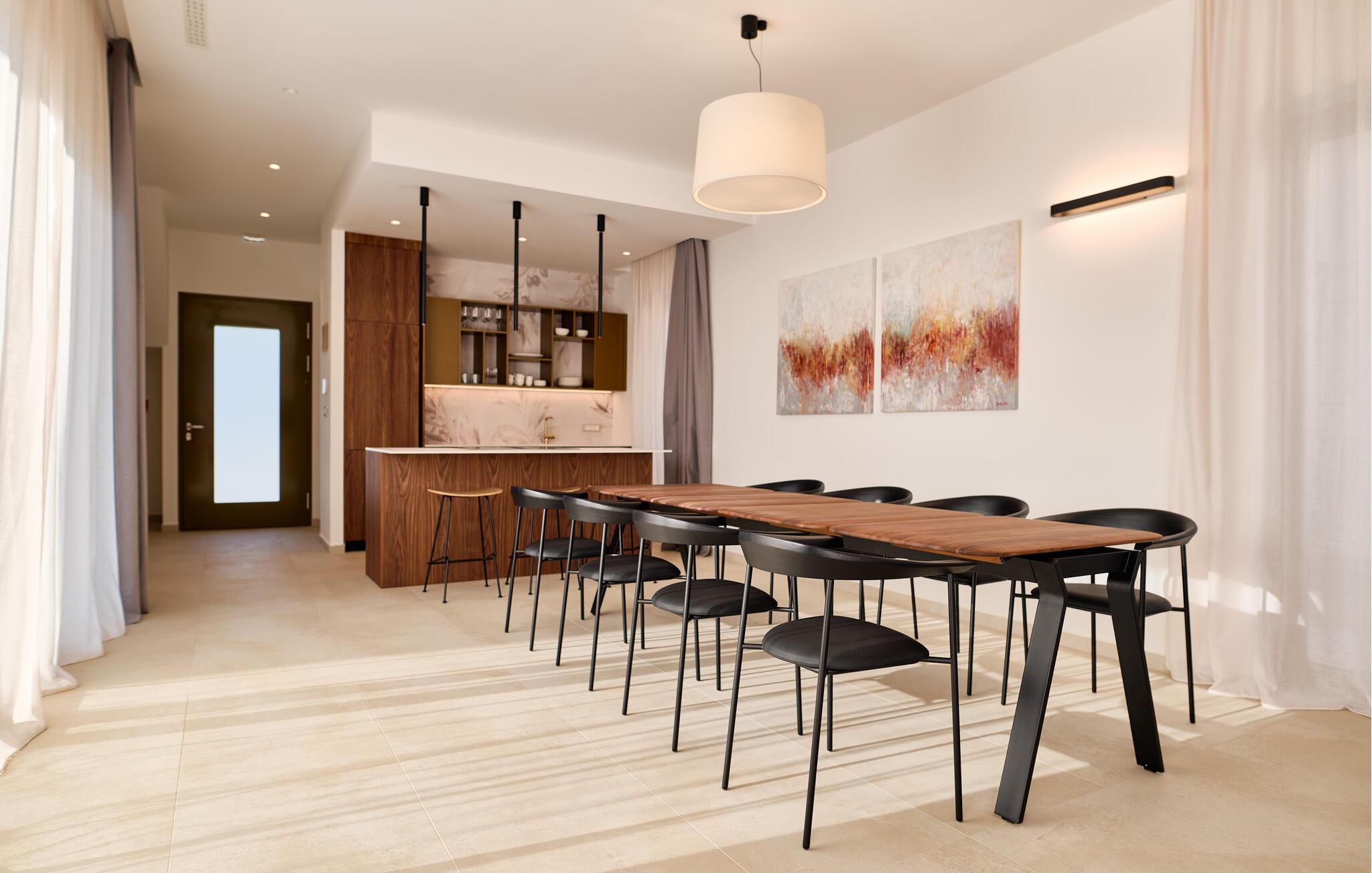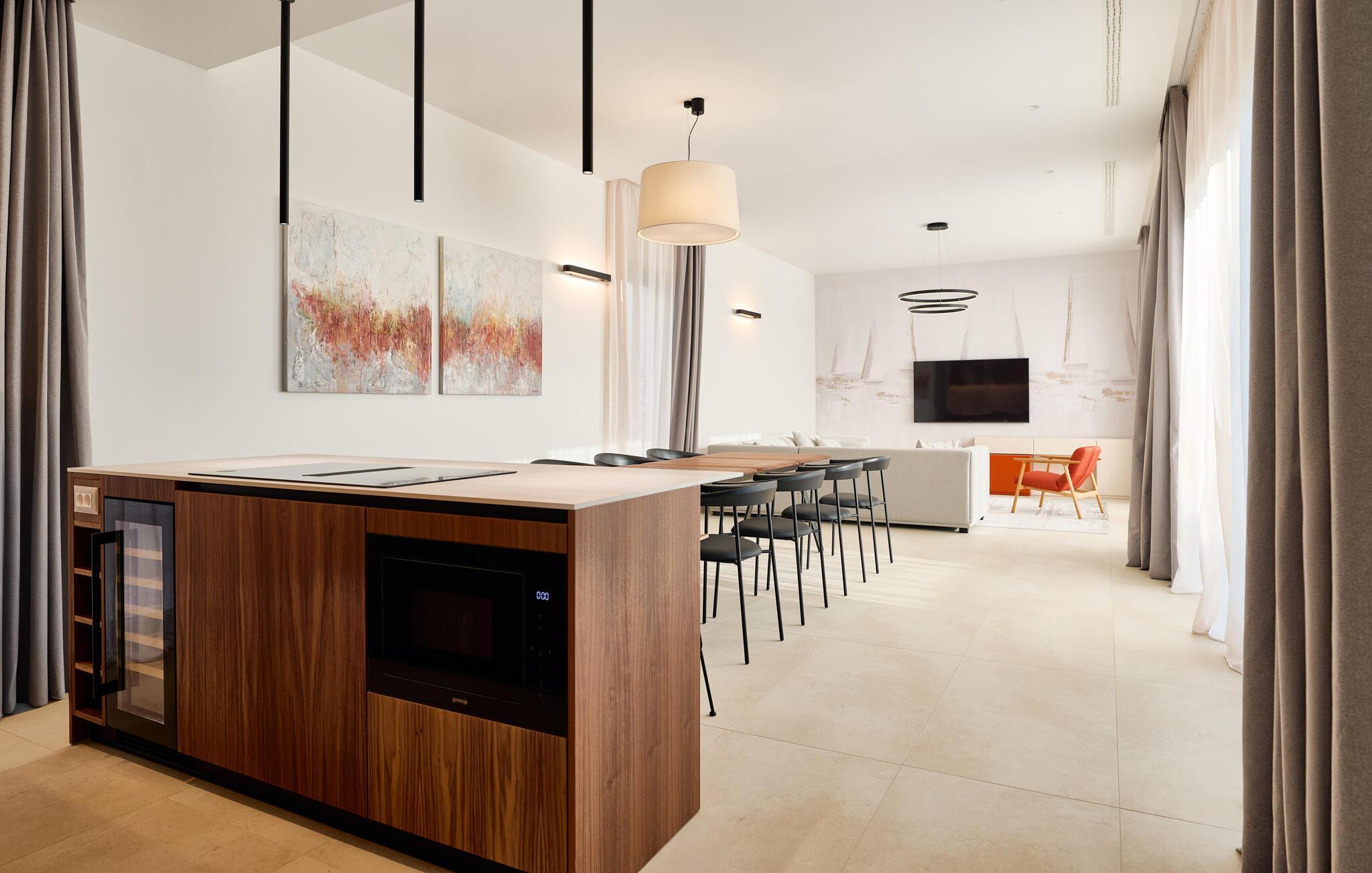 Interiøret lægger vægt på varme og funktionalitet, karakteriseret ved minimalistisk design og materialer af høj kvalitet. Læn jer tilbage i den åbne stue med en behagelig sofa, moderne møbler og store panoramavinduer. Brug den elegante spiseplads til fælles måltider eller tilbered kulinariske lækkerier i det smukke køkken.
