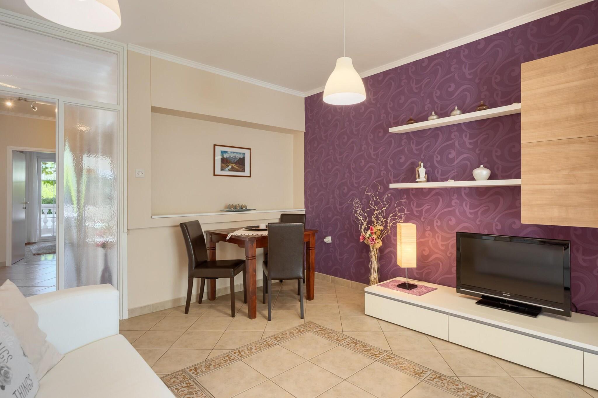 The lejlighed i Porec har 1 soveværelse(r) og kapacitet til 4 person(er). Bolig på 45 m² gode møbler og er moderne, med udsigt til have. Er beliggende 800 m fra supermarkedet "Spadici", 900 m fra stenstranden "Špadici", 900 m fra stranden "Marea Beach bz Valamar", 3 km fra byen "Porec-center", 3 km fra busstationen "Bus station Porec", 8 km fra vandland "Aquacolors Porec", 11 km fra forlystelsesparken "Dinopark Funtana", 23 km fra floden "Rver Mirna/ Quieto", 23 km fra de varme bade "Istarske Toplice/ Istrian Spa", 35 km fra togstationen "Train station Pazin", 41 km fra sø "Accumulation lake Butoniga", 45 km fra golfbanen "Crveni Vrh", 59 km fra lufthavnen "Airport Pula", 60 km fra togstationen "tTain station Pula", 62 km fra naturparken "NP Brijuni", 75 km fra naturparken "PP Ucka", 116 km fra lufthavnen "Airport Rijeka", 116 km fra lufthavnen "Airport Trst", 146 km fra naturparken "NP Risnjak" og er beliggende i en ideel for familier område og tæt ved havet. Tilbyder have, terrassemøbler, indhegnet grund, 10 m² terrasse, vaskemaskine, grill, strygejern, internet (wifi), hårtørrer, altan, varmepumpe, aircondition, utildækket parkering til den samme bygning, 1 TV, satellit (Sprog: Engelsk, Tysk). The amerikanske køkken, elektrisk, med service og køleskab, mikroovn, fryser, opvaskemaskine, tallerkener/bestik, køkkenredskaber, kaffemaskine, brødrister og kedel.