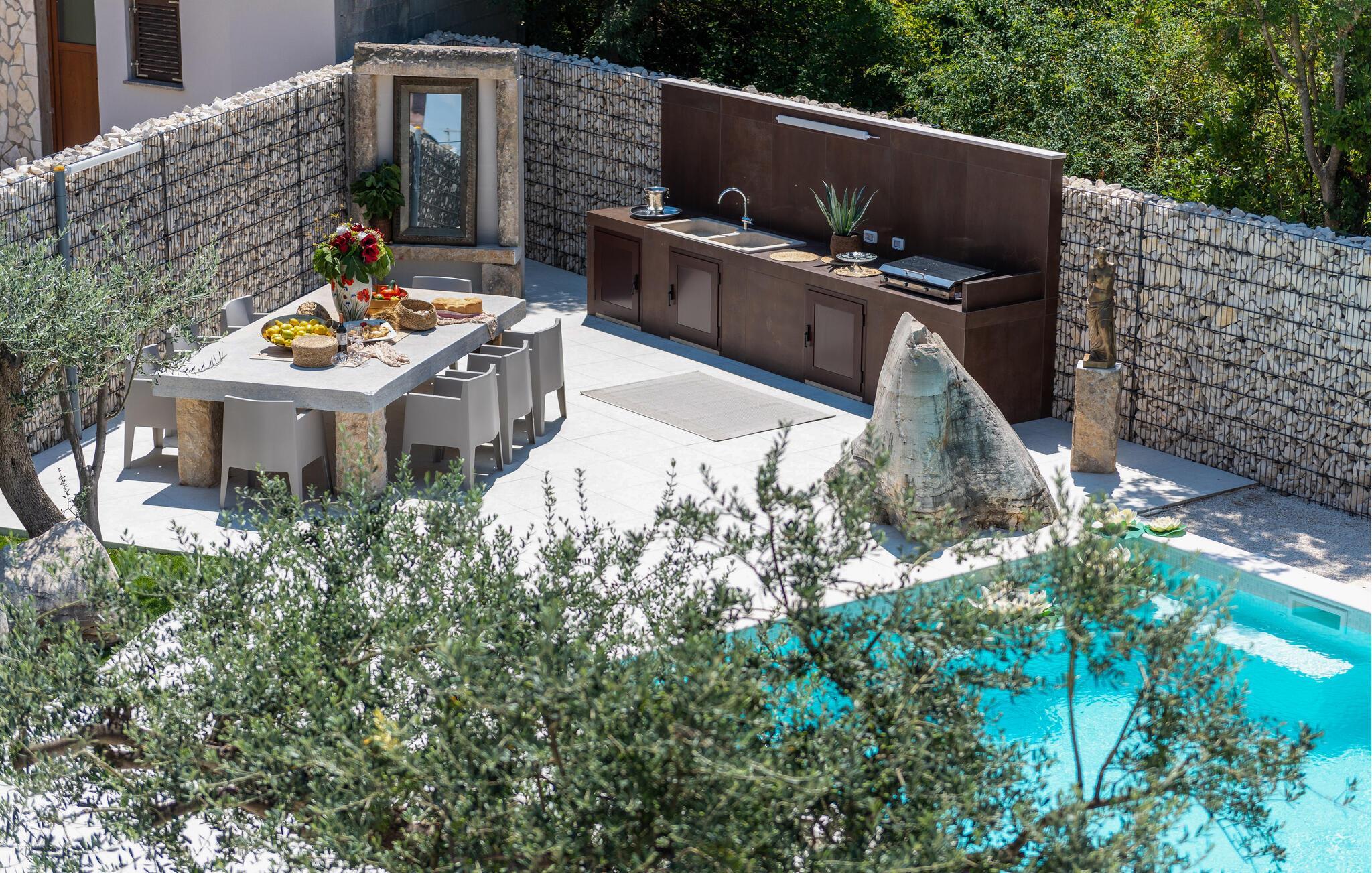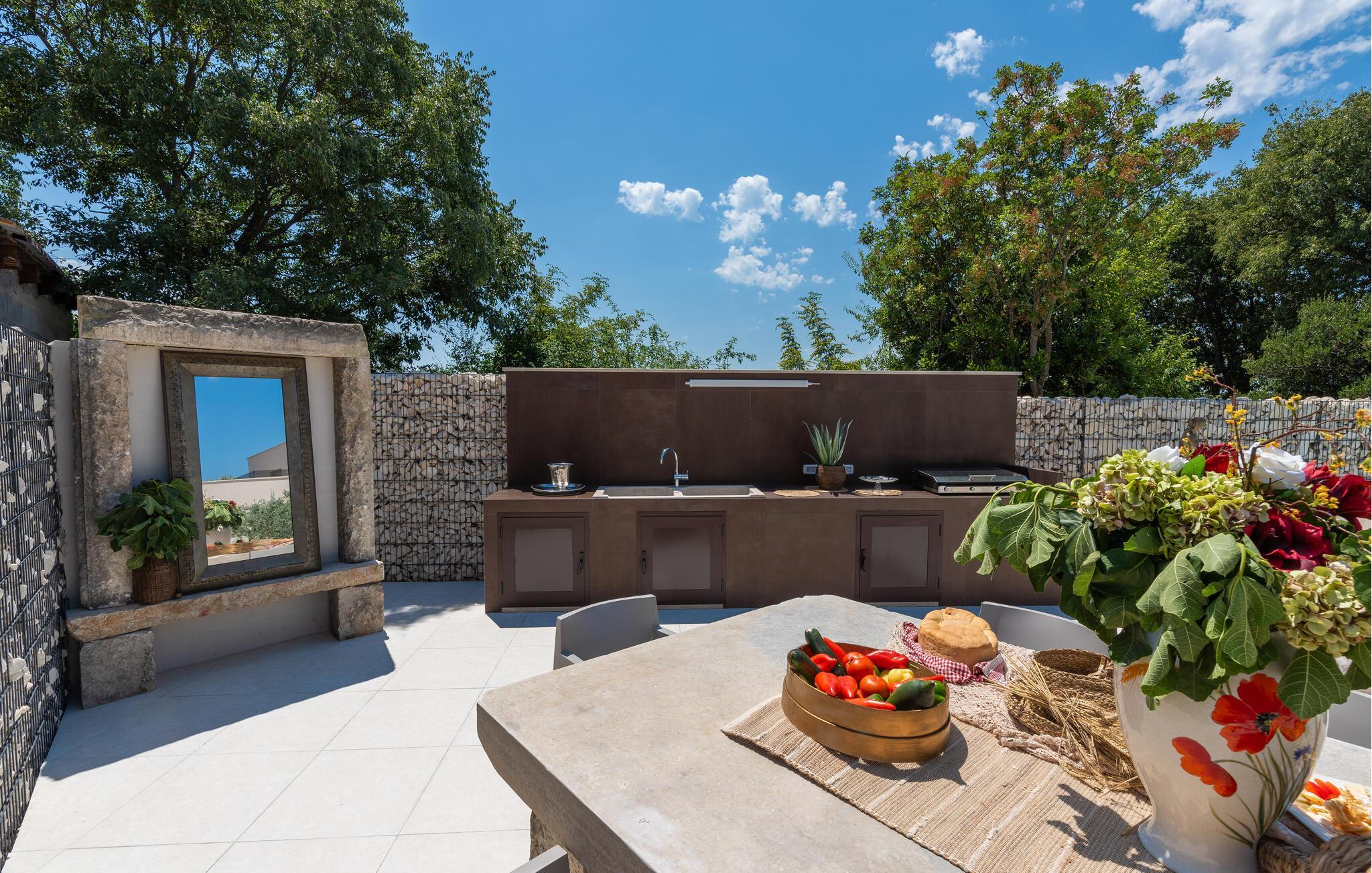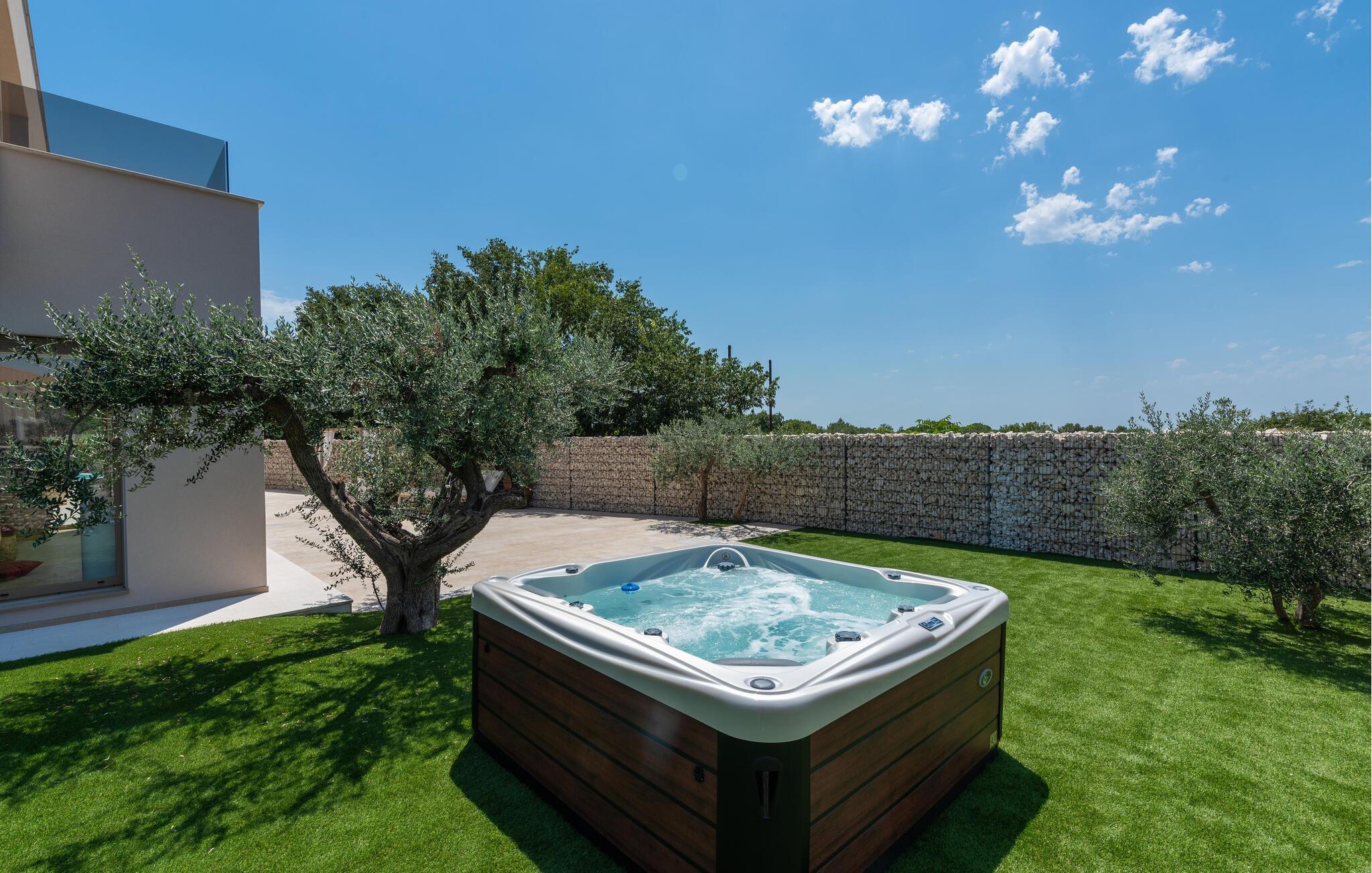 En fantastisk oase venter jer udenfor med udendørs pool, spabad og hyggelige daybeds. begynd dagene med morgenmad på den overdækkede terrasse, nyd solen på en af ??de komfortable liggestole og brug udekøkkenet til at forberede stemningsfulde grillaftener i det fri.