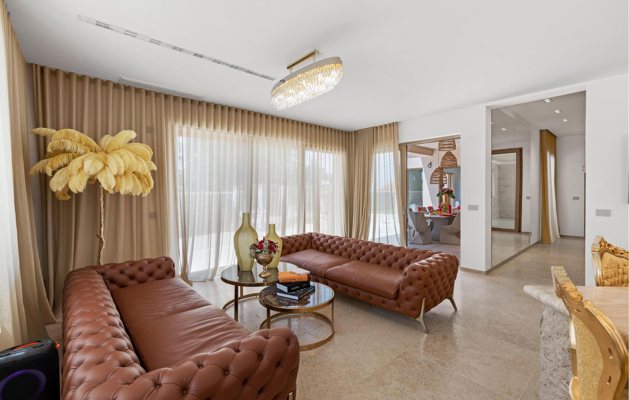 Dette eksklusive hjem kombinerer moderne elegance med klassisk charme. Den rummelige opholdsstue med fine møbler og store panoramavinduer lægger op til afslappende timer. Forkæl jer selv med kulinariske kreationer i det stilfulde køkken og nyd dagens måltider ved det elegante spisebord. Afslut dagen i saunaen eller på de komfortable liggestole i afslapningsrummet, og på kølige dage kan I svømme i den rummelige indendørs pool.