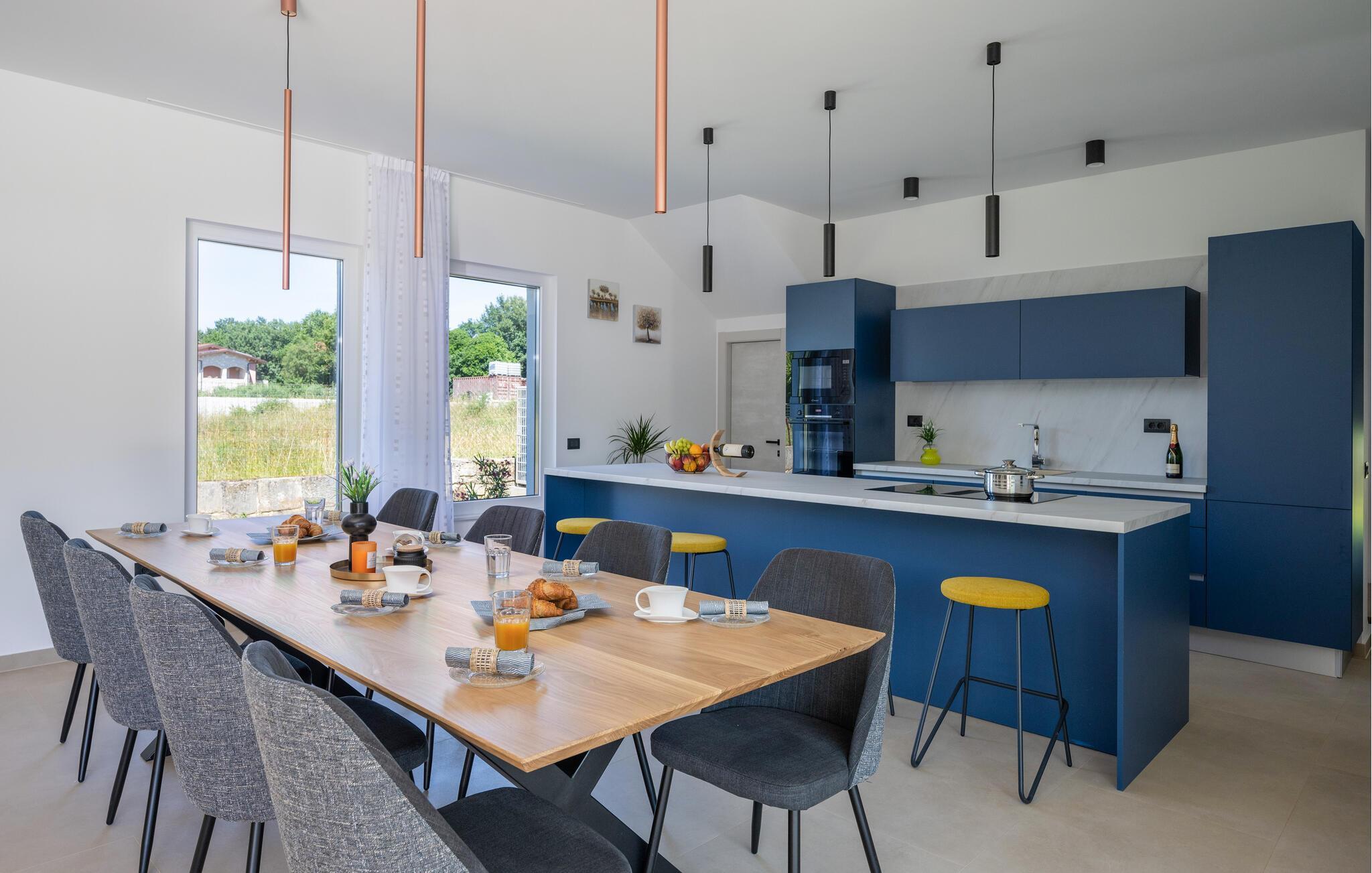 Denne moderne og luksuriøse ferievilla giver jer en rummelig opholdsstue med en stor, komfortabel sofa og et fuldt udstyret køkken til at tilberede dagens måltider sammen. Nyd morgenmaden sammen i fred og ro, enten ved det elegante spisebord eller brug det stilfulde udendørsområde til hyggelige måltider under åben himmel.
