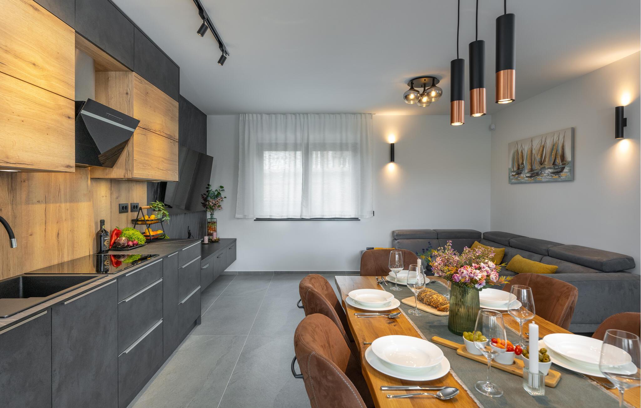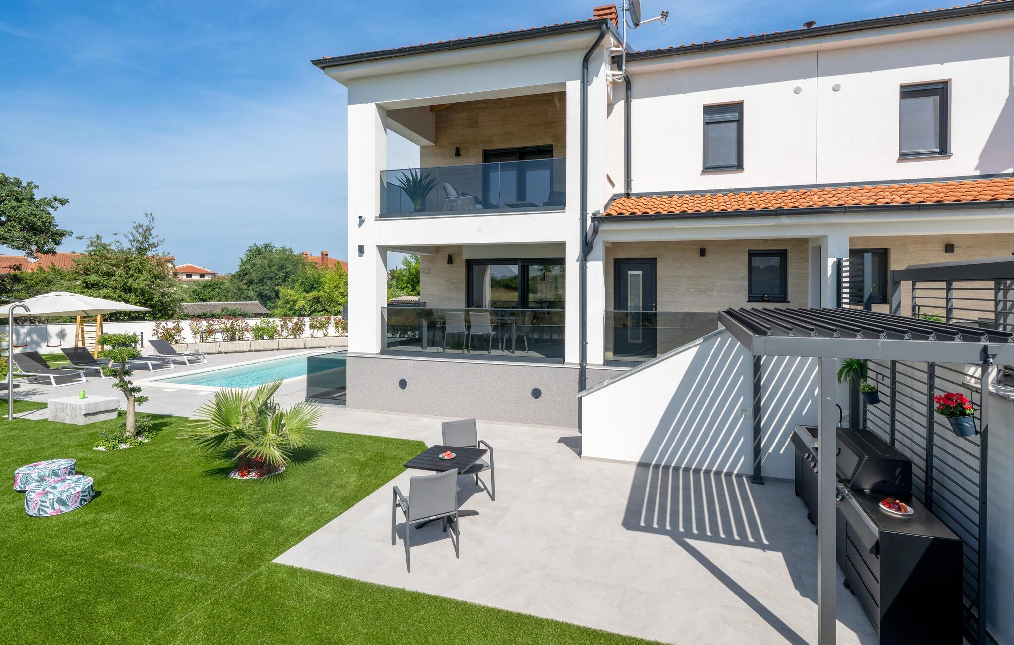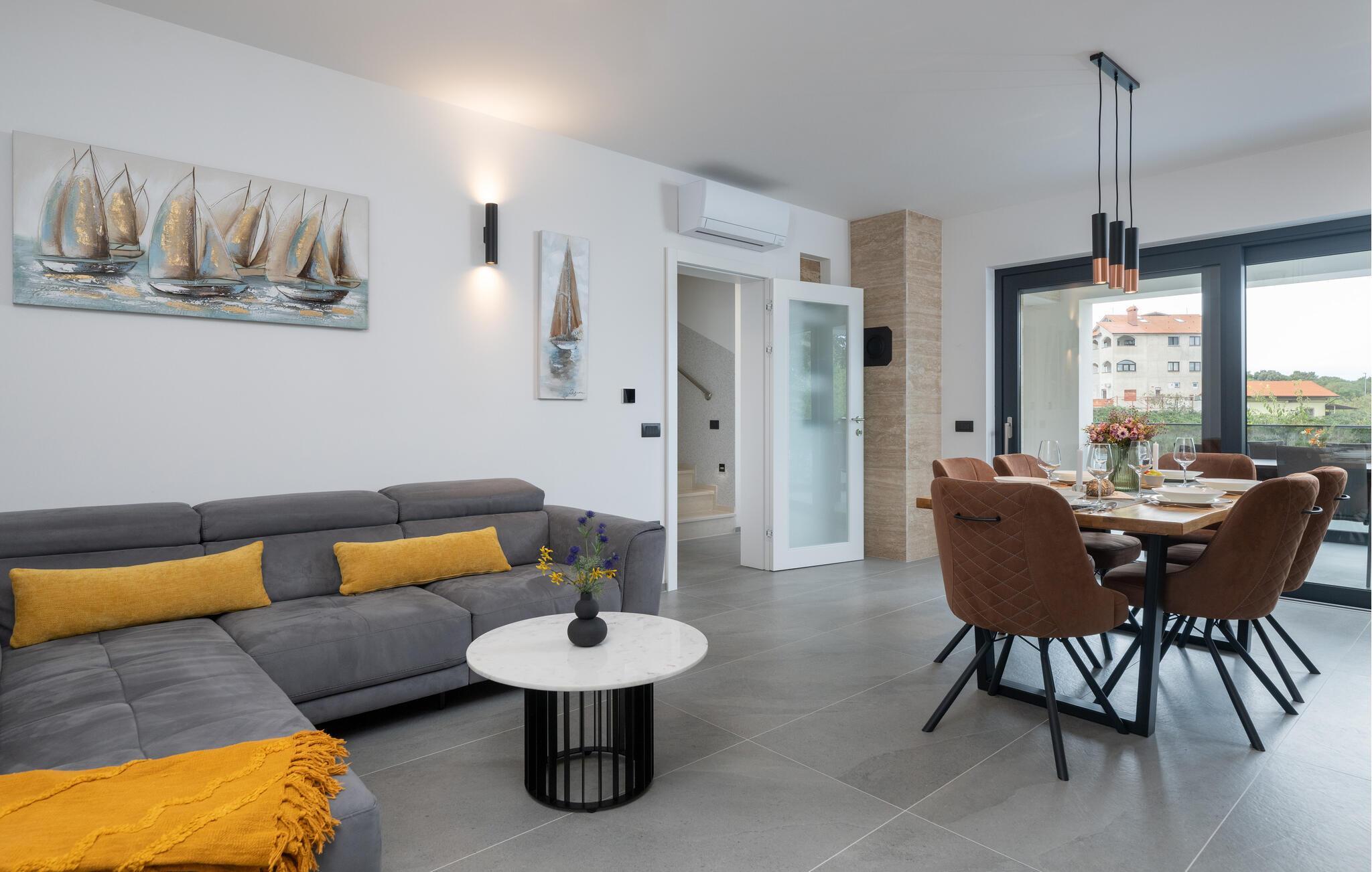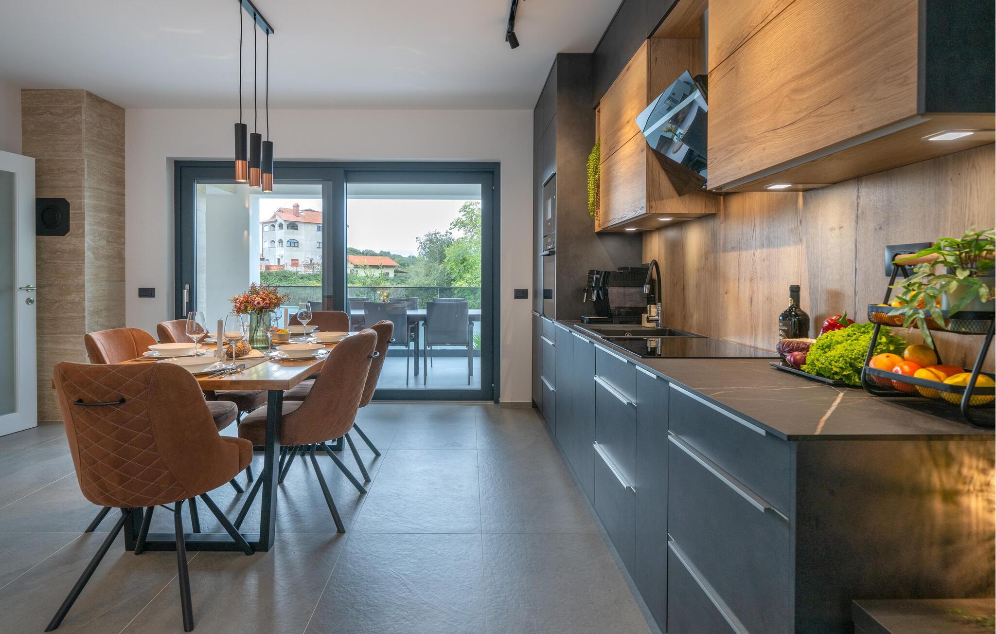 Jeres luksuriøse hus ved Istriens kyst tilbyder jer og jeres familie eller venner det ideelle tilflugtssted. Start dagen på den hyggelige terrasse, udstyret med et spisebord, som er ideelt til en morgenmad i det fri. Nyd udsigten til det smukke poolområde og lad roen falde over jer. Huset imponerer med et åbent og elegant boligkoncept. Gør jer det behageligt på den komfortable sofa og nyd jeres yndlingsfilm om aftenen. Den indbydende spisestue har plads til fælles måltider, og det veludstyrede køkken inspirerer til at tilberede lækre retter.