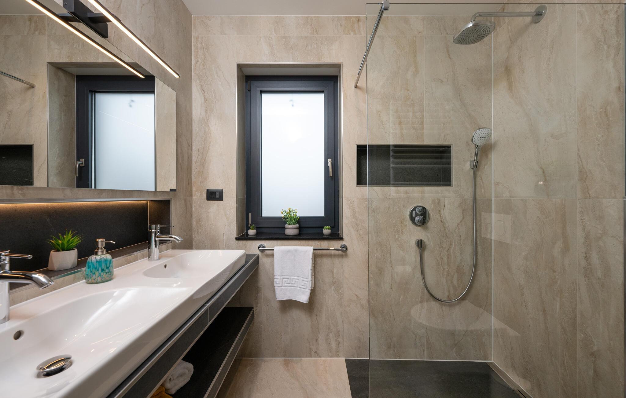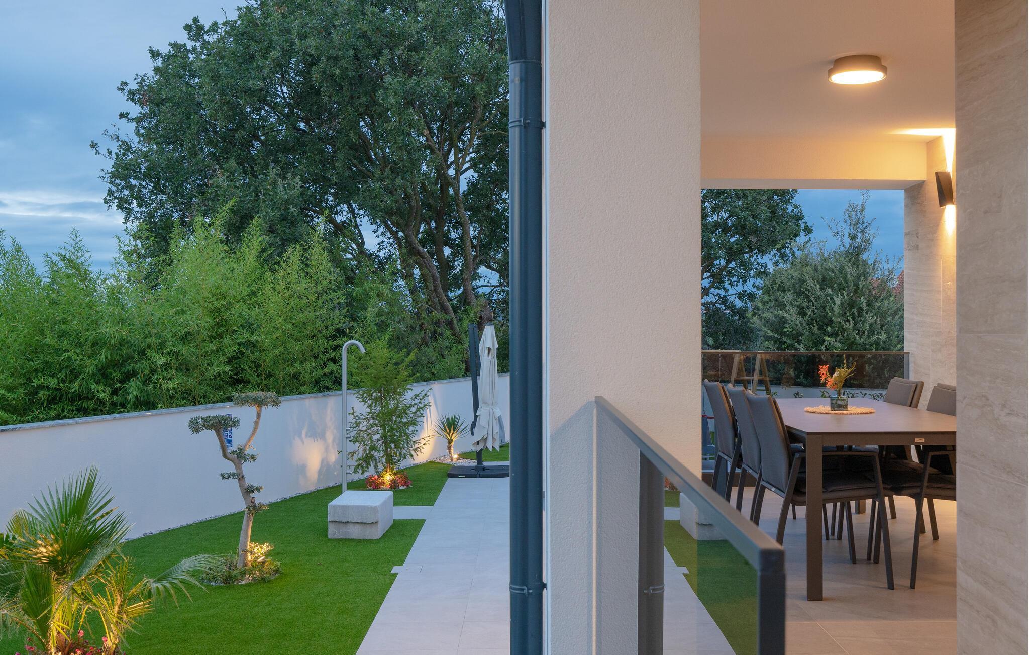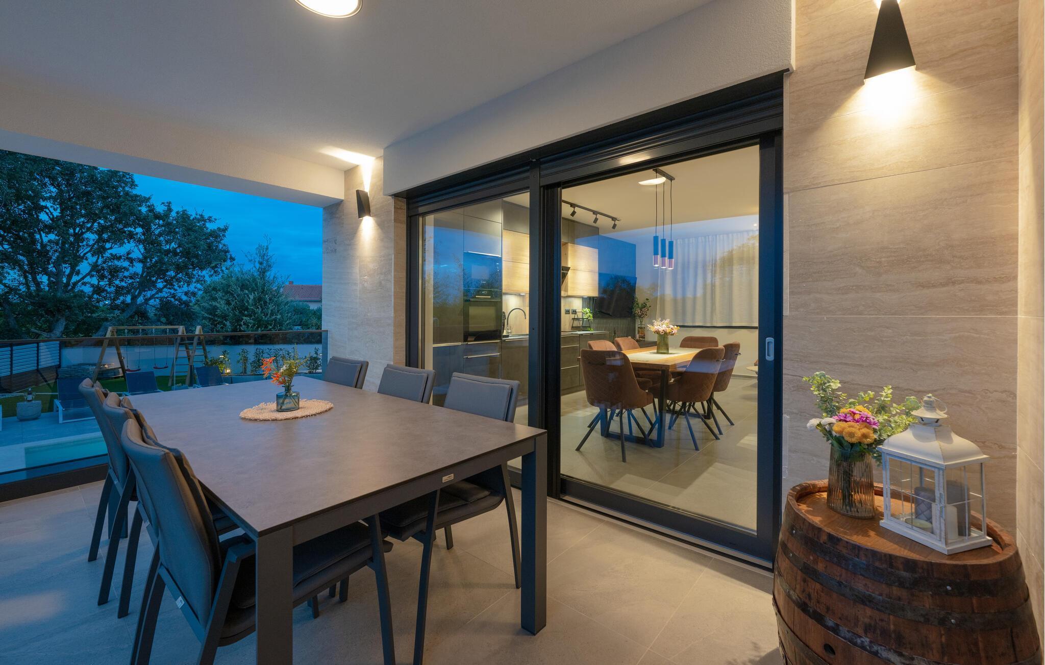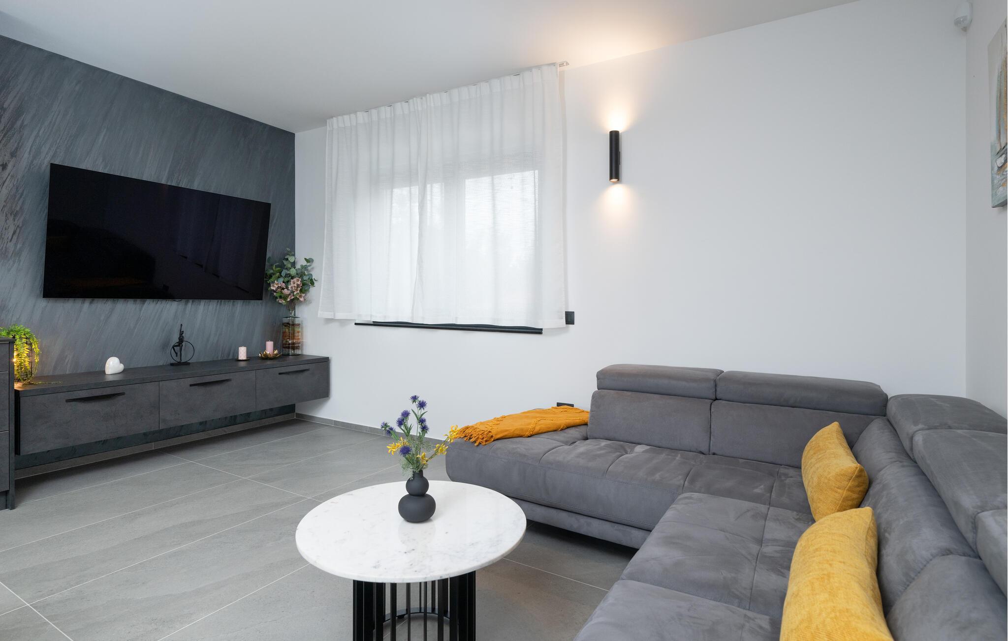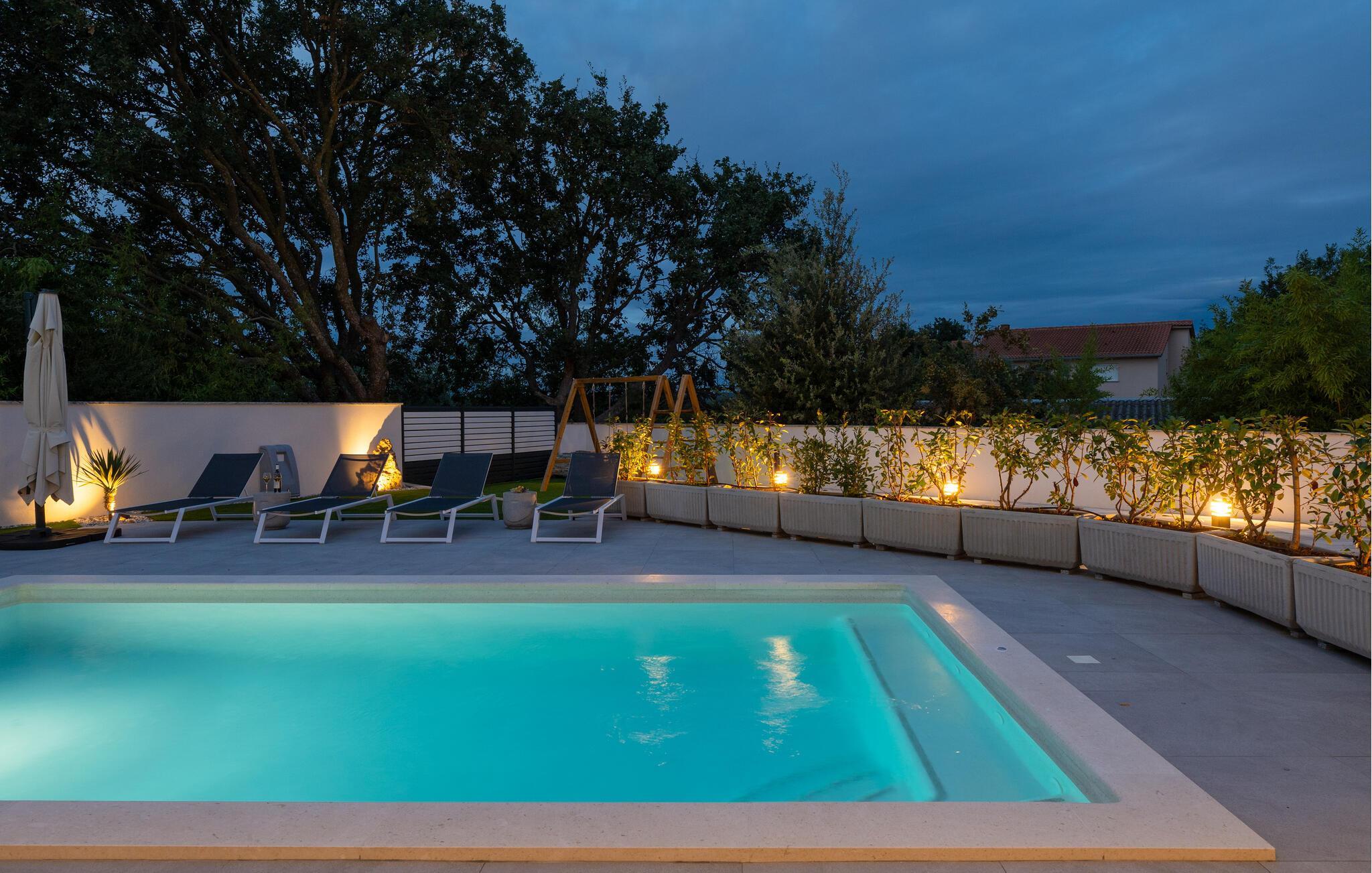 Jeres luksuriøse hus ved Istriens kyst tilbyder jer og jeres familie eller venner det ideelle tilflugtssted. Start dagen på den hyggelige terrasse, udstyret med et spisebord, som er ideelt til en morgenmad i det fri. Nyd udsigten til det smukke poolområde og lad roen falde over jer. Huset imponerer med et åbent og elegant boligkoncept. Gør jer det behageligt på den komfortable sofa og nyd jeres yndlingsfilm om aftenen. Den indbydende spisestue har plads til fælles måltider, og det veludstyrede køkken inspirerer til at tilberede lækre retter.