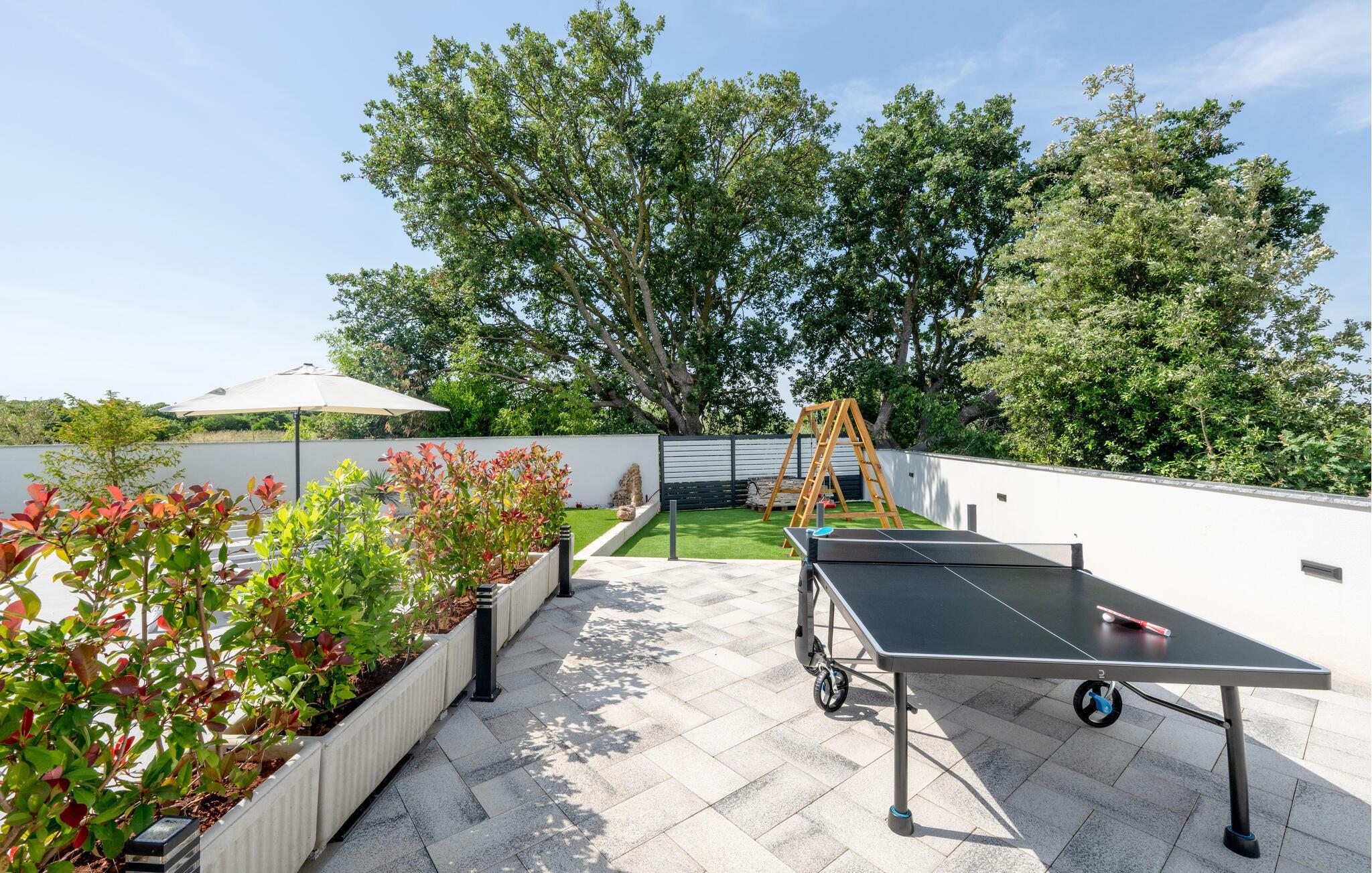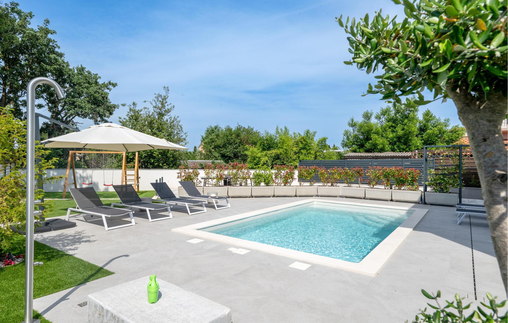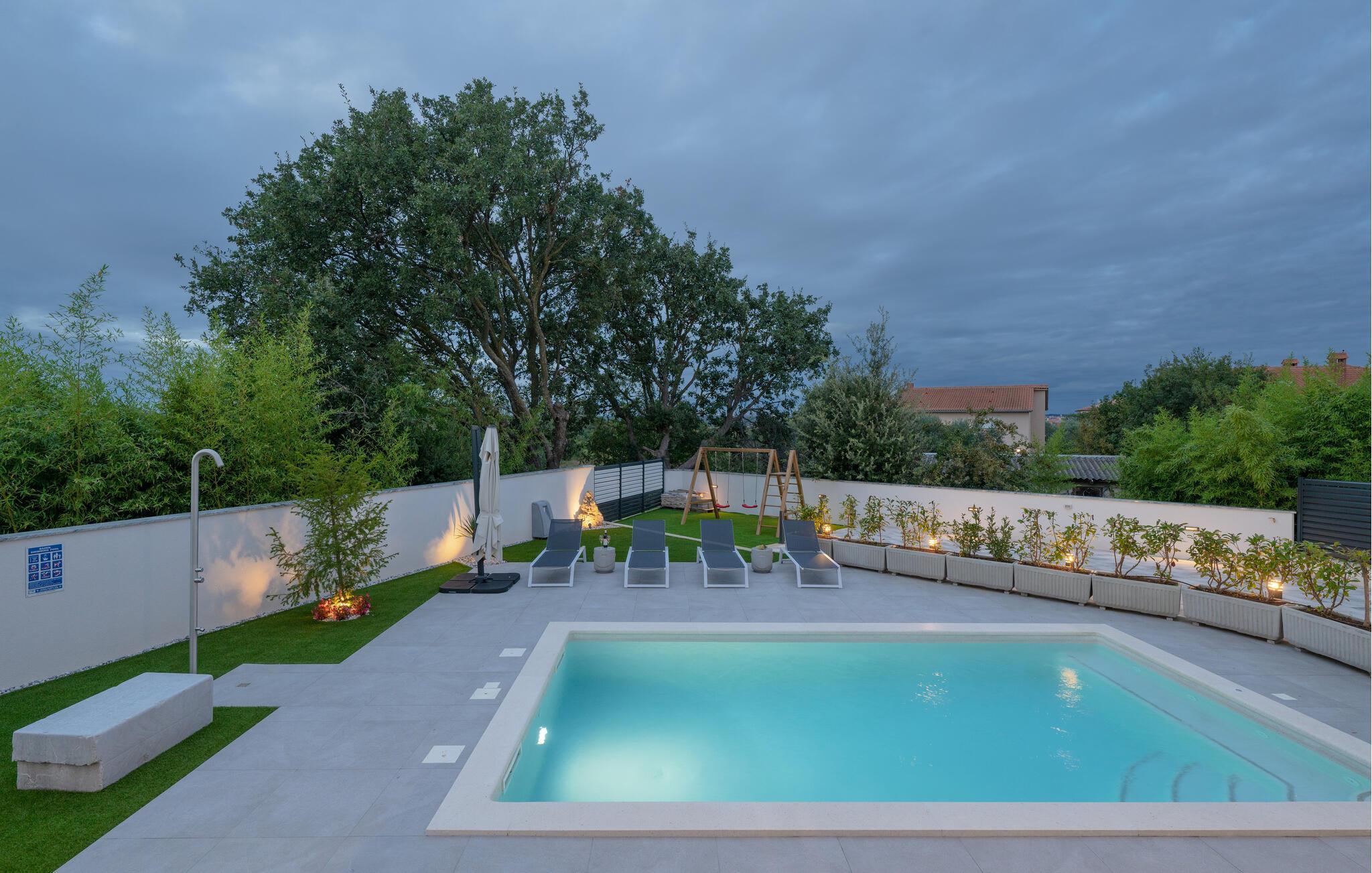 I haven venter en smuk pool, som er perfekt til en afkøling på varme sommerdage. For de små gæster er der en gynge i haven, som sørger for sjov og underholdning, mens I kan slappe af ved poolen.