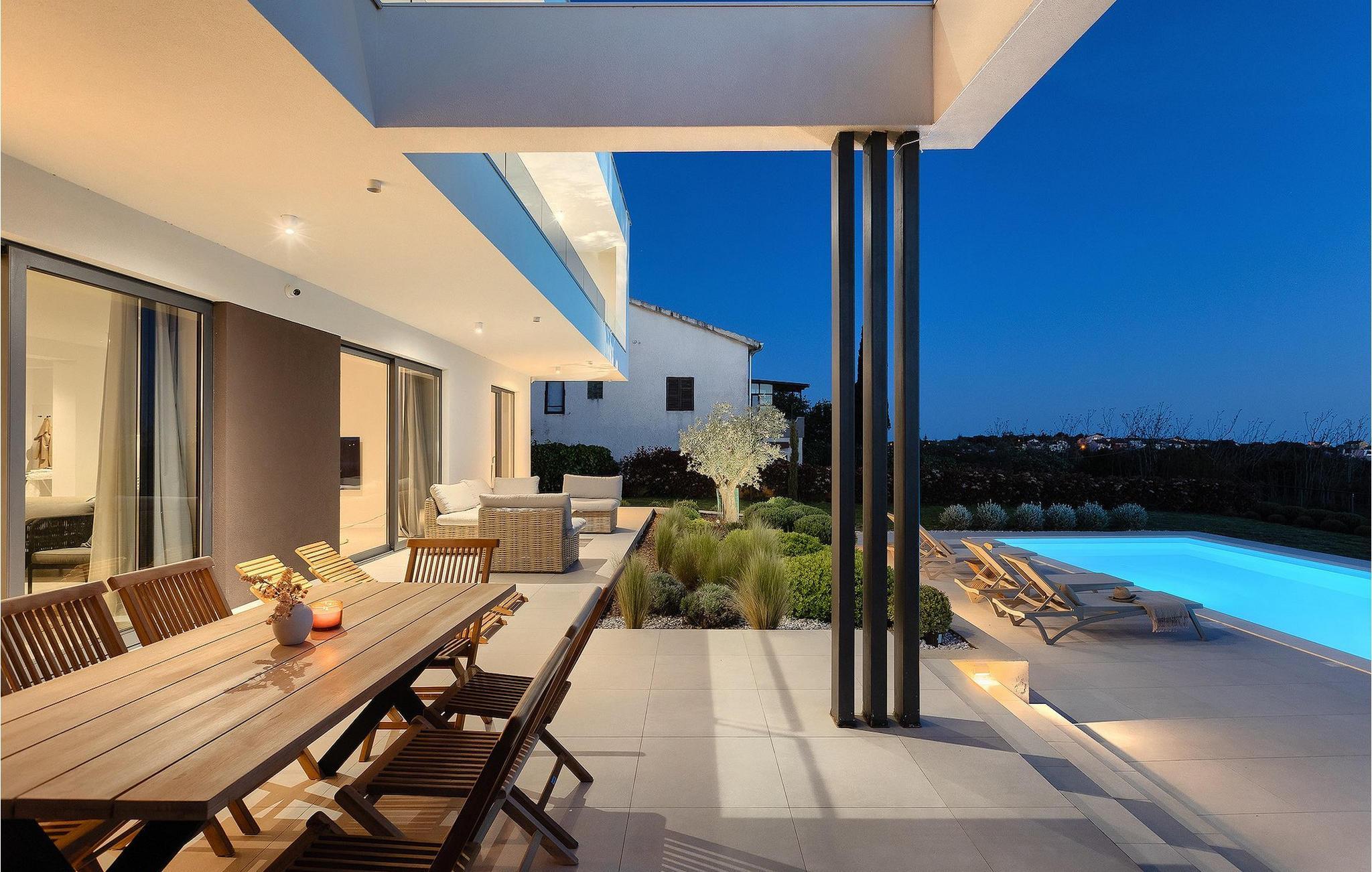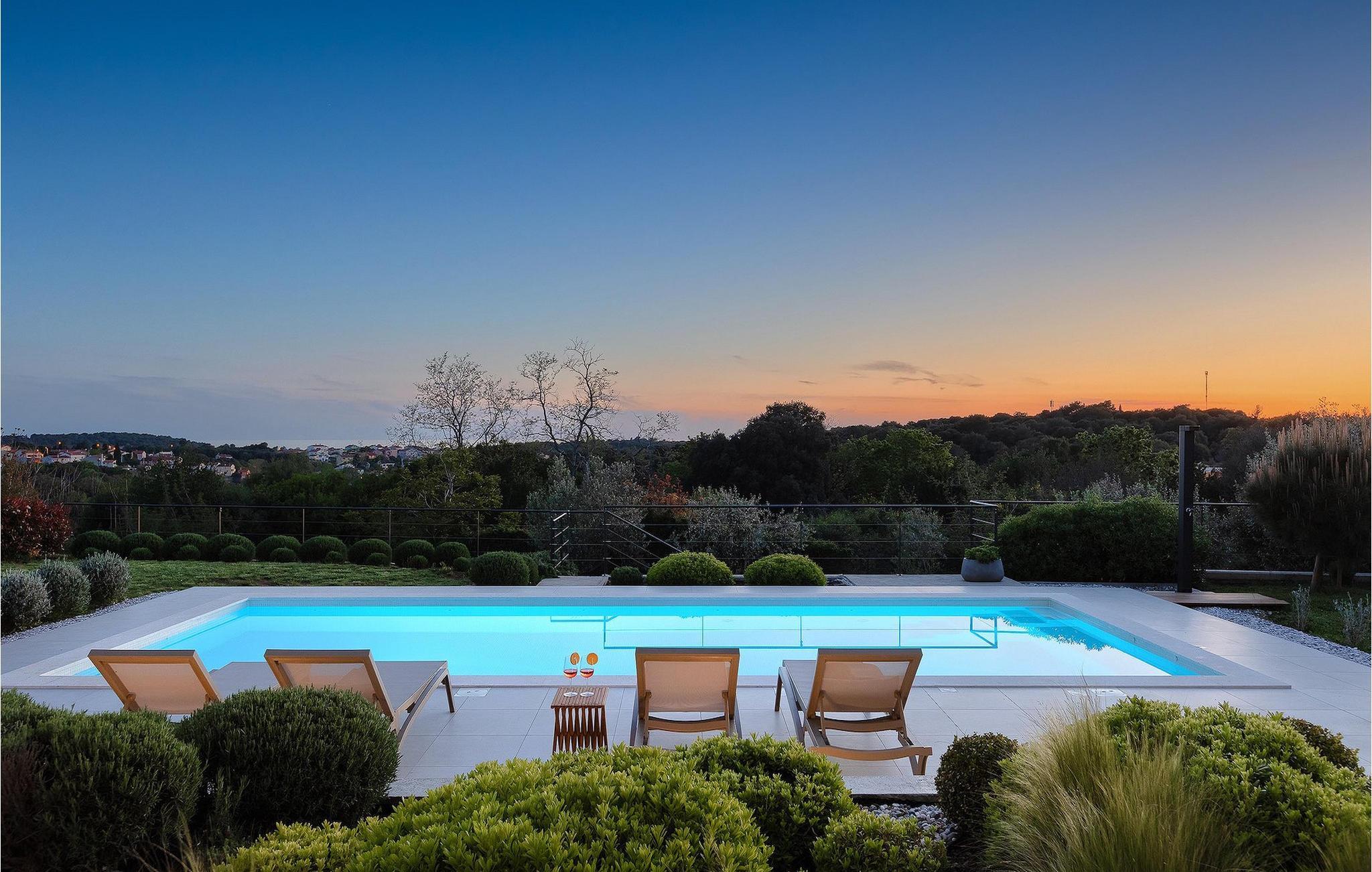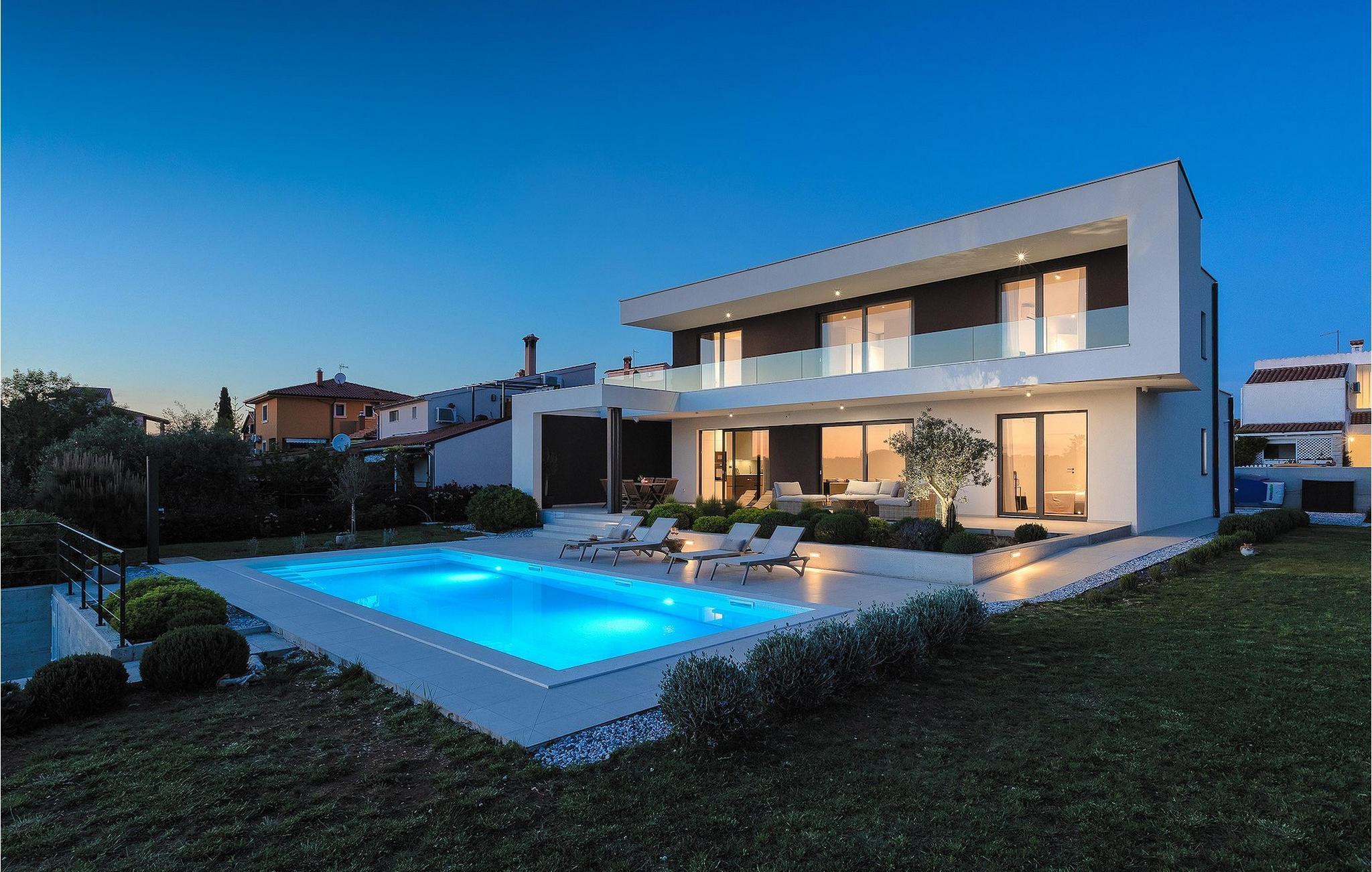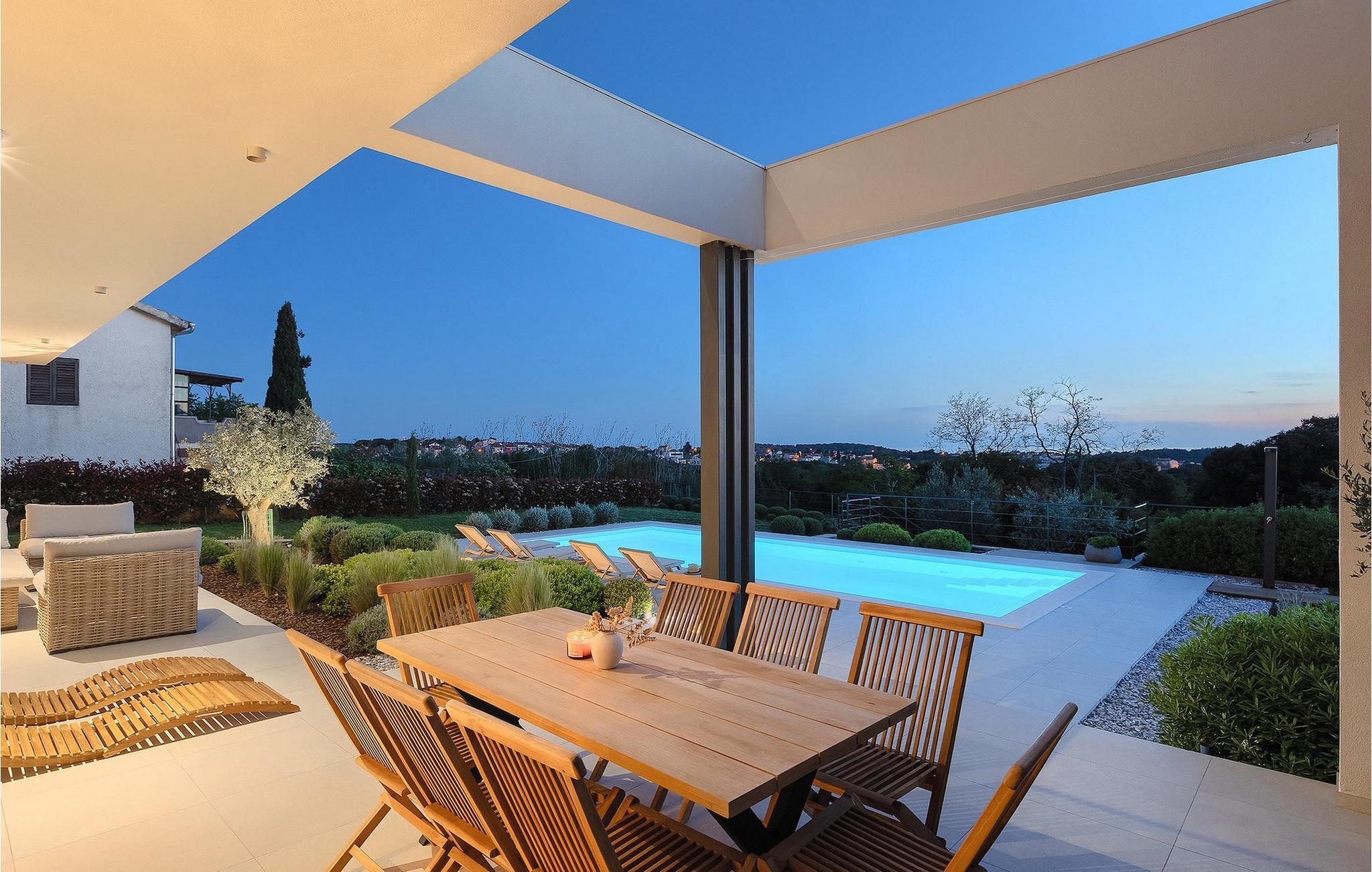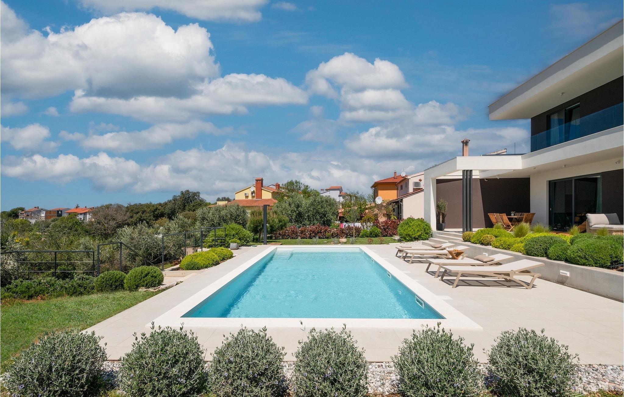 Den luksuriøse Villa Sealine nær byen Pula er ideel for dem, der søger en rolig flugt og afslapning. Villaen blev bygget i 2022, den ligger cirka 400 meter fra havet og kan rumme op til 8 personer i 4 soveværelser og 4 badeværelser fordelt på 2 etager. Dets faciliteter vil helt sikkert give gæsterne alt, hvad de har brug for, når de besøger Istrien. Villaens udeareal er et dejligt stort rum til fuld afslapning. Mens omgivet af masser af vegetation. Den 40m2 private pool med hydromassage giver gæsterne mulighed for at køle af på de varme sommerdage, og det vil være højdepunktet på børnenes ferie. Voksne kan slappe af ved poolen på de komfortable liggestole, slikke strålerne, mens de læser en god bog og nipper til en forfriskende drik. Eksperimenter med det kroatiske køkken ved at tilberede gode måltider på kulgrillen og dele dem med familie og venner i terrassens overdækkede spiseplads. Interiøret vil heller ikke skuffe, med et rent, lyst og moderne design i hele huset. En stor stue, et fuldt udstyret køkken med spiseplads, et separat toilet og et dejligt dobbeltværelse med eget badeværelse med bruser findes i stueetagen. På første sal er der yderligere 3 dobbeltværelser med eget badeværelse og terrasser med fantastisk udsigt. I hele villaen kan du nyde den fantastiske panoramaudsigt over omgivelserne, samt Adria. Villaen har også fuldt aircondition og har Wi-Fi-adgang. Villa Sealine er smukt designet, rummelig og veludstyret, så at bo i denne villa kan være det helt rigtige valg for at nyde en fantastisk tid i Istrien.