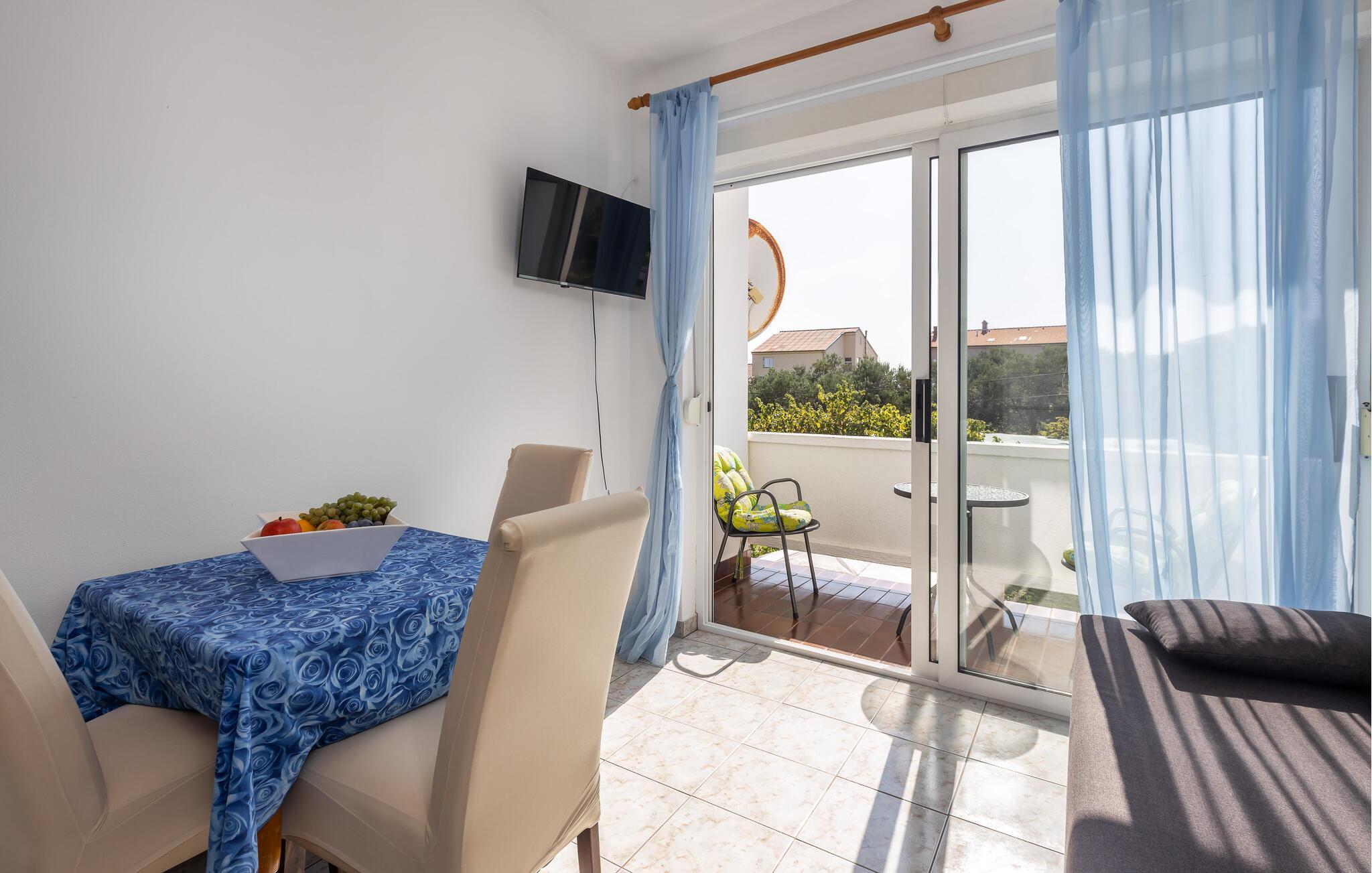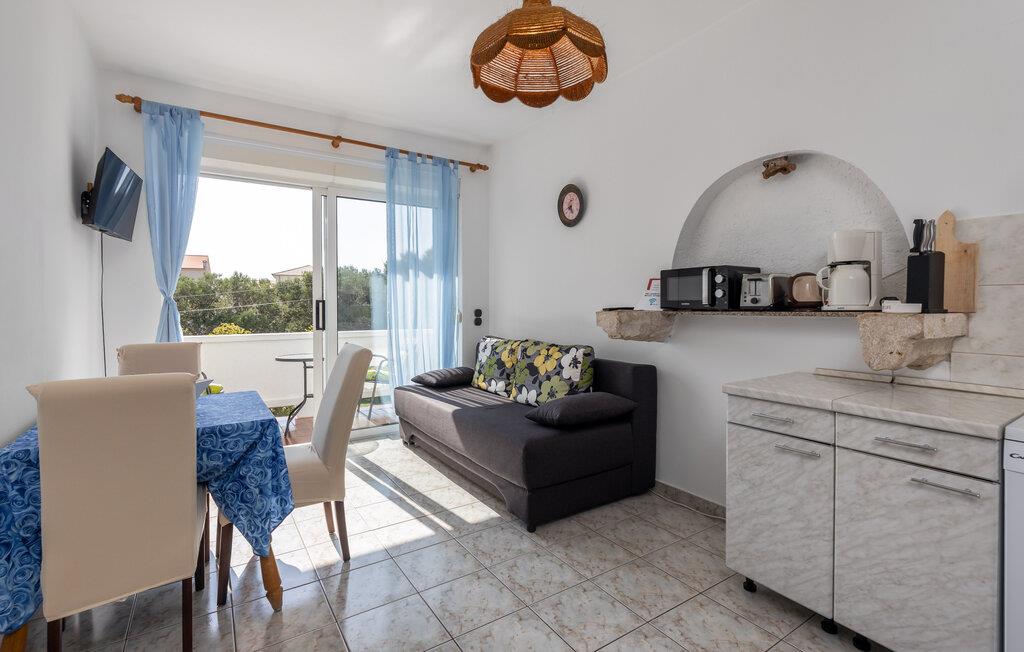 Denne lejlighed, der er roligt beliggende på øen Rab, er en skøn oase til en pause fra hverdagen. En lys stue med sofa, hyggelige hynder og et lille køkken skaber en atmosfære, der hurtigt vil få jer til at føle jer hjemme. Her kan I tilbringe jeres dag, som I ønsker – uanset om det er med en kop kaffe, en hyggelig spilleaften eller at prøve en ny opskrift.