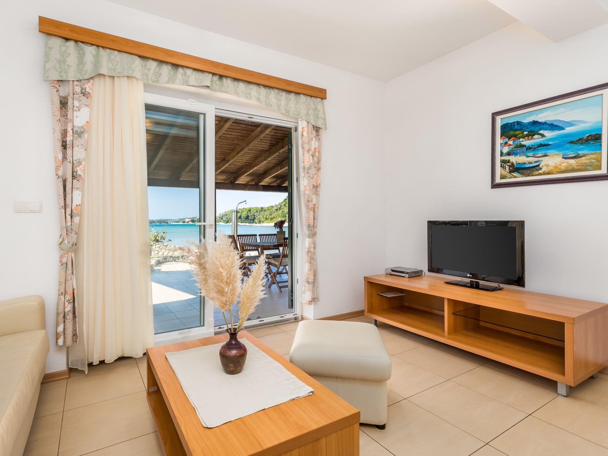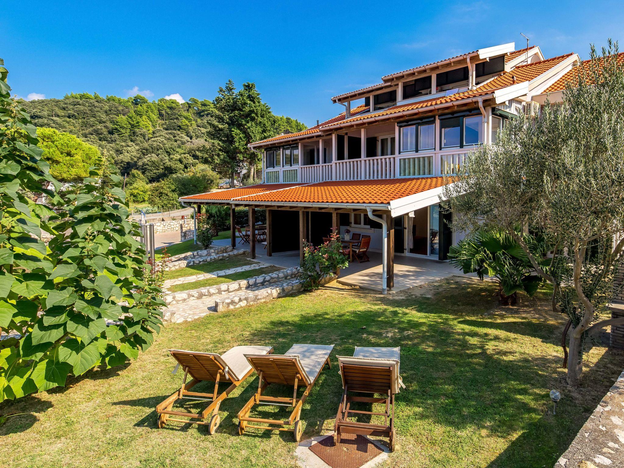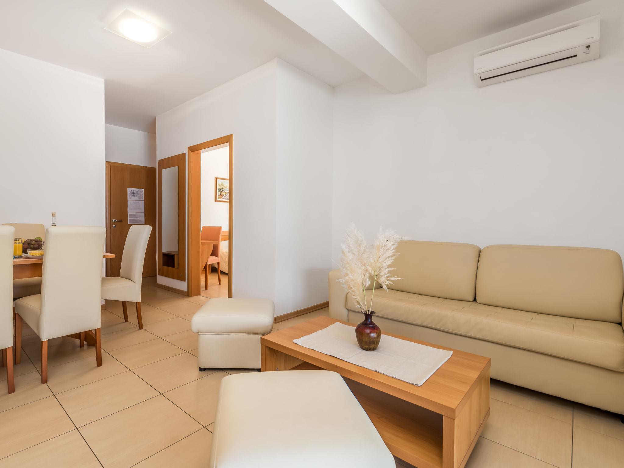 "Mare 2", 3-room apartment 50 m2, on the ground floor. Beautiful and modern furnishings: living/dining room 18 m2 with 1 double sofabed, satellite TV and air conditioning. Exit to the terrace. 1 room with 1 double bed (160 cm, length 200 cm). 1 room with 1 x 2 bunk beds. Open kitchen (4 hot plates, dishwasher, microwave, freezer). Shower/WC. Terrace 25 m2, roofed. Terrace furniture. Beautiful view of the sea. Facilities: safe. Internet (WiFi, free). Parking.