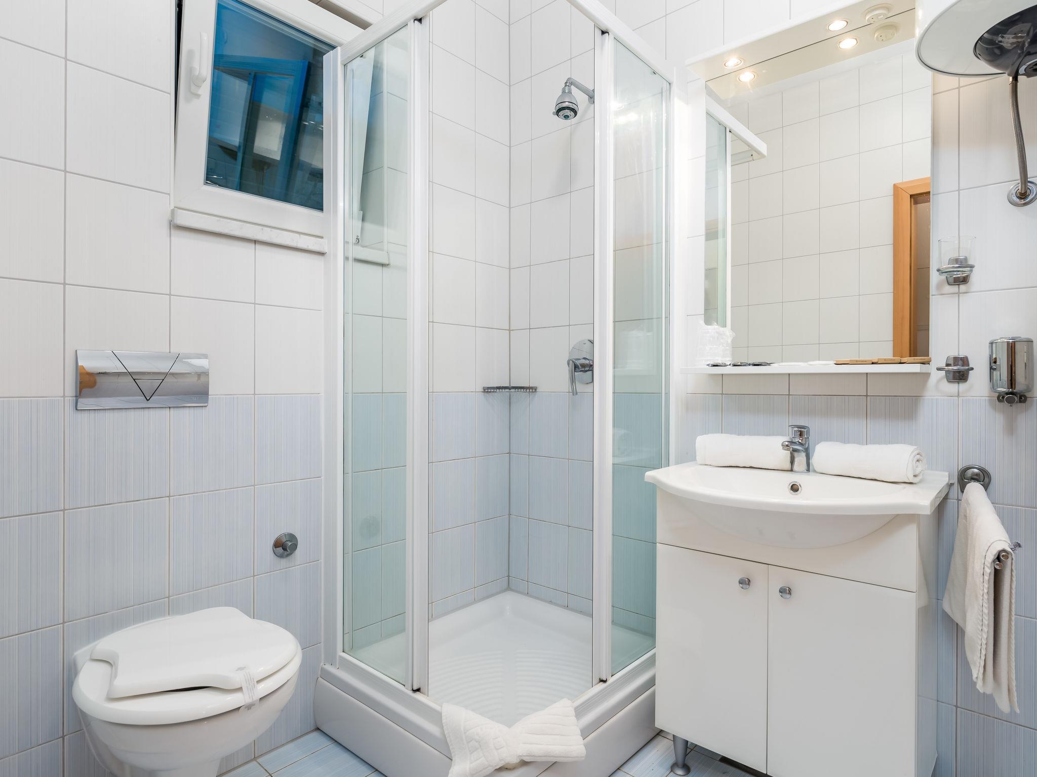 "Tomislav 4", 2-room apartment 48 m2 on 1st floor. Modern and cosy furnishings: living/dining room 30 m2 with 1 double sofabed (145 cm, length 195 cm), satellite TV and air conditioning. Exit to the terrace. 1 room with 1 double bed (160 cm, length 200 cm). Exit to the terrace. Open kitchen (4 hot plates, microwave, freezer). Shower/WC. Terrace 10 m2, roofed. Terrace furniture. View of the swimming pool. Facilities: safe. Internet (WiFi, free). Parking.