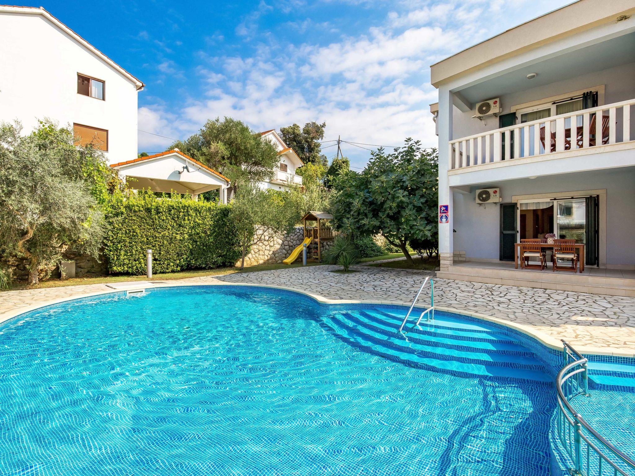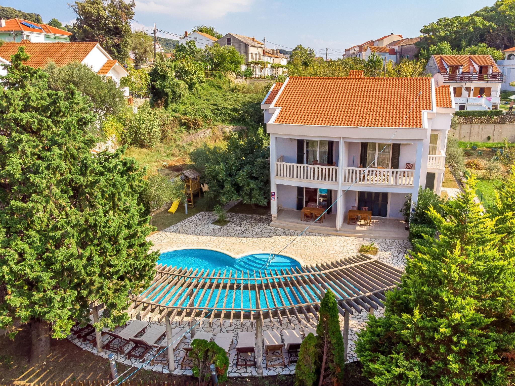 Kampor 6 km from Rab: Child friendly apartment block. In a quiet, sunny position, 40 m from the sea, 40 m from the beach. For shared use: property (fenced), well-kept garden with lawn, swimming pool kidney-shaped heated (12 x 6 m, depth 120 - 160 cm, seasonal availability: 13.May. - 30.Sep.) with internal staircase. Children's pool, outdoor shower, arbour, garden furniture, barbecue. In the house: internet access. Parking. Shop, restaurant 150 m, bus stop 2.4 km, concrete beach 40 m. Please note: the photograph shows a typical example. Additional accommodations can be booked. Property ref. HR3703.620 is situated on the same property. The apartment house "Tomislav" is situated on the same grounds (2700 m2) with the apartment house "Mare", with swimming pool for shared use with counterflow. One part of the pool is a paddling pool, depth 30 - 60 cm. Deck chairs at disposal. Concrete beach with sand sea bottom, slightly sloping, very suitable for children 40 m from the house.