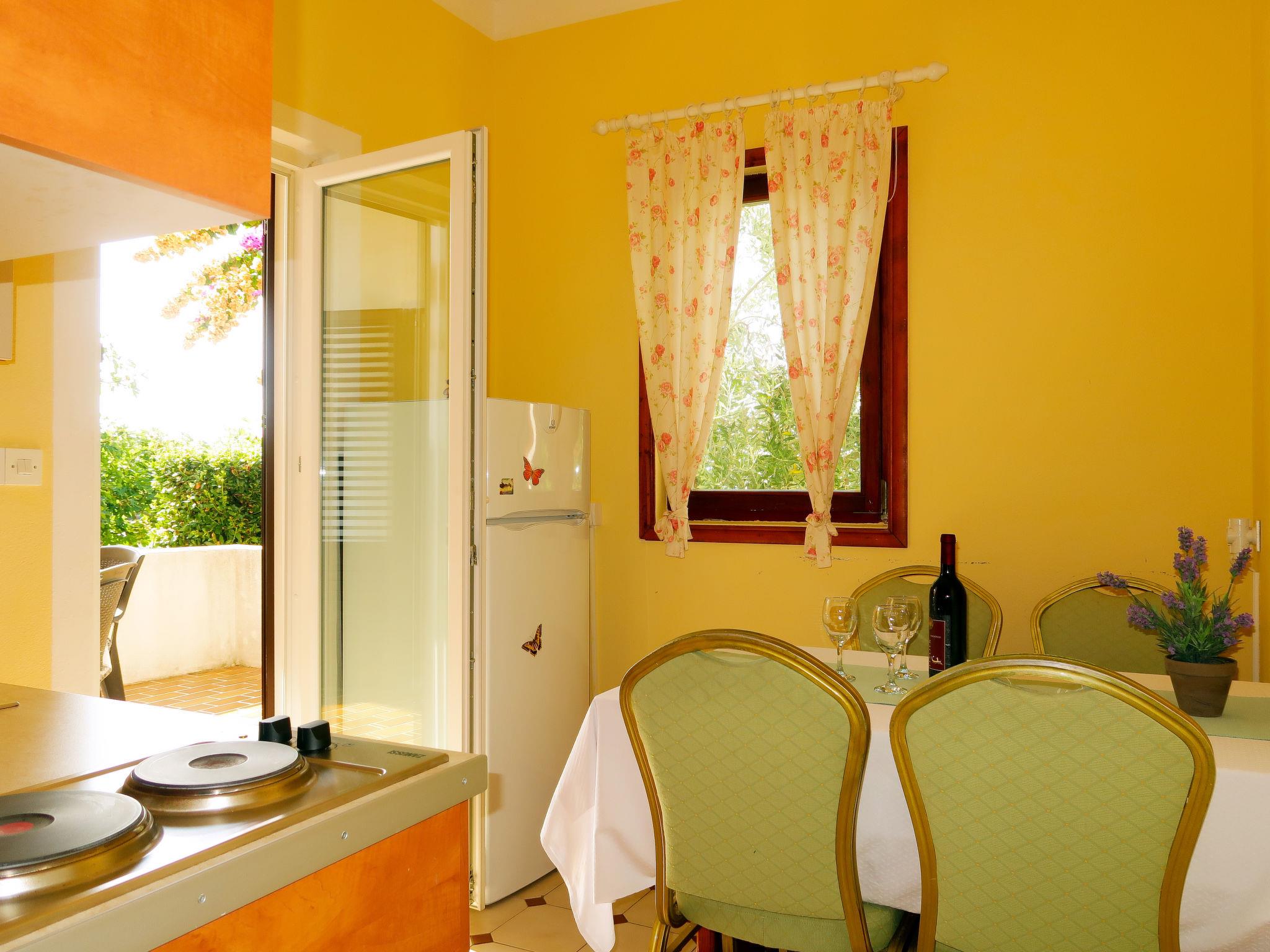 "Ana", 2-room apartment 50 m2, on the ground floor. 1 room with 1 double bed (2 x 100 cm, length 220 cm). 1 room with 1 french bed (180 cm, length 200 cm), satellite TV and air conditioning. Exit to the terrace. Kitchen-/living room (2 hot plates, toaster, kettle, microwave, freezer, electric coffee machine) with dining table. Exit to the terrace. Shower/WC. No heating option. Terrace 9 m2. Terrace furniture. Facilities: Internet (WiFi, free). Maximum 2 pets/ dogs allowed.