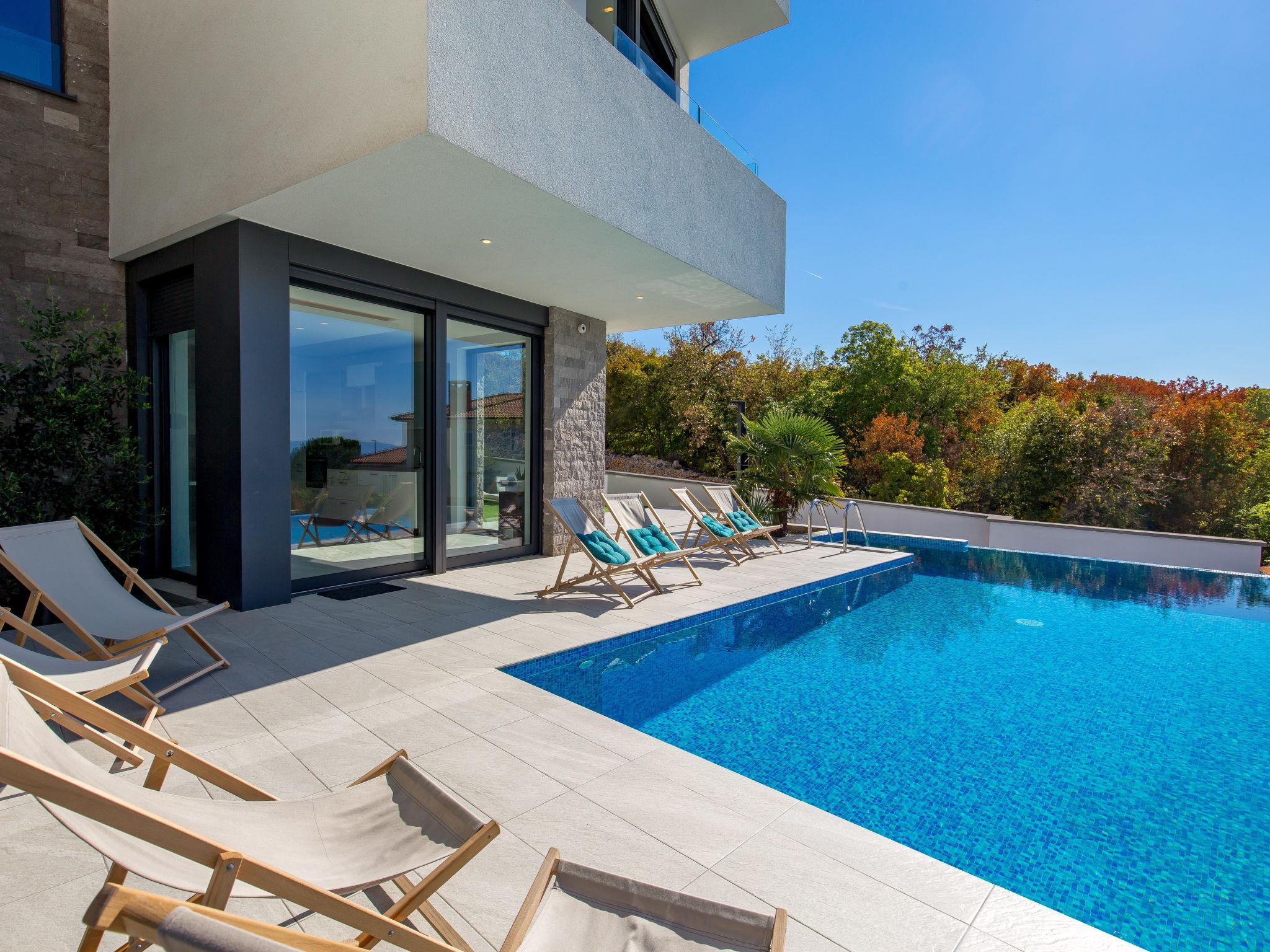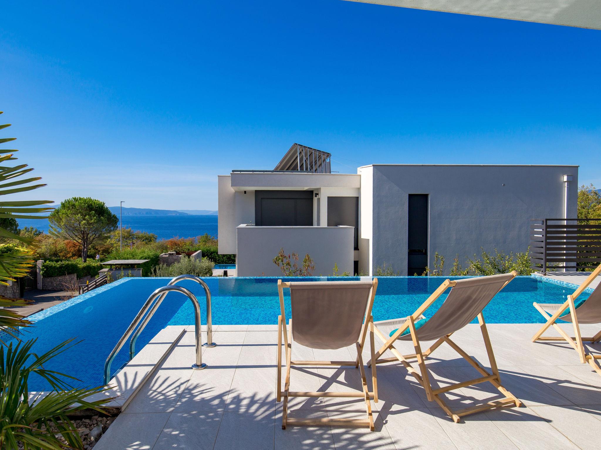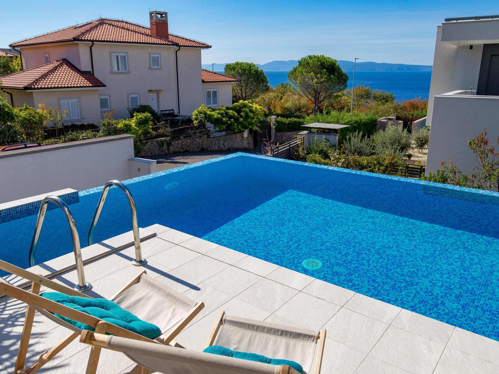 Villa "Albi", 3 storeys. In the district of Kostrena 5 km from the centre of Rijeka, in a quiet, sunny, elevated position, 250 m from the sea, 300 m from the beach, in the countryside. Private: property 603 m2 (fenced), swimming pool (25 m2, depth 150 cm, seasonal availability: 01.Jan. - 31.Dec.) with salt-electrolysis pool-cleaning system. Unconventional pool shape. Outdoor shower, barbecue. In the house: internet access, sauna, table tennis, table football, washing machine, tumble dryer. Available: bicycles (2). Parking (for 4 cars) at the house on the premises, single garage. Shop 1 km, supermarket 1.5 km, restaurant 250 m, bus stop 60 m, pebble beach, rocky beach 300 m. Groups of teenagers on request only. By groups of young people double deposit is requested on arrival. The house consists of 3 apartments rented as one unit. Each apartment with external and separate entrance. Organizing a party is not allowed. Dog beach 800 m.